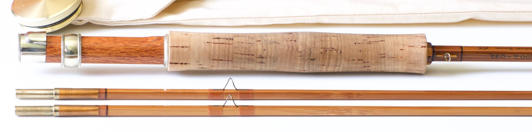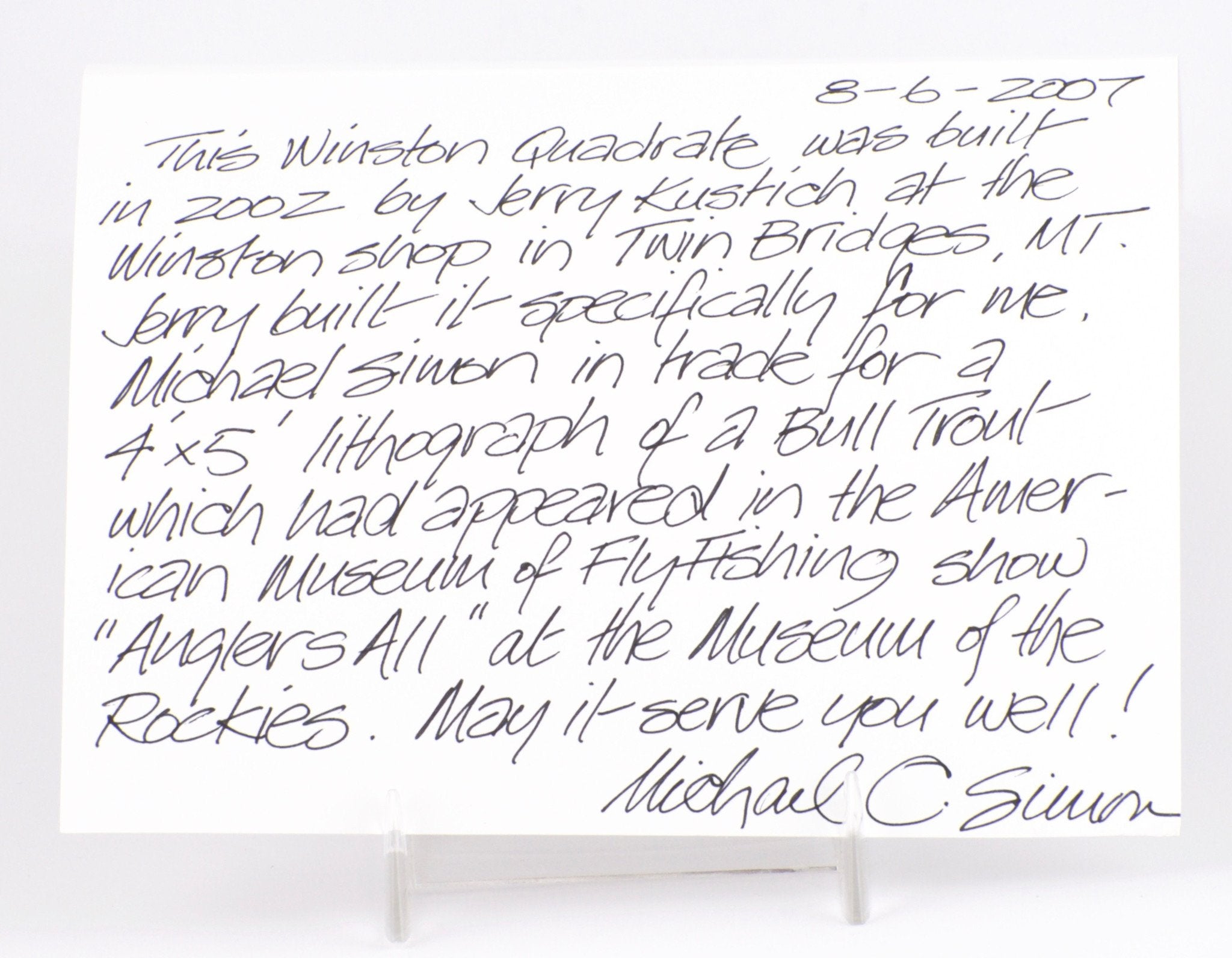 For sale here is a Jerry Kustich (of R.L. Winston and Sweetgrass fame) Quad 7'9" 4-5wt bamboo fly rod made for my friend and highly acclaimed artist, Michael Simon. Two sections with two tips. The rod is in excellent plus original condition. Honey colored silks that extend up the female ferrule and dark brown tipping at the ferrules, tip-top, winding check and signature wrap. All sections are full length and straight. Agate stripping guide. Wells grip is lightly soiled. Nickel silver sliding band reel seat with wood spacer. The ferrule fit is excellent. The rod has a medium-fast dry fly action well suited for a DT4 or a WF5. Serial number 2002-032. Ferrule size 13/64. The rod weighs 3.55 oz and comes with original Winston bag and unlabeled brown powder coated tube.
