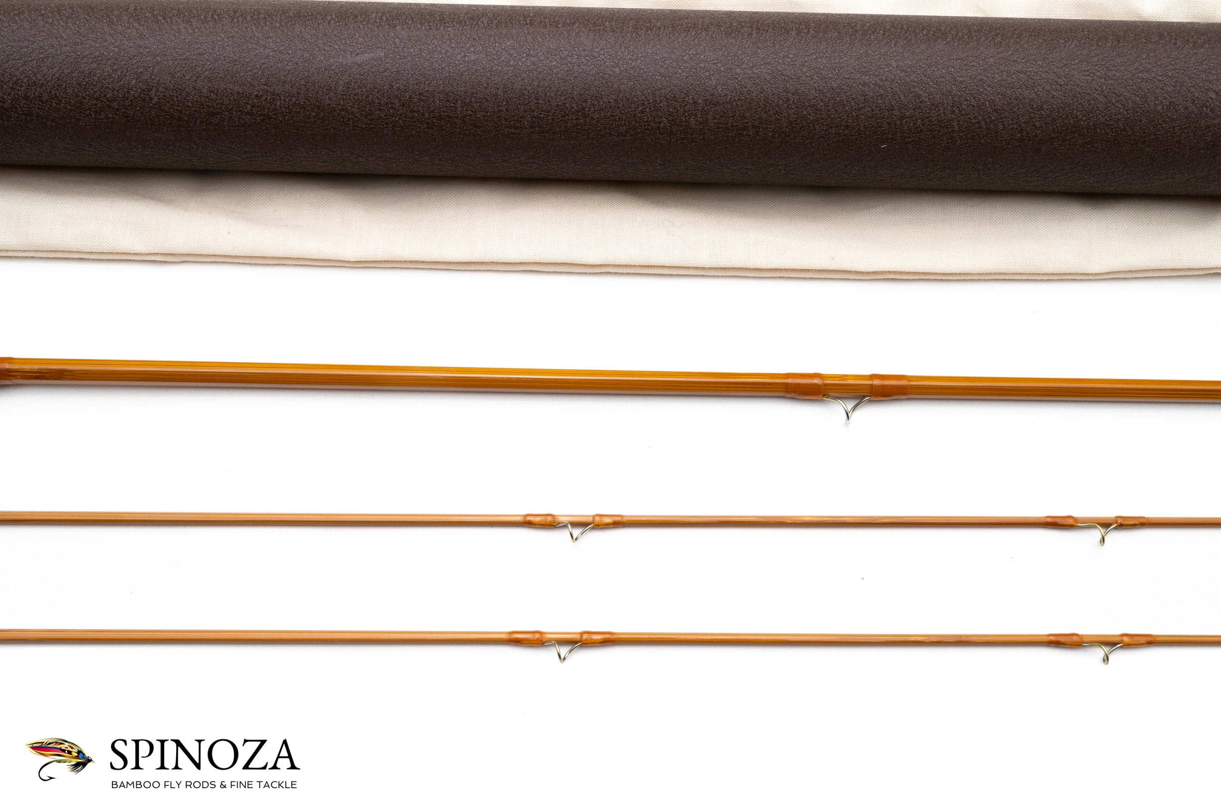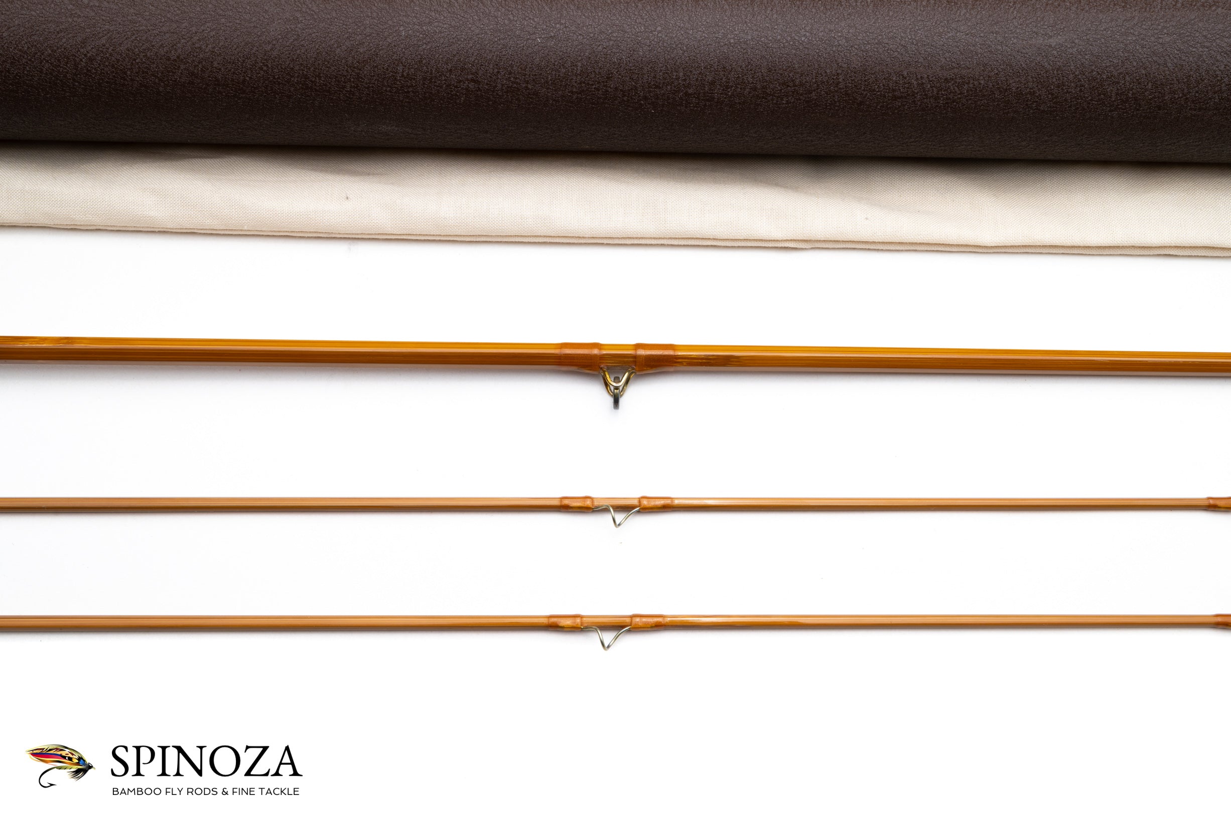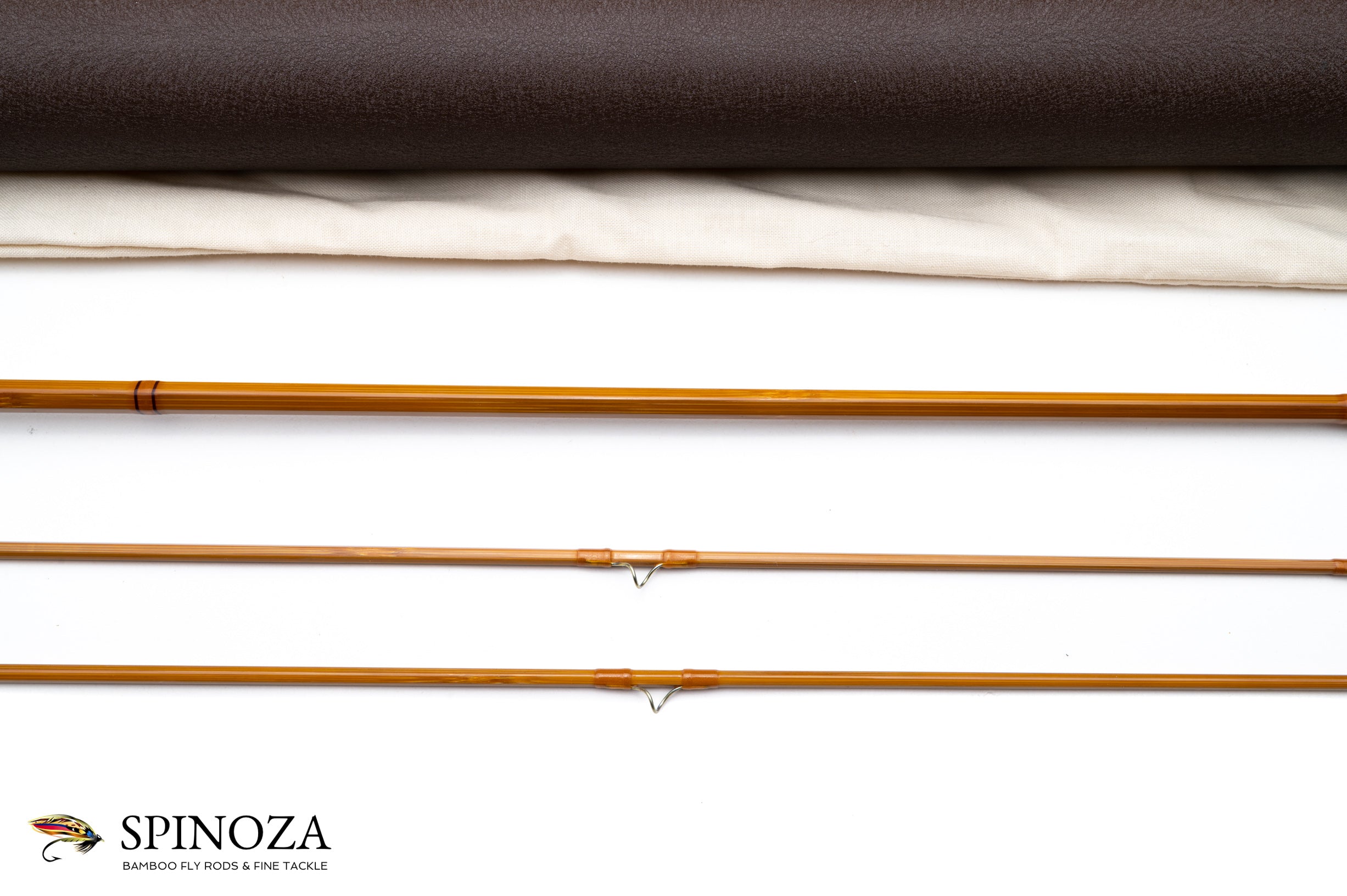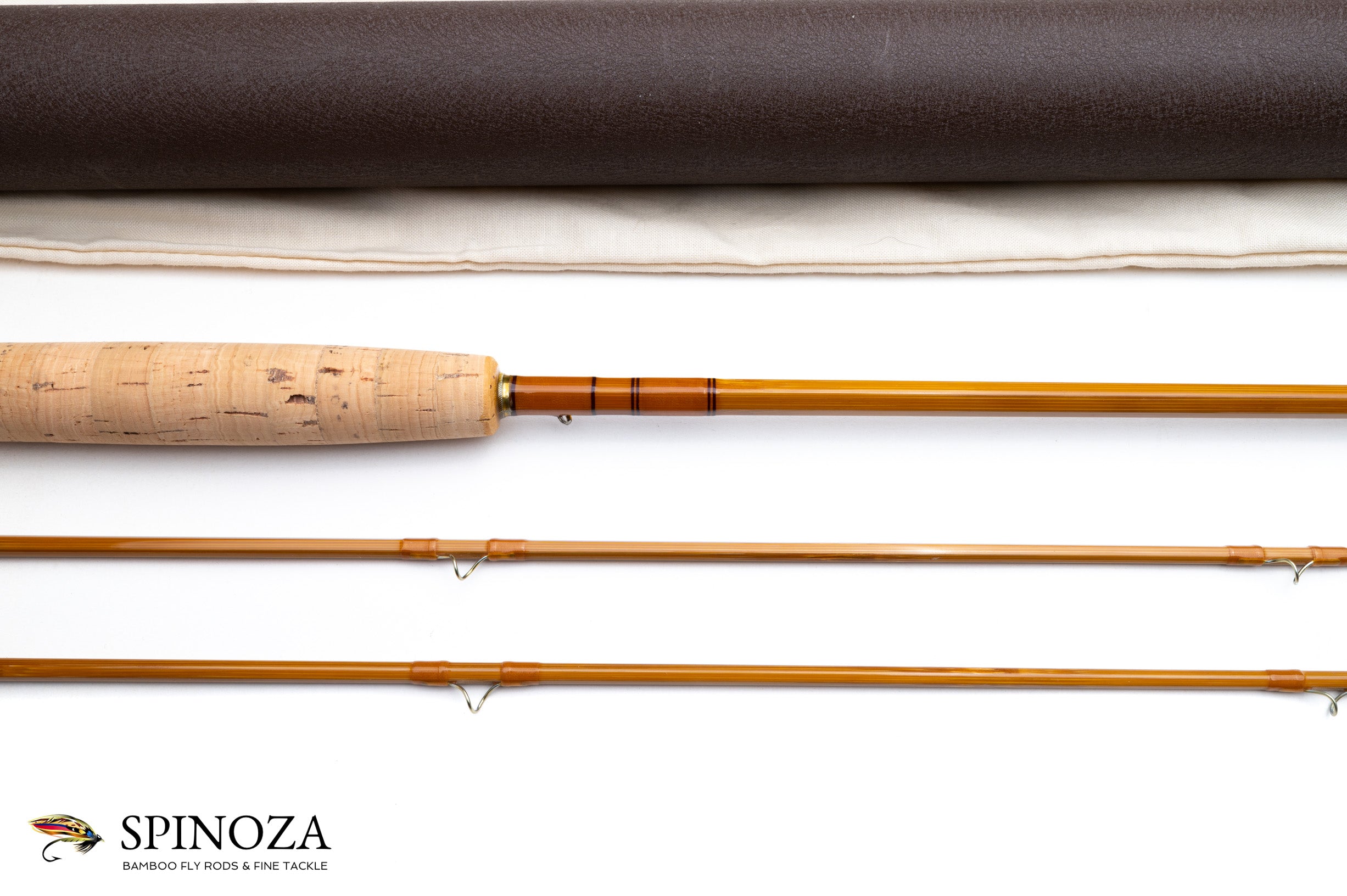 A nice RL Winston bamboo fly rod, 7'6", 2-piece, 2-tip built for a #4 line. Serial #2553. Glenn Bracket era rod. Pleasing medium fast action. Excellent, very lightly used condition, it certainly does not appear to have been fished much. Medium wheatstraw cane done in a three up node pattern construction. Very nice varnish throughout, with just one tiny cosmetic blemish on the varnish on the female ferrule which came from use. Honey colored wraps including the standard Winston overwrap on the ferrules with black tipping at the keeper, ferrules, and tip tops. Bronzed stripping guide and snakes with chrome tip tops. Medium lightly shaped cigar grip with an ever-so-slight flair at the heel, and the consignor noted to me that this grip was recently replaced by Glenn himself. The ferrule fits are good and the rod is nice and straight. Aluminum screwlock downlocking slide band seat with a pocket cap which has the RL Winston logo engraved on the bottom. The rod packs into a cream colored bag with the Winston logo, and a green crackle paint aluminum tube with brass fittings.
