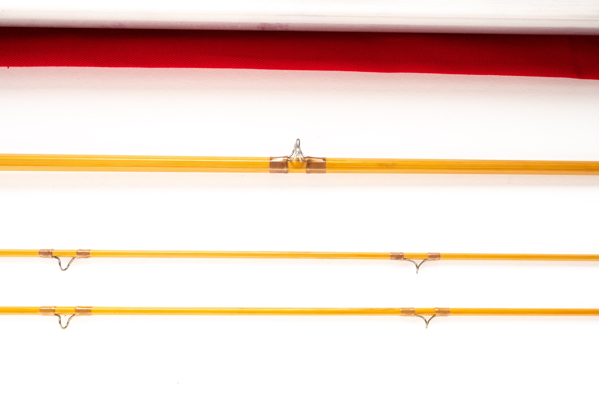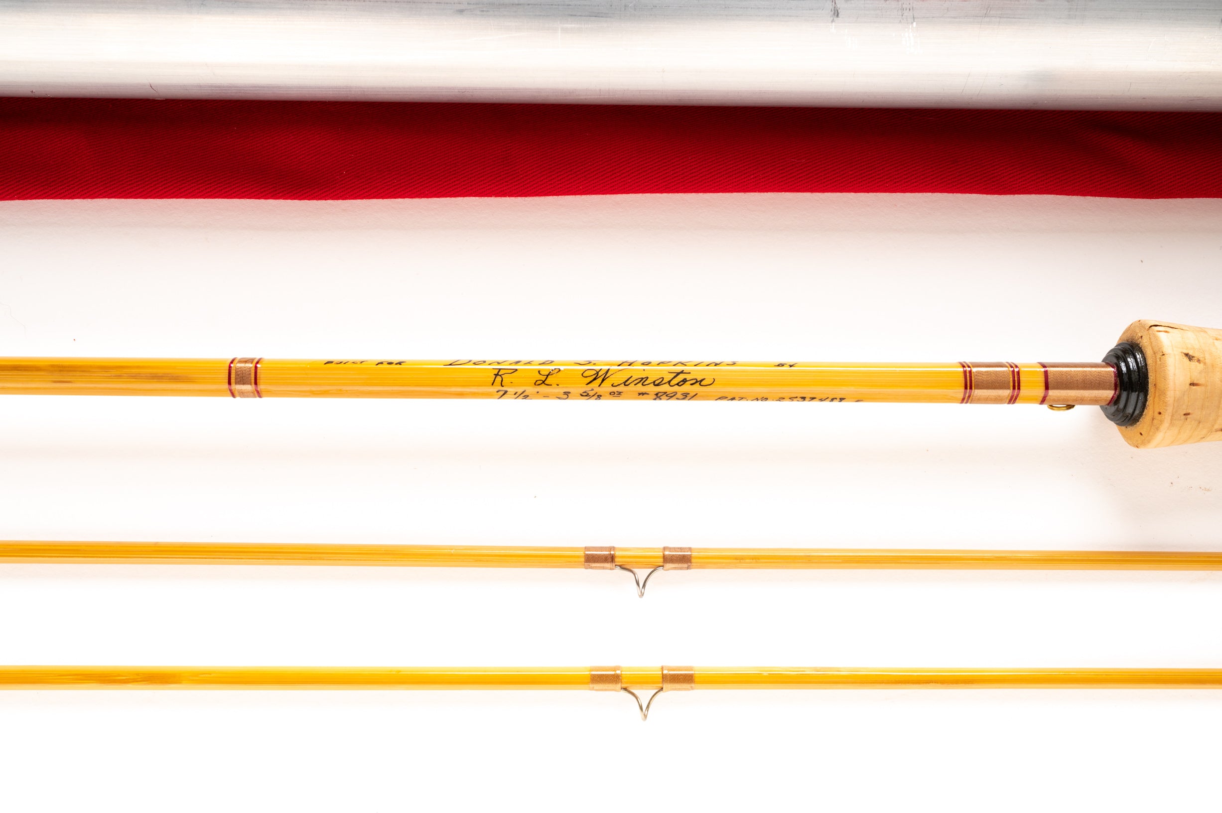 A superb RL Winston San Fransico Era fly rod, 7'6", 2-piece, 2-tip, and with stated weight of 3 5/8 ounces. Mint condition. Serial # 8931 and the patent date lettered on the rod, along with "built for" and the owner's name and the rod specifications. Mint condition, no brassing to the inner tip-tops, no hand soiling to the grip. Blonde cane in 3-up node construction wrapped in tan with maroon edges at the keeper, ferrules, and tip-top. The varnish is original and with no signs of wear, though it is not the best workmanship I have seen from this company. The ferrule fits are good and right with the full overwrap. The grip is 5 1/2" and done in a full well style. The downlocking screw lock seat looks like bakelite with a polished aluminum ring and a formed pocket cap on the bottom (the spacer had a small piece of tape with the owner's name which is pictured here, though we have subsequently removed it). The rod is as straight as the day it left the shop. The rod bag is red cloth with the Winston logo and a leather pull tab. Cal Air tube with 100% of the original Winston sticker still intact.