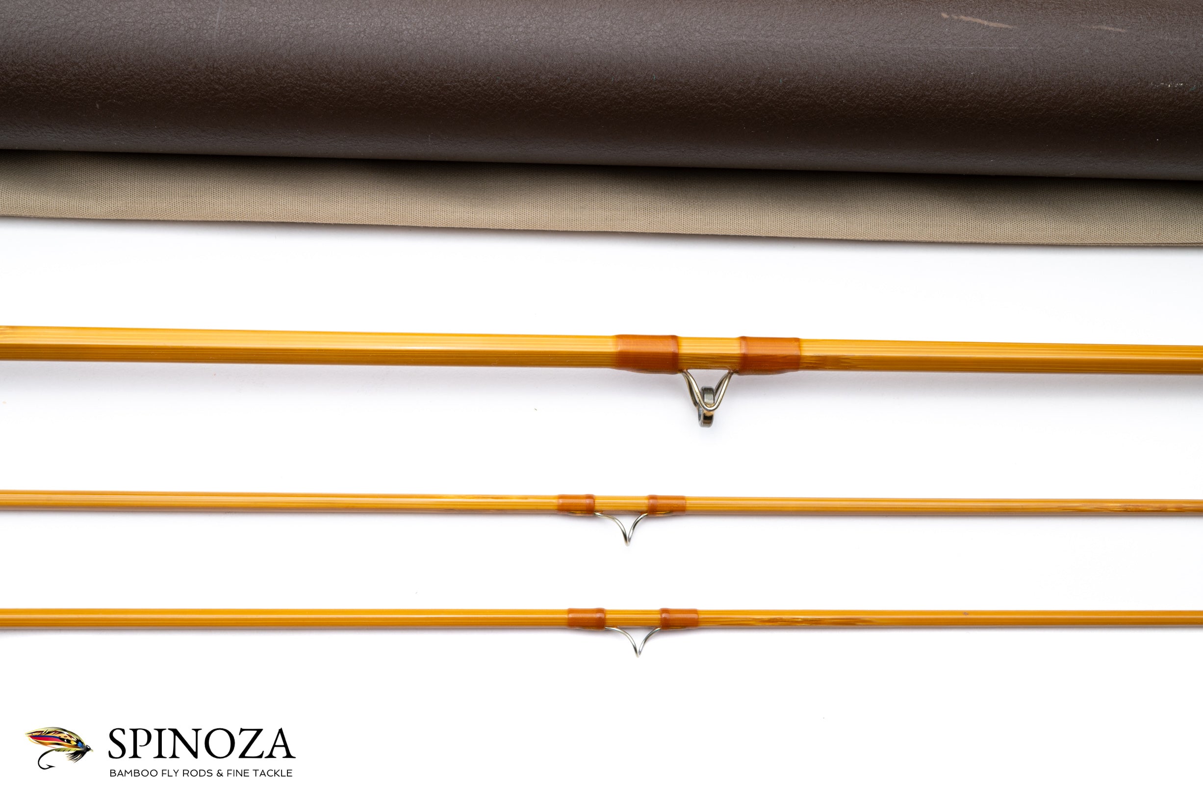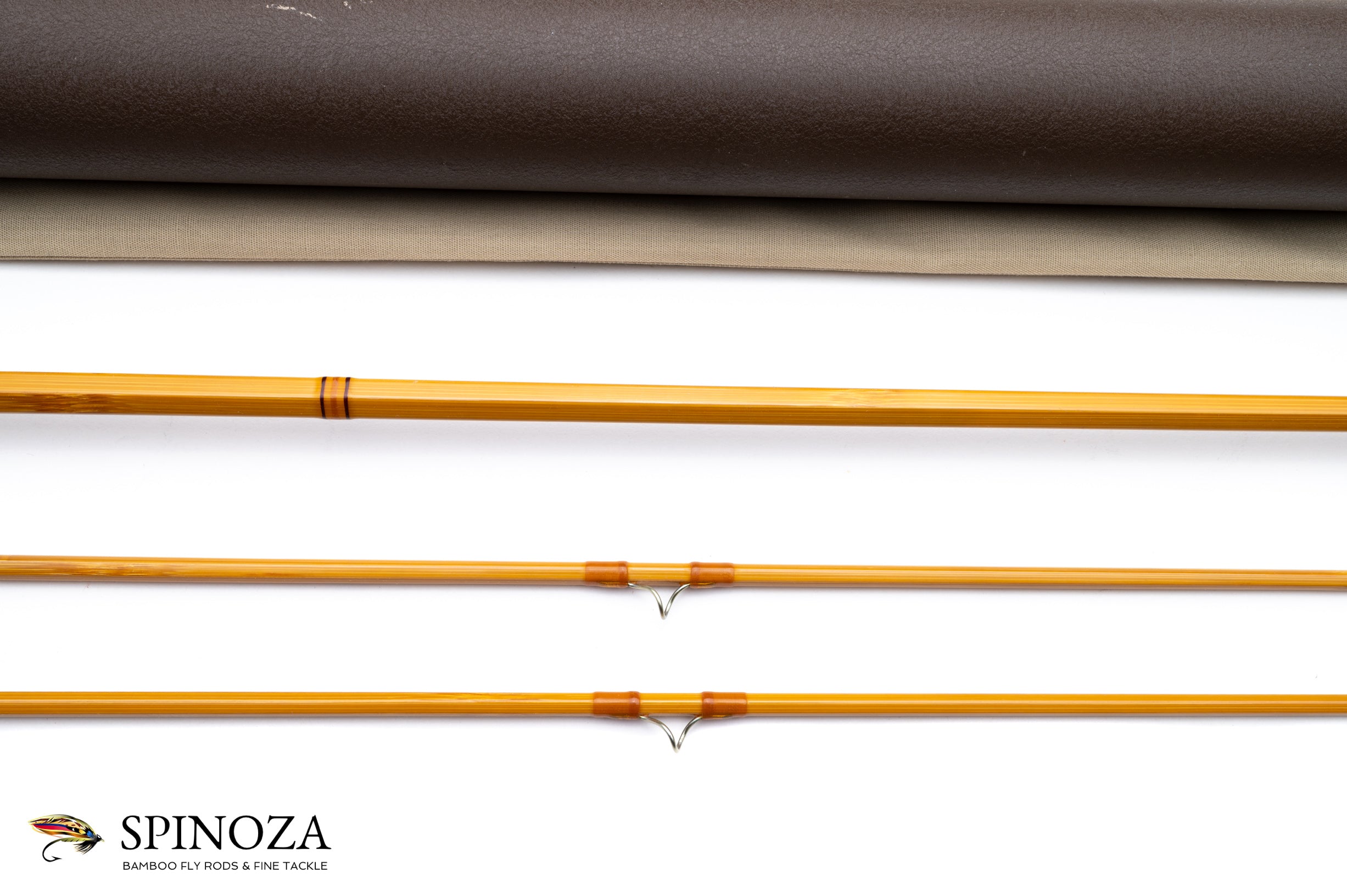A nice R.L. Winston bamboo fly rod, 8’, 2-piece, 2-tip, and built for a #6 line. Serial #3618. The rod weighs 4.4 ounces on my scale. Very modest use, slight hand soiling on the grip, and just the start of casting cracks at the ferrule wraps. Nice feeling DF action. Medium wheat straw color cane with 3-up node pattern. The varnish is superb. Light brown main wraps with cinnamon edges at the keeper, ferrules, and tip tops. Carbide stripper and chrome snakes. The ferrule fits are plenty tight and this rod is factory straight. The grip is 6" long and shaped to a Western profile. The reel seat is a downlocking nickel silver screwlock with a pared off slide and a pocket cap. The bottom of the cap is engraved with a Winston logo: “R.L. Winston Rod Co” in an oval cartouche. The rod packs into a tan colored bag and the aluminum tube is brown crackle painted with the Twin Bridges, Montana data plate.