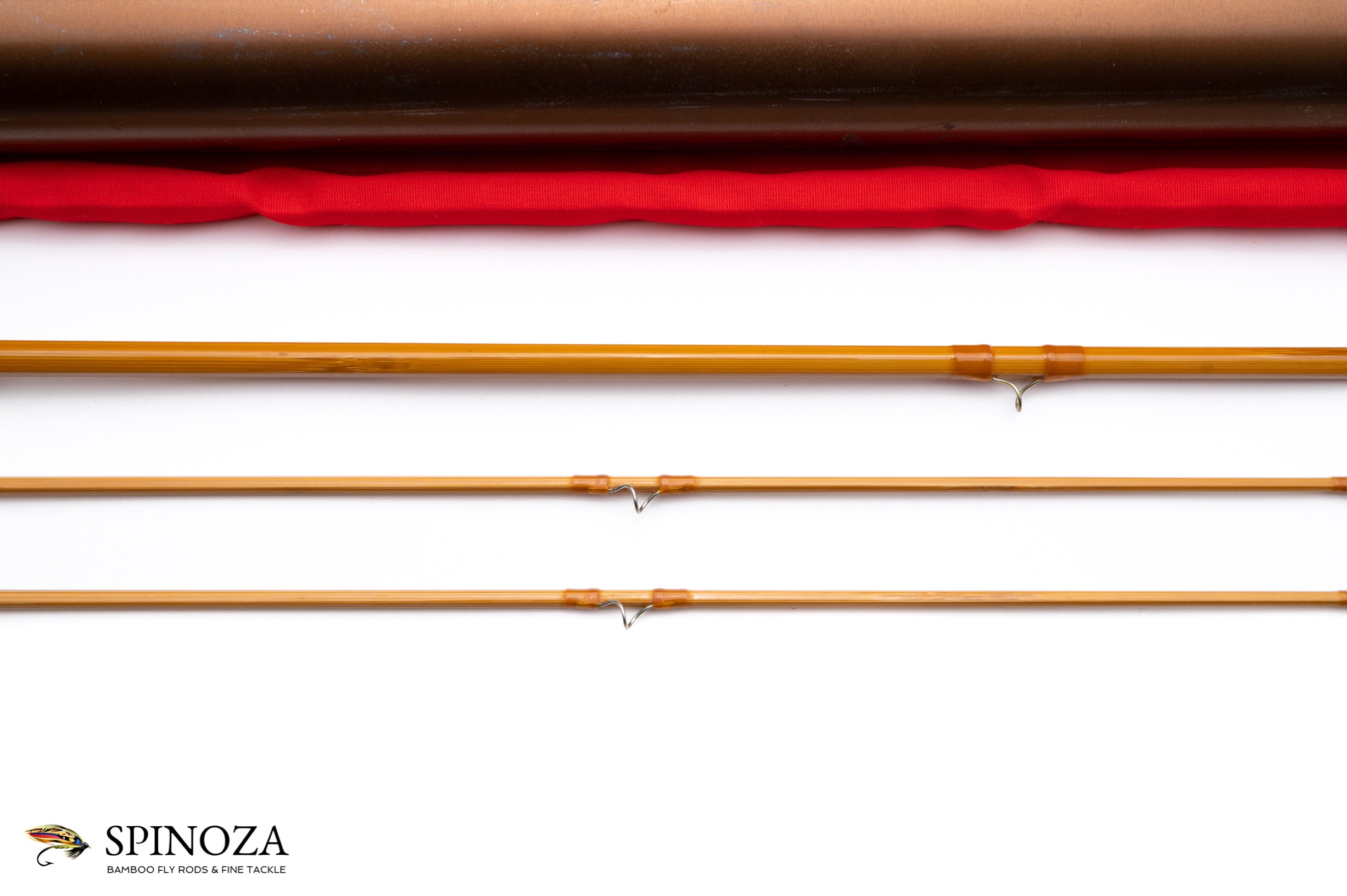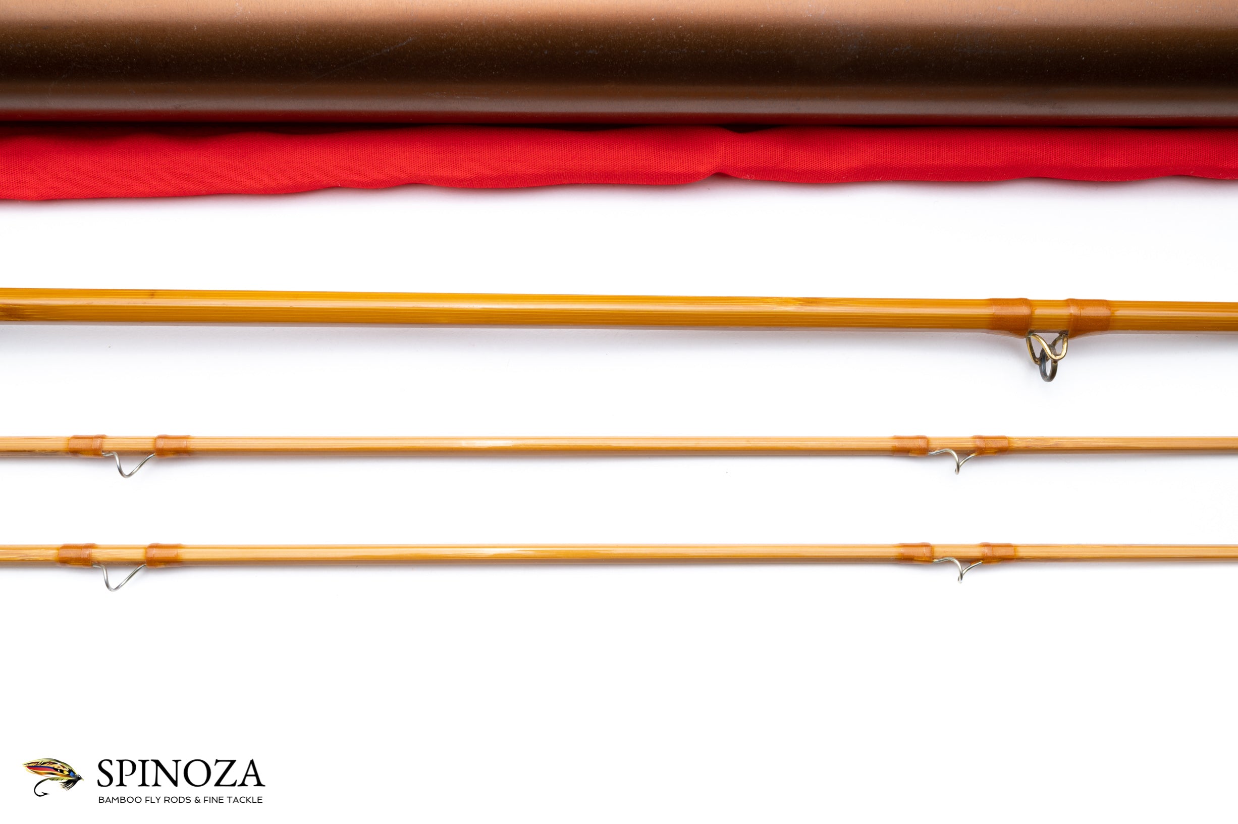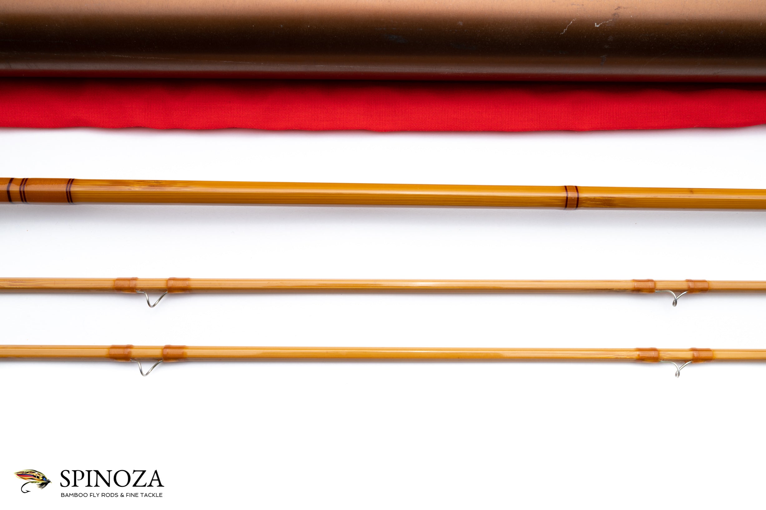 An excellent RL Winston Bamboo Fly Rod, 8, 2-piece, 2-tip, built for what feels to me like a #5 or a #6 line. "RL Winston" and "8' 4 oz #2003" lettered on the shaft. Weighs 4 ounces on my scale. Medium semi full flexing action. Excellent, lightly fished and well cared for condition. The ferrule fits are perfect, and one tip is straight while the other could use a very minor bit of straightening. Light, honey-colored cane done in a three up node pattern construction. Nice varnish throughout. The chromes plated guides are wrapped orange with dark maroon tipping at the keeper, ferrules, and tip tops. The durabronze ferrules have the characteristic Winston overwrap done in a handsome copper color. The grip is 13 corks and 6 1/2" long, done in full wells style, with some light hand soiling and minor ridging. The reel seat is an aluminum downlocking screwlock with a pocket cap over a nicely varnished wood spacer. The rod packs in a bright orange bag with the Winston logo and a dark copper colored aluminum tube with brass fittings and the Winston logo sticker intact.