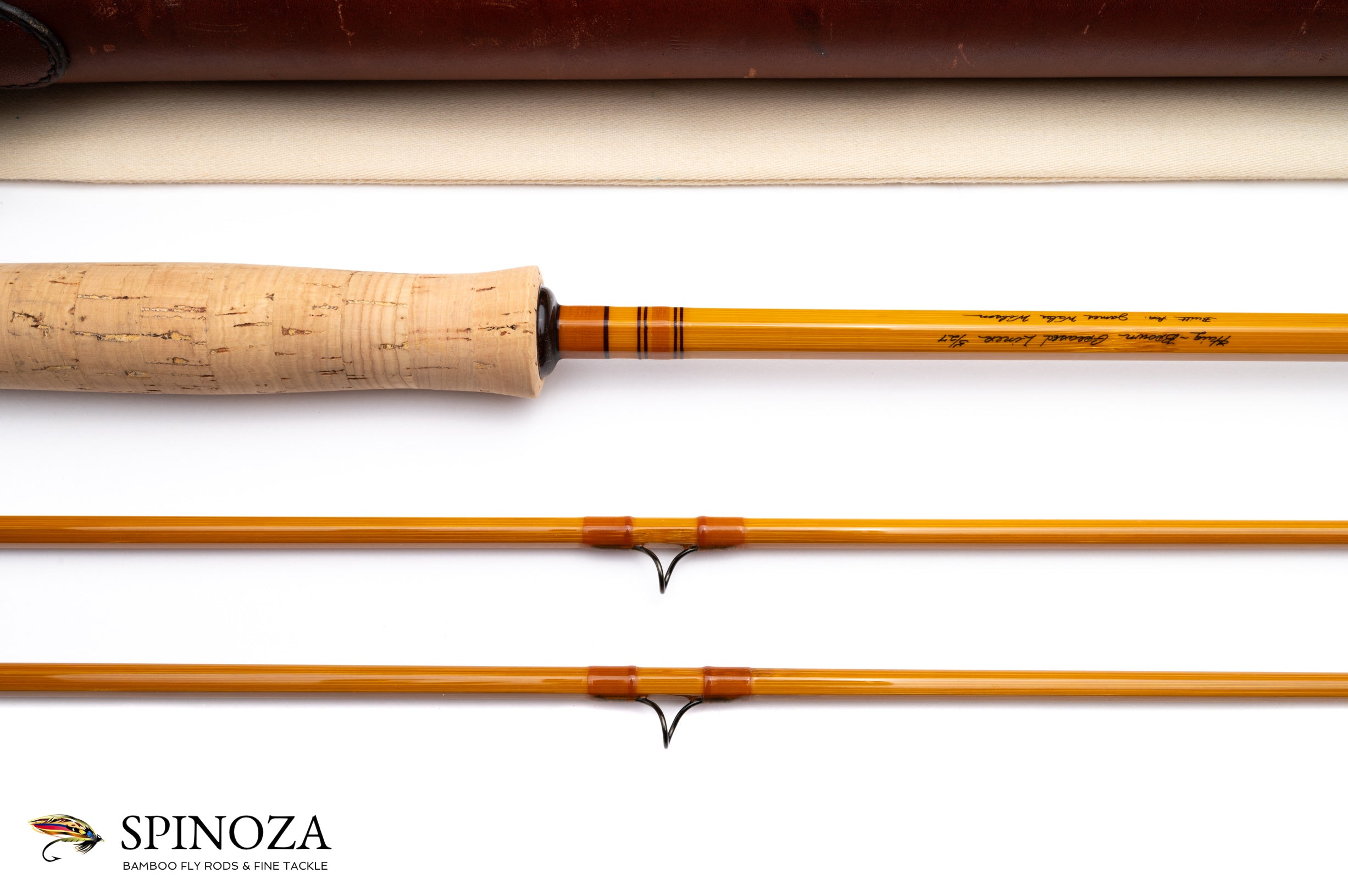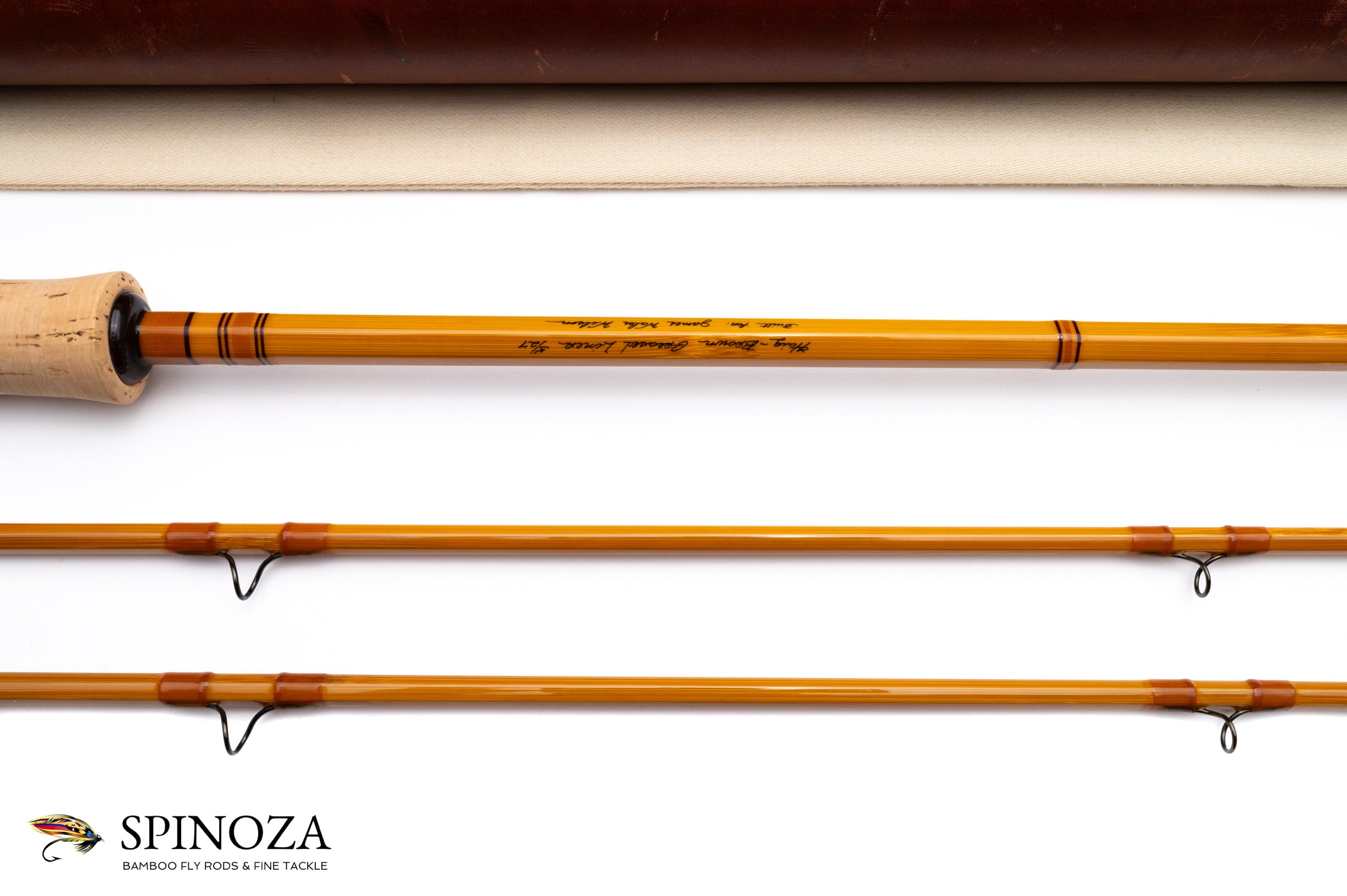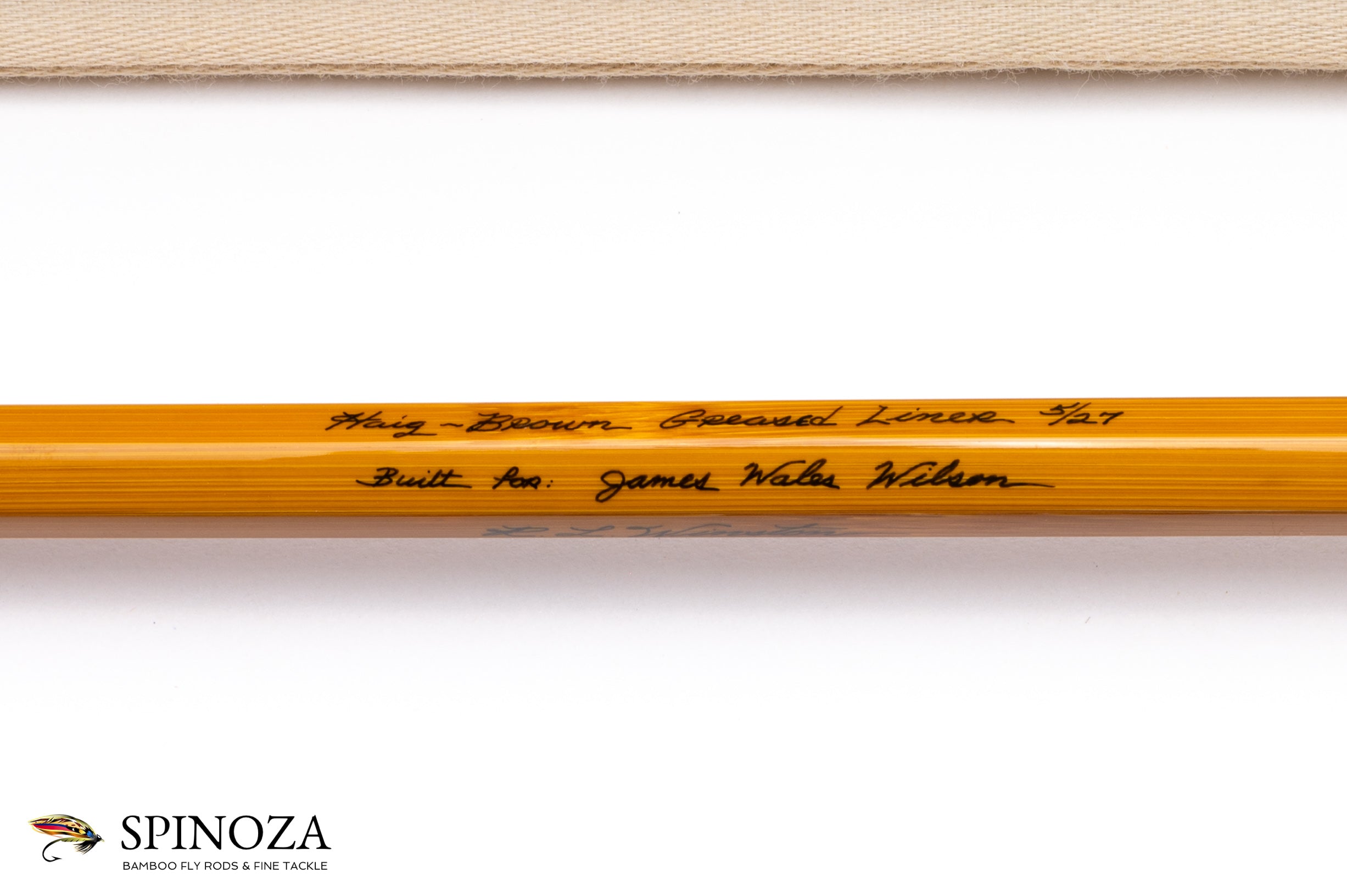 A very nice RL Winston Haig Brown "Greased Liner" Commemorative bamboo fly rod, 9', 2-piece, 2-tip, built for a #7 or #8 line. Serial 3104 and number 5 of the 27 of these words that were built. 5.9 ounces. Mint, unfished condition. At one point the agate in the second stripping guide had come loose and was so the guide was replaced at the Winston factory. Medium fast action. Medium wheat straw temper cane done in a three up node pattern. Apricot main wraps with maroon edges at the keeper and male ferrules. Agate stripper. Superb varnish. The grip is 7" long and turned to a full wells with a hidden pocket cap. Uplocking screwlock done in nickel silver. There is a 1" long walnut button at the bottom which has an engraved plaque with the Haig Brown serial number. The Winston logo rod bag packs into a leather rod tube.