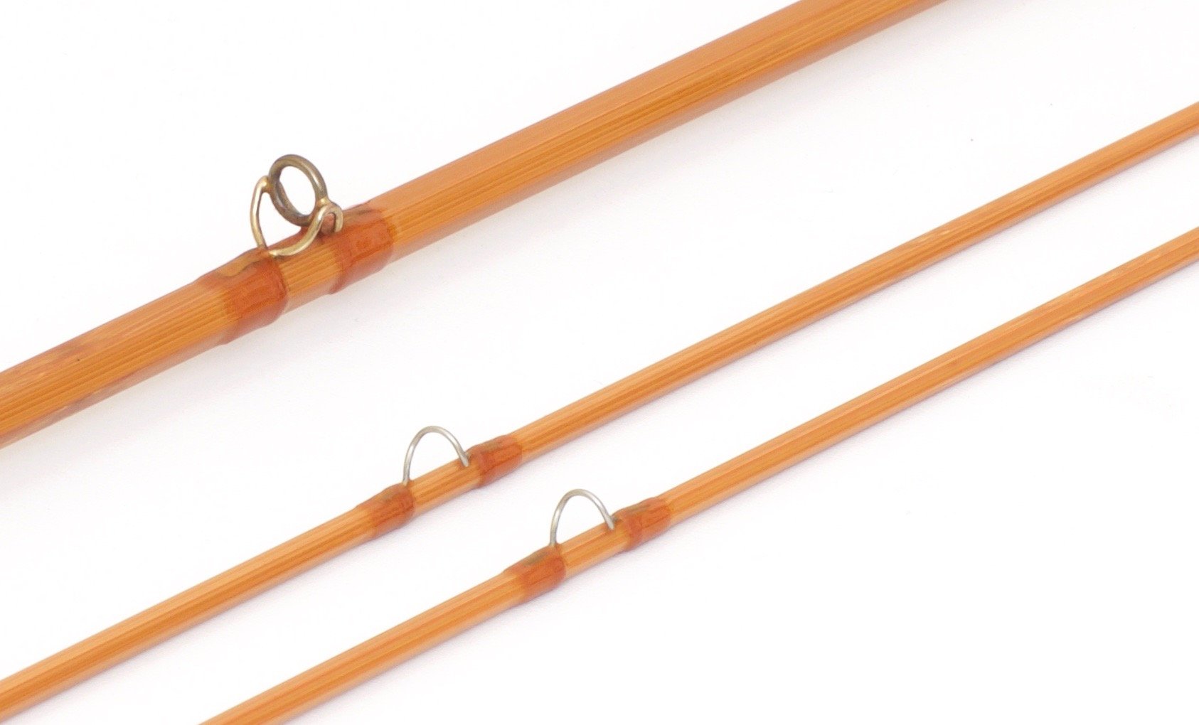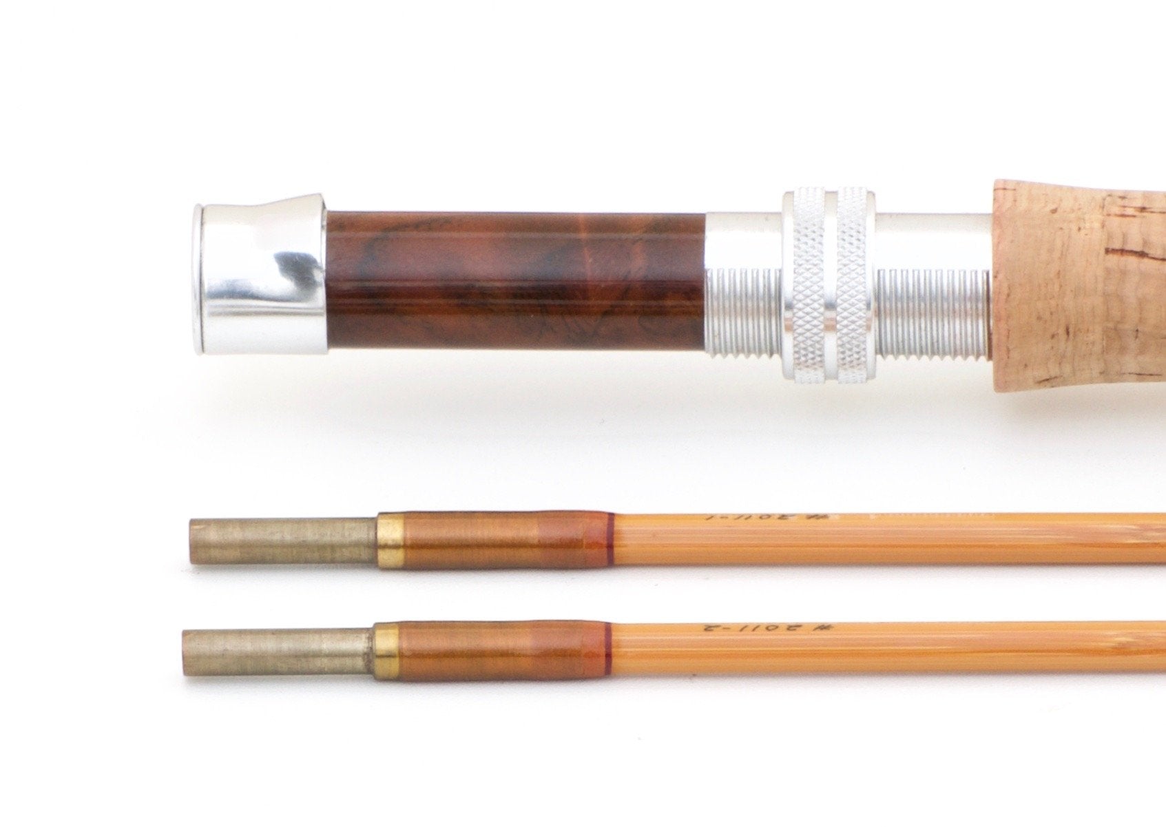 The rod features a light cane finish with honey wraps and burgundy tipping at the winding check, signature wrap, ferrules, and tip-tops. Bright guides. The script remains as clean and bold as the day it was written. The tips are marked with the serial number as well as numbered. Bronzed ring hook keeper. Full wells grip 6 1/2" in length with only the lightest of handling marks. Also, there is a faint red ring around the nose of the grip left from the red rod bag. Bright aluminum down-locking reel seat over a beautifully figured walnut spacer. The duronze ferrules are size 13/64 with an excellent fit. The rod weighs 3.90 oz. The action is a crisp and smooth medium-fast with great recovery.