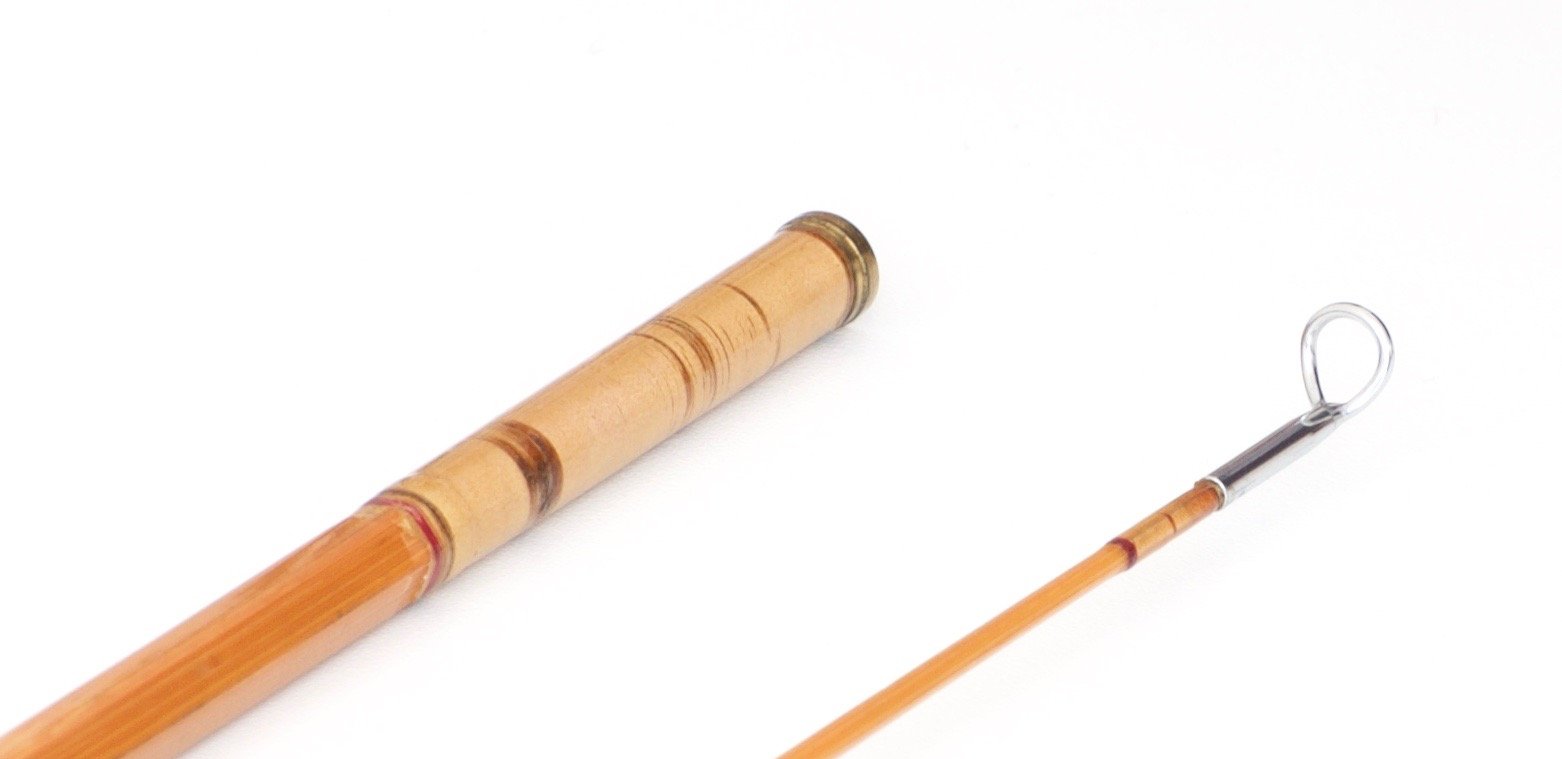 Bronze wraps and burgundy tipping at the winding check, signature wrap, ferrules, and tip-top. The script remains clean and bold. Bakelite winding check. Full wells grip 6" in length with moderate soiling. There is a bit of light ridging towards the top. Classic Winston Bakelite reel seat. There is a small crack in the collar above the cap. The Duronze ferrules are size 16/64 with a pleasing fit. The rod weighs in at 5.10 oz. on our digital scale. The action is medium-fast. Includes the original bag and tube with label mostly intact. Despite the issues, this is a great fishing rod ready for the water.