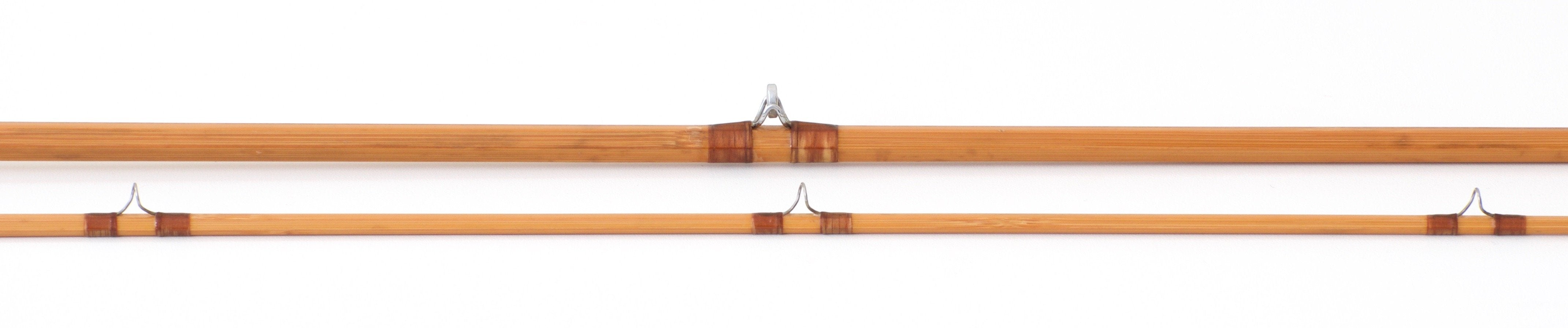 For sale here is a San Francisco-era R.L. Winston 9' 2/1 6-7wt bamboo rod with a marked weight of 5 oz. Serial no. 8509. Excellent- fishable condition. The rod at some time received a light varnish overcoat and the application seeped into the prior cracks in the varnish over the wraps and stained the wraps. This is only an aesthetic issue. The rod is full length with very slight sets in both sections (easily straightened).