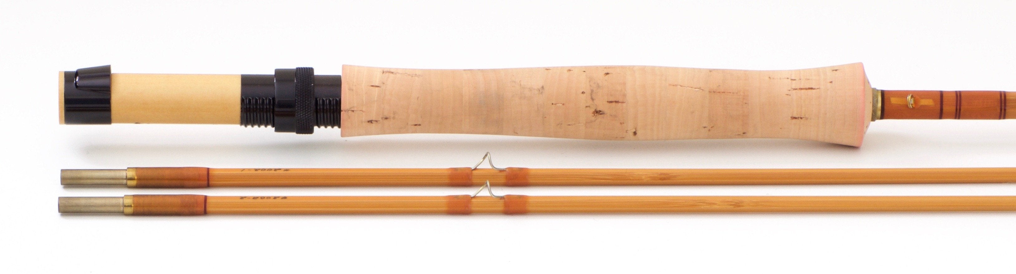 Serial #2002. The rod is in near mint+ original condition. All sections are full length and straight. Blonde cane with honey colored wraps, burgundy tipping at the winding check, ferrules, and tip-tops. Bronzed guides. The tips are numbered for convenience. Full wells grip 6 1/2" in length with only the lightest of handling marks. The top and bottom edge of the grip also have a red tint left from the red rod bag. Black aluminum down-locking reel seat with a stunning scrimshaw spacer depicting a brown trout rising to a mayfly. This was a $265 option in the 1983 Winston catalog.