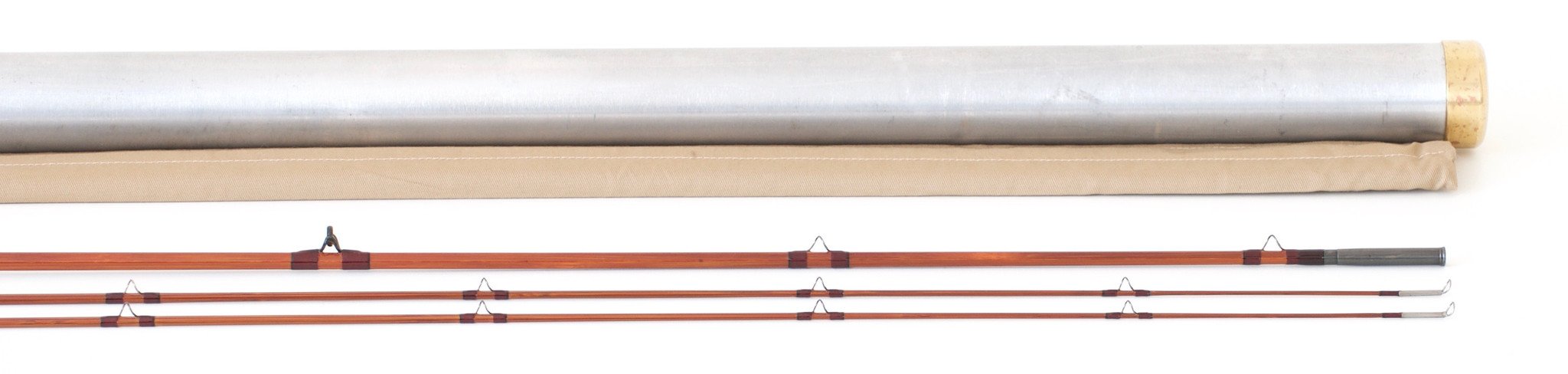 For sale here is an absolutely stunning Ron Kusse bamboo rod. A special order Mahogany - 7'6" 2/2 for a 5 weight line. The rod is in near mint original condition. The "Mahogany" label is defined from the stunning dark cane finish. Rich ruby wraps with black tipping. Blued hardware throughout with the exception of the bright tip-tops. Petite cigar grip. Elegant cap and ring reel seat with fine knurling. "Kusse" stamp on the buttcap. The spacer is fine mortised mahogany to match the dark cane finish. Swiss-style ferrules size 12/64. The fit is nice and tight as it should be. The rod's action is medium-fast but definitely not as stiff as some of Kusse's rods. The rod weighs 3 1/2 oz. Includes original bag with dowell stiffener and aluminum tube with fine brass fittings. "Kusse" stamp on the cap. Don't miss out on this wonderful rod especially suited for the dry fly.