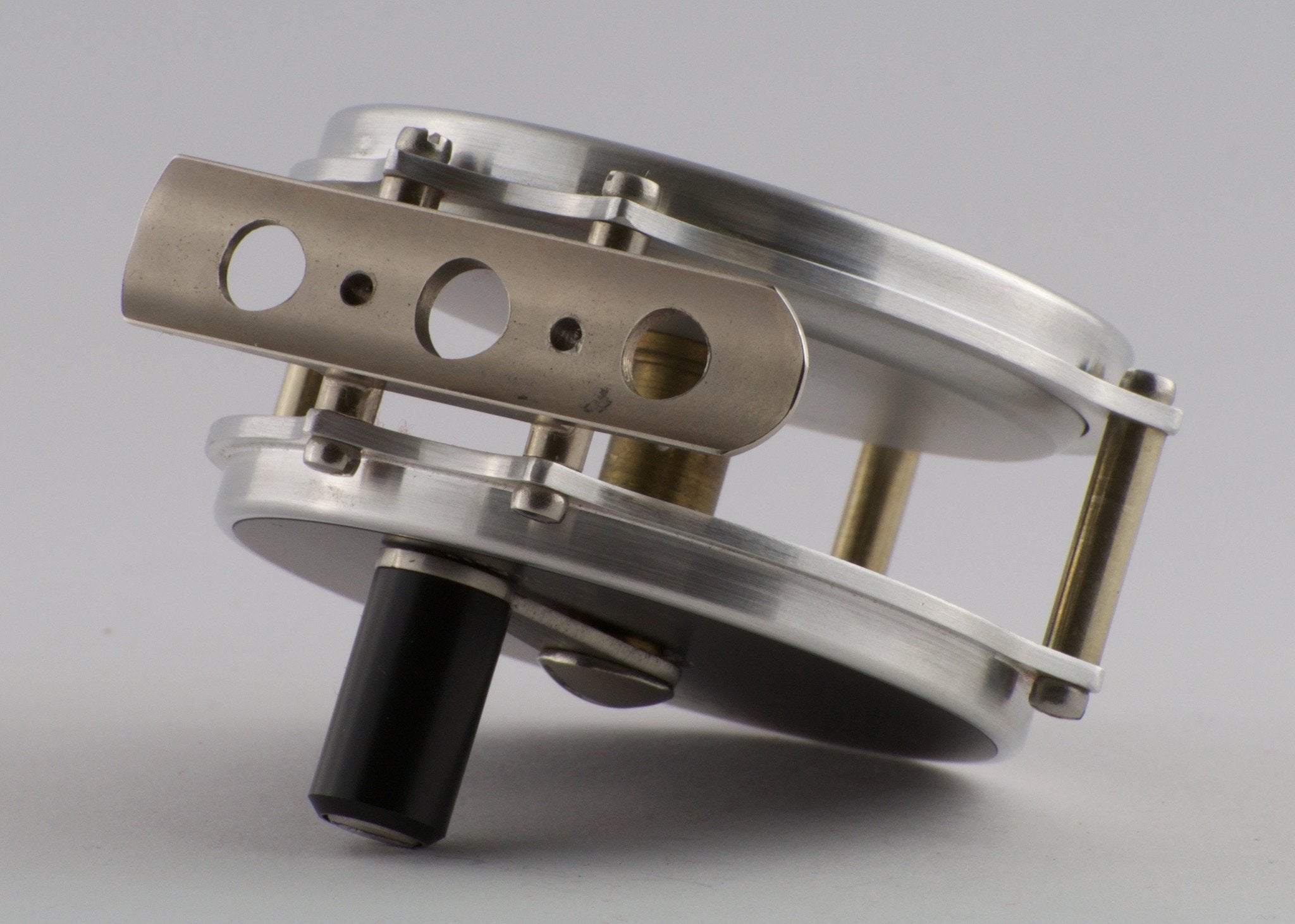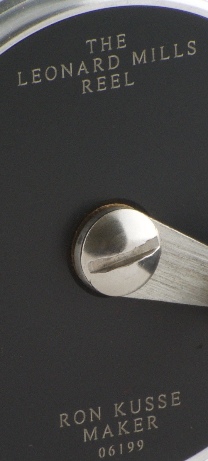 For sale here is a Leonard Mills Model 50 fly reel by Ron Kusse. Right of left hand retrieve. Made for 3-5 weight lines. Black sideplates, half handle, raised pillars, aluminum construction. New in box with labeled pouch and papers.