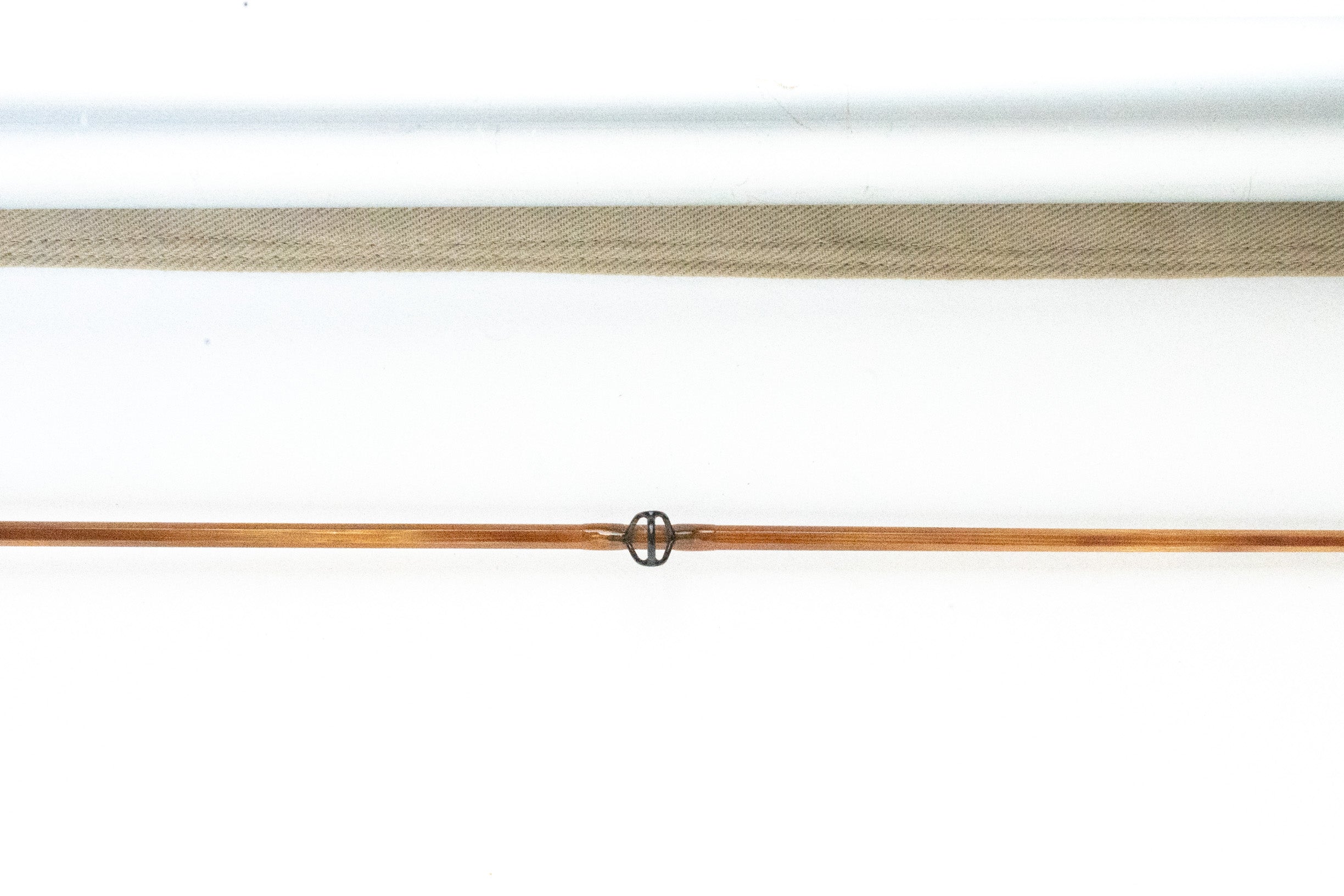 A fine Ron Kusse 5' one piece fly rod, built for a #3/4 line. Serial #9200. Fast action. Near mint condition. The only signs of use are some faint brassing to the inner snake guides, some slight reel foot and slide band impressions on the walnut reel seat, and a small scrape on the butt cap oxidation. Flamed cane with a three-up node pattern. The wraps are a light brown with five extra bands, maroon, black, brown, yellow, and maroon at the keeper wrap. The varnish is first-rate, just flawless. The grip and slide band seat are one piece of walnut turned to a slim cigar and varnished. The cap and ring are oxidized and the cap is stamped "Ron Kusse, Maker" in a cartouche. A tan cloth bag and hang tag comes with the rod. The hangtag states the weight of the rod as 1.5 oz. but my scale has it at 2.5 oz. The rod is packed in a frost coat aluminum tube with a brass top and bottom.
