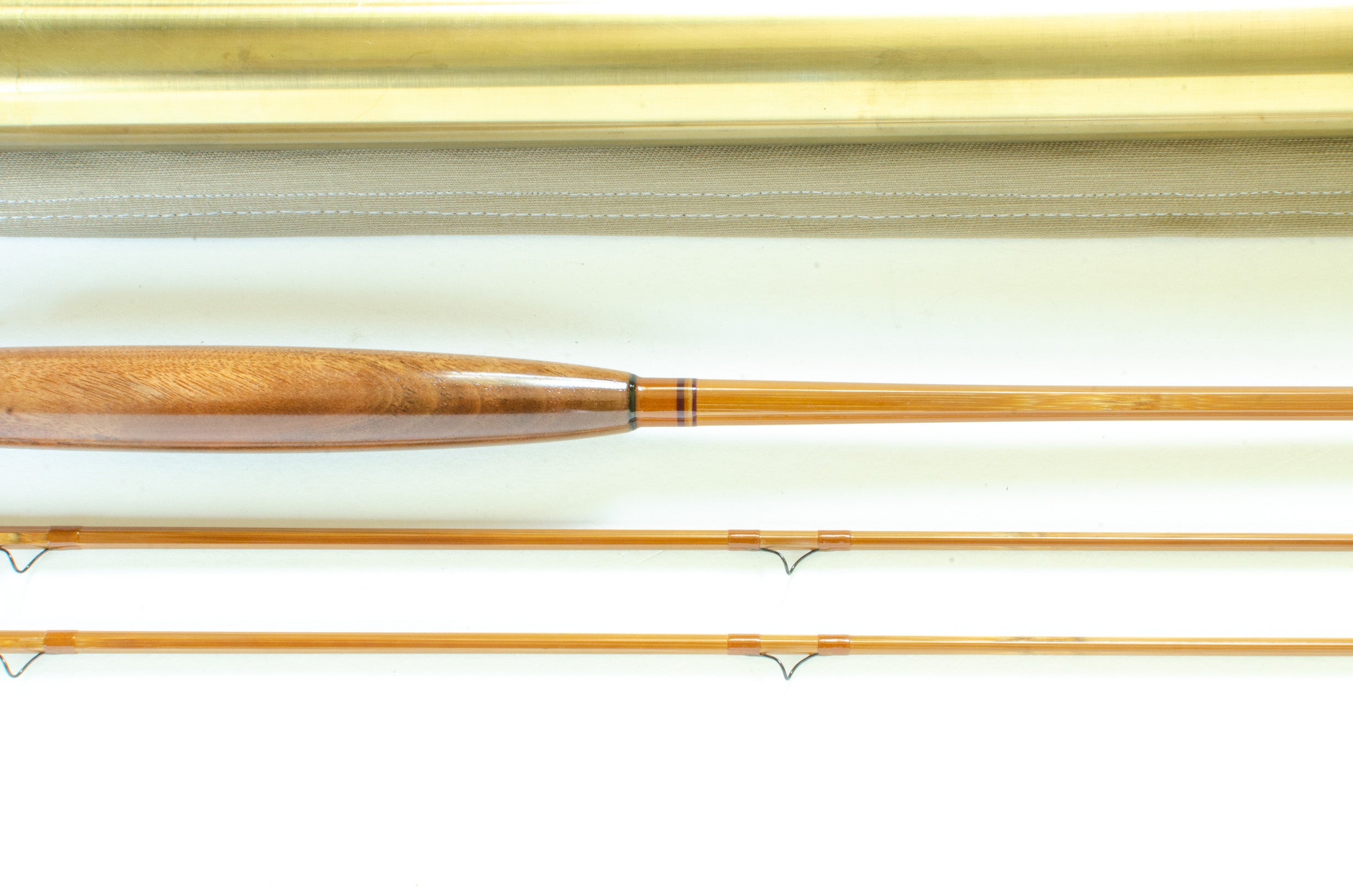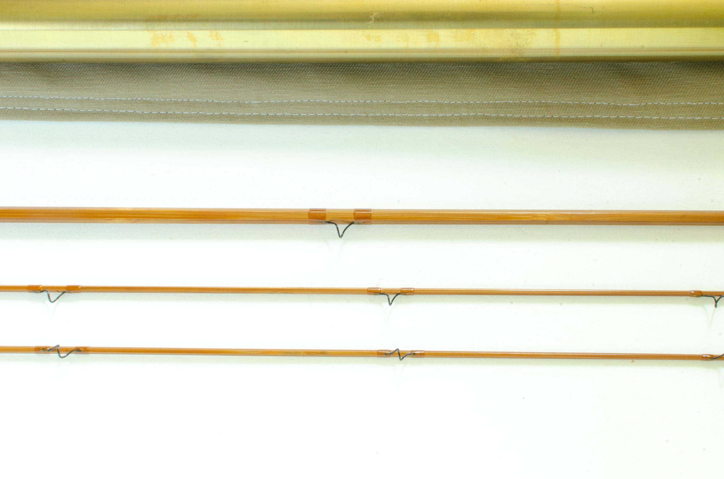 A nice Ron Kusse fly rod  7'6", 2-piece, 2-tips, built for a #4/5 line. Serial #9139. "Mirror tips" model. The hangtag states the weight as 3 3/4 oz but my scale has it at 4.5 oz. Fast DF action and in mint condition. This would appear to be the companion piece to our other listing, serial #9140, as both have one-piece varnished walnut grips and reel seats. Excellent varnish in a 3 up node pattern and a medium wheat straw temper color. Guide wraps are tan with maroon edges at the keeper, ferrules, and tip tops. There are 4 extra wraps at the keeper, purple, brown, tan, and maroon. The tips are mirrored.  The ferrules are Leonard step style and are oxidized jet black. The walnut grip is 5 3/4" long and turned to a slim cigar profile. The cap and ring seat is flatted, varnished Walnut and integrated into the grip. The cap and ring are oxidized and the cap bears the die stamp "Ron Kusse, Maker" opposite the wrap flat. The rod is packed in a cloth bag with Ron's hangtag. It comes with a spectacular all-brass tube.