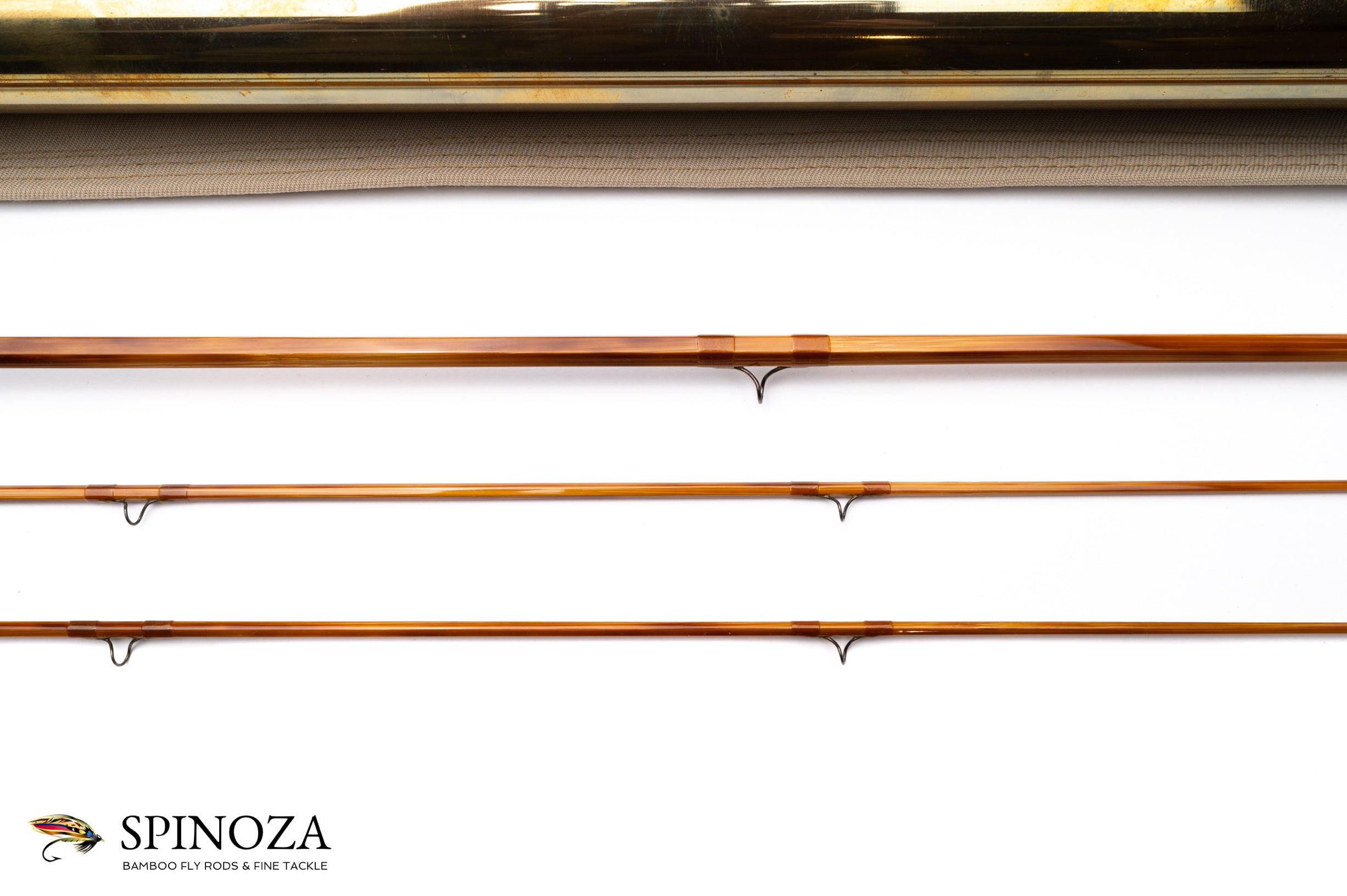 A Ron Kusse "Performance" model bamboo fly rod, 8', 2-piece, 2-tip, and built for a #6 line. The rod weighs 4.7 ounces on my scale (the weight listed on Ron's hang tag states it as 3 3/4 ounces). Near mint condition, and probably used a half dozen times or so judging by the ring marks on the seat. There is just the tiniest hint of casting cracks at the ferrule wraps and one tiny spot of brassing on the ferrule welt. Very nice condition overall. Powerful fast action rod. The varnish is perfect and in pristine condition. The cane is flamed and the nodes are done in a three up pattern. The wraps at the ferrules, keeper, and tip tops are brown with light tan on the black SRMC stripper and black snake guides. Mirrored tips. The grip is 6 1/2" long and shaped to a finely tapered cigar that almost touches the large swell. A lip from the mahogany slide band reel seat acts as the rear cork check. The nickel silver slide band and butt cap are both oxidized. The butt cap is die stamped with "Ron Kusse, Maker" in a cartouche. The rod packs into a cloth bag with Ron's hang tag attached and the rod tube is solid brass.
