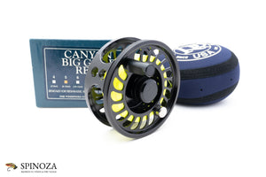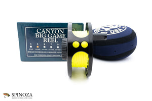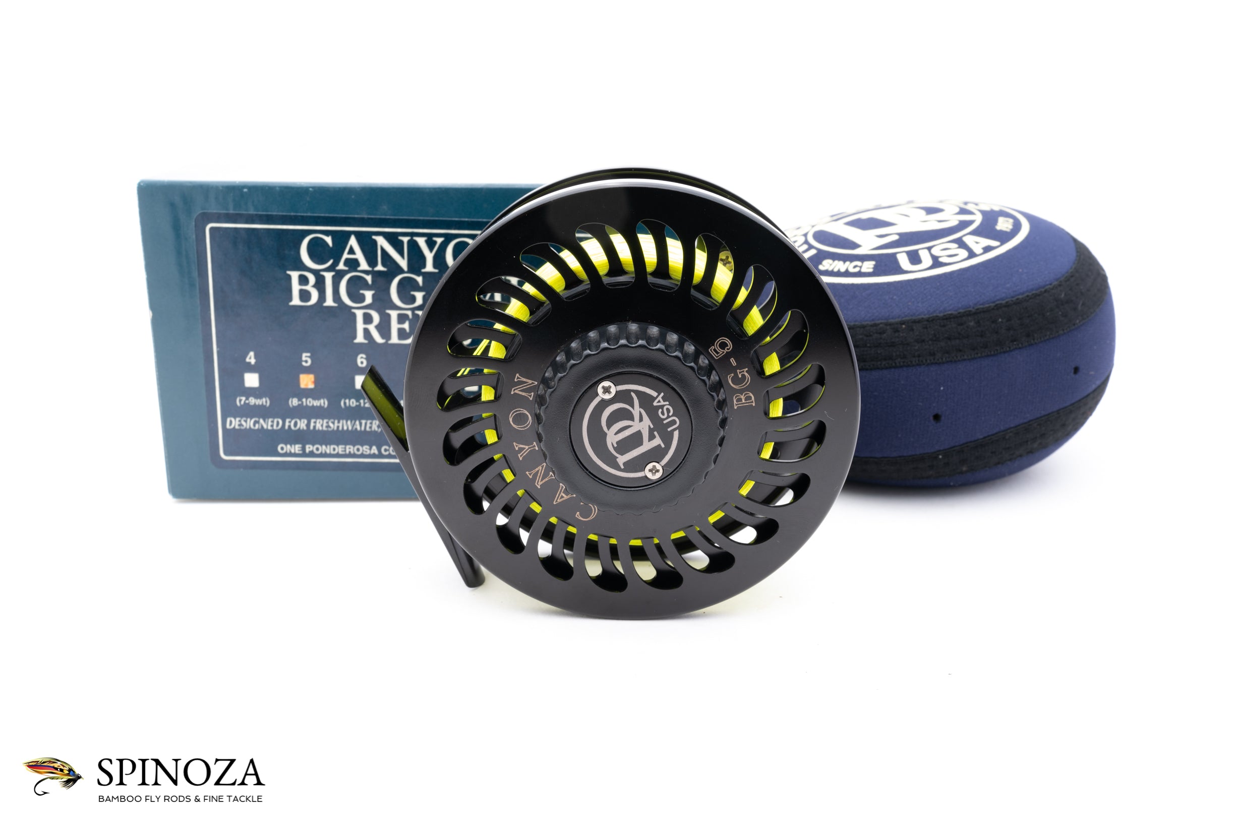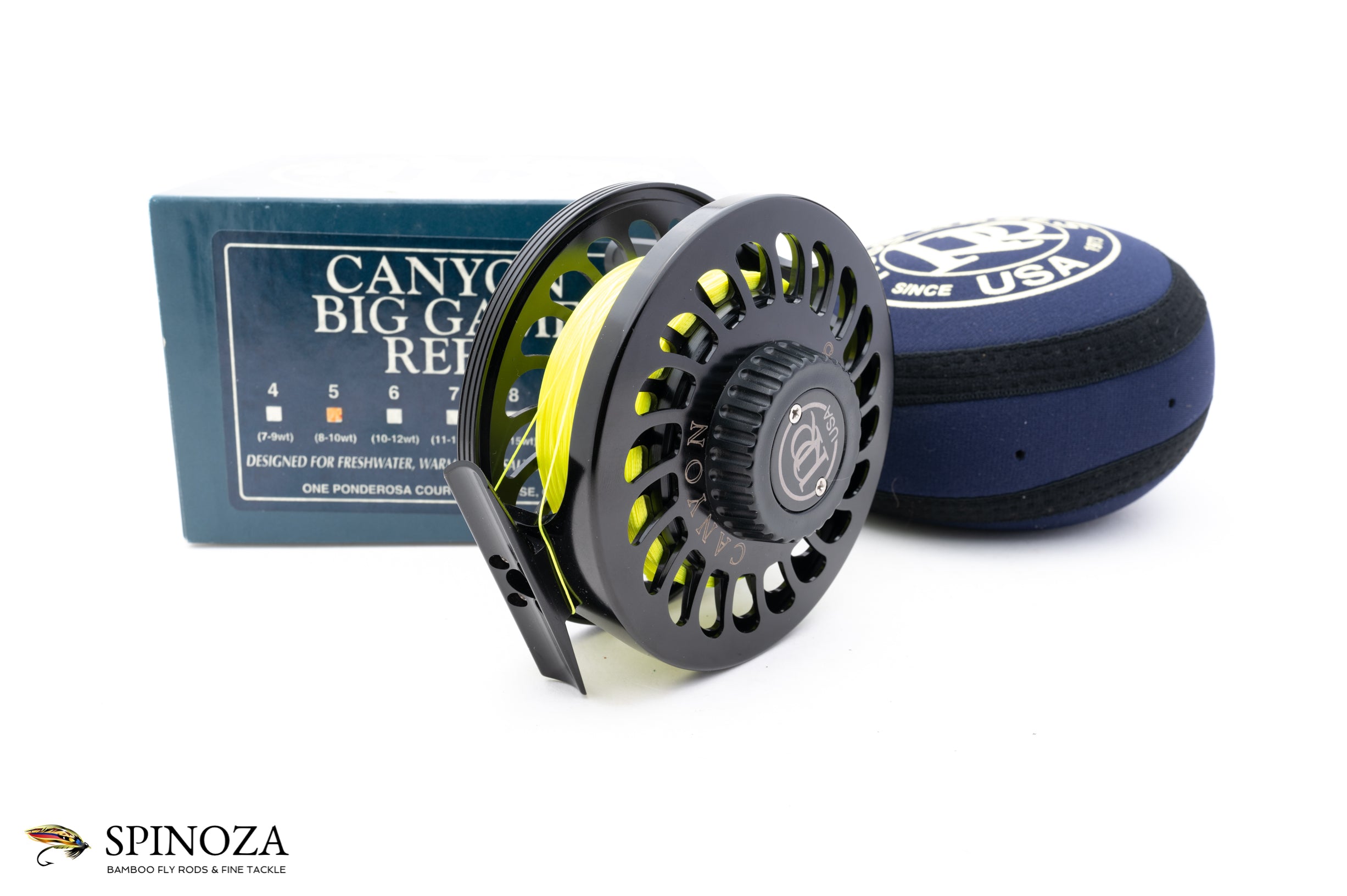 A Ross Canyon Big Game 5 fly reel, set up for LHW. 4" diameter with a 1.10" spool width and a catalog weight of 8.6 ounces. Black anodized with a large arbor design and a powerful, adjustable drag. This reel has had backing put on it but doesn't appear to have been fished. Capacity for a WF9 with 200 yards of 30# backing. Comes in the original Ross neoprene pouch and box with paperwork.