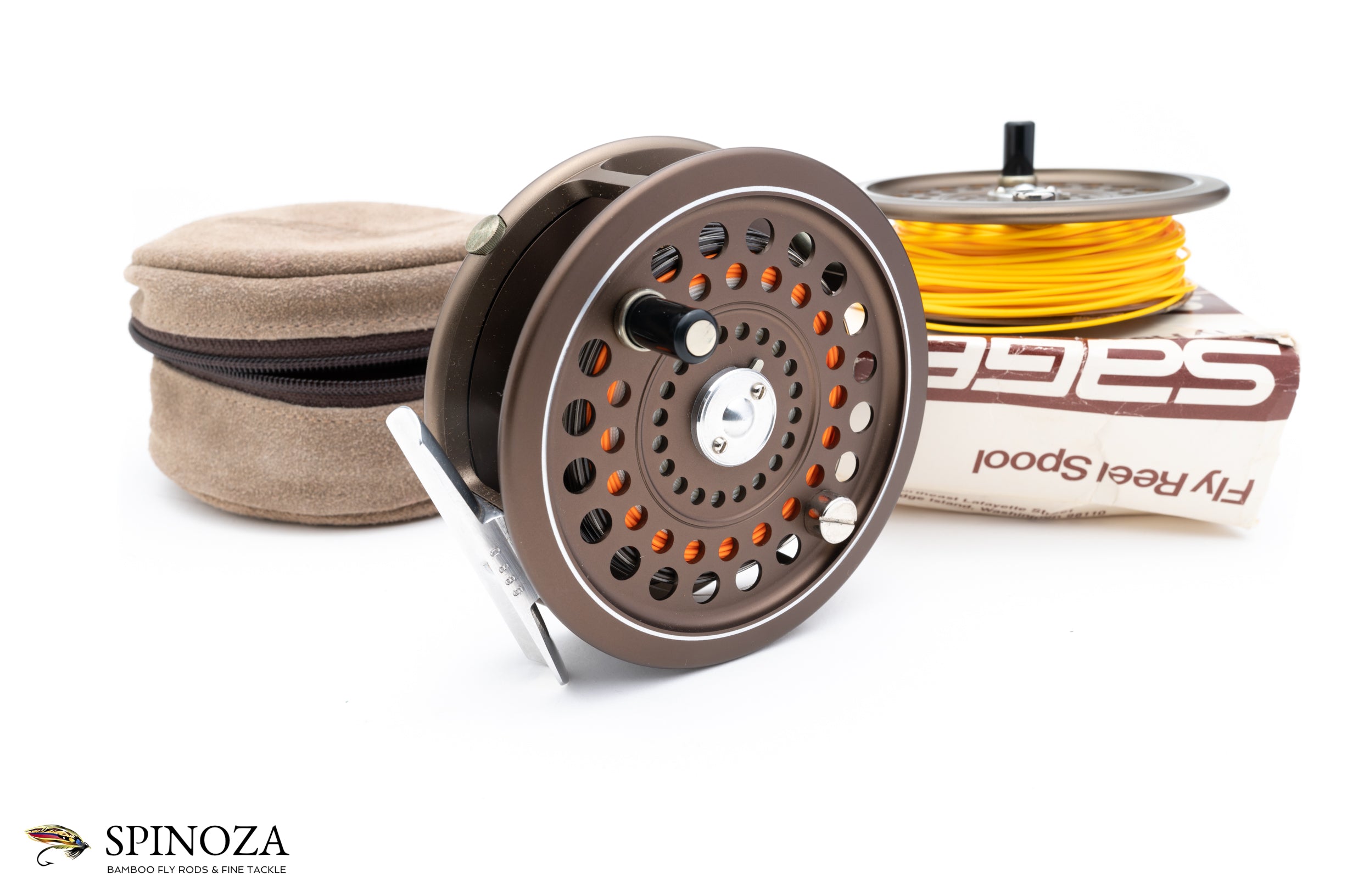 A desirable Sage 508 Fly Reel with a spare spool, 3 3/4" diameter and set up for RHW. Catalog weight of 6 1/2 ounces and this one is serial number 0885. This reel was made in England by Hardy exclusively for Sage. This is the Sage equivalent of the Hardy St. George 3 3/4" and Sage had them add a palming rim. Near mint condition bordering on true mint - despite both reel and spool having a line loaded on them, I could find almost no sign that they've been used. The foot has some mounting marks but the frame and spool are perfectly clean. Easily convertible retrieve direction with a reversible single screw nickel silver line guide. Strong smooth drag with a loud outgoing click. Comes with the original suede Sage pouch and the spare spool comes with its original box. A modern classic for salmon or steelhead!