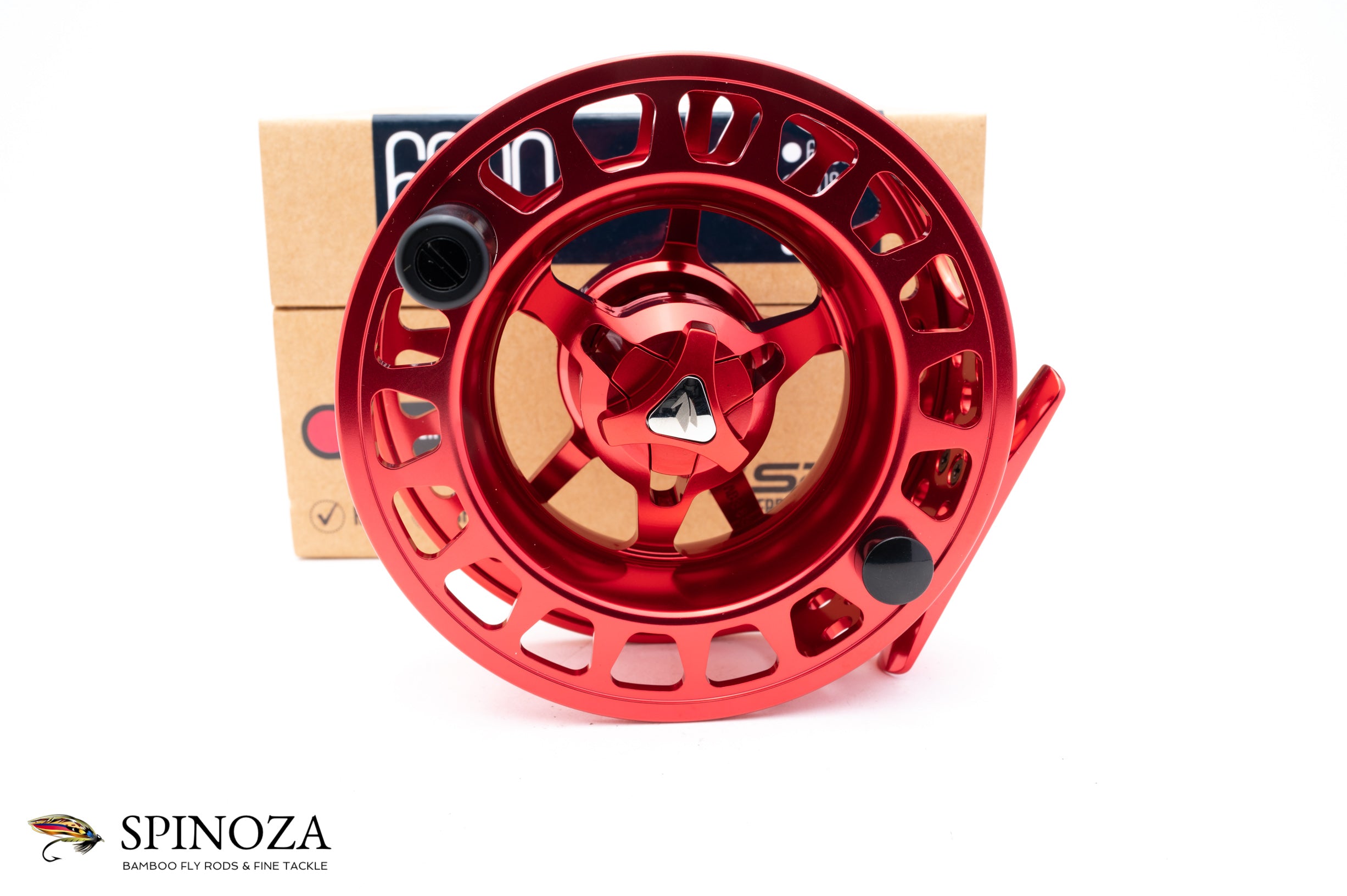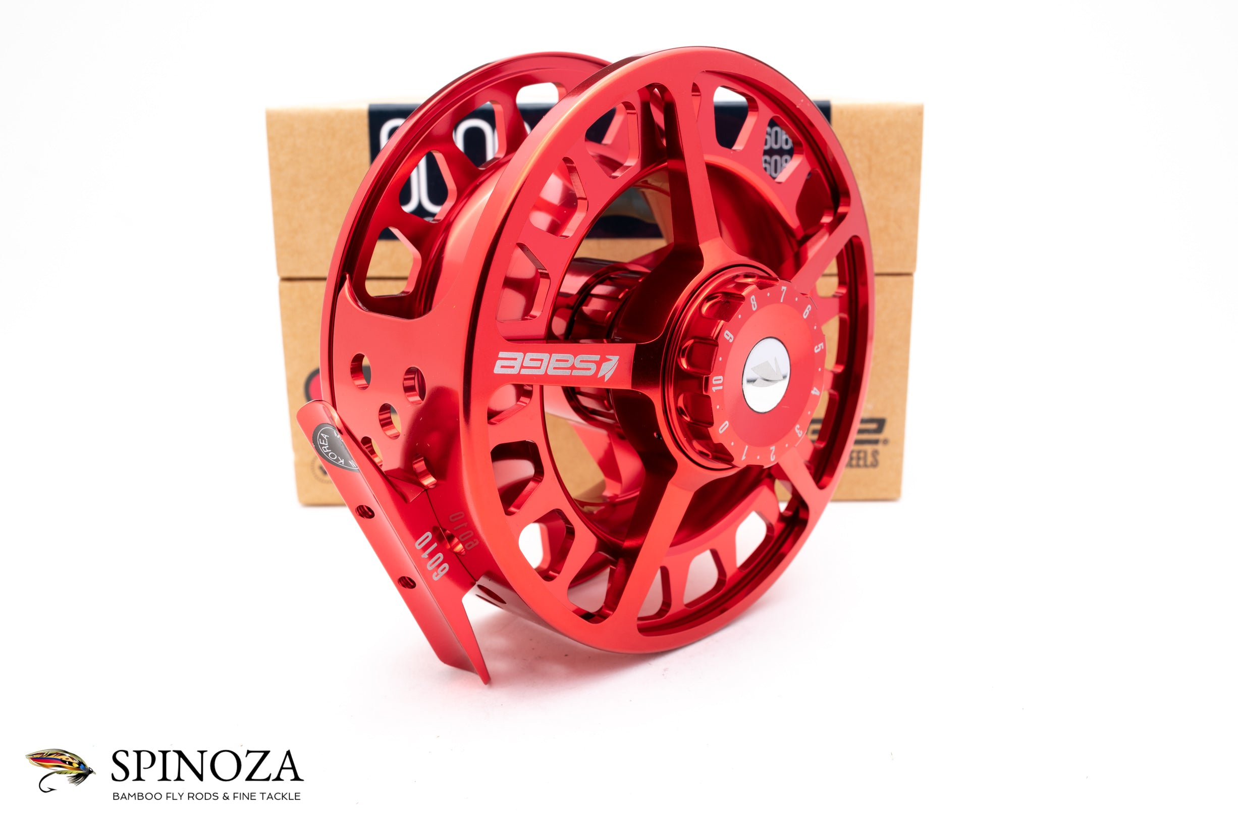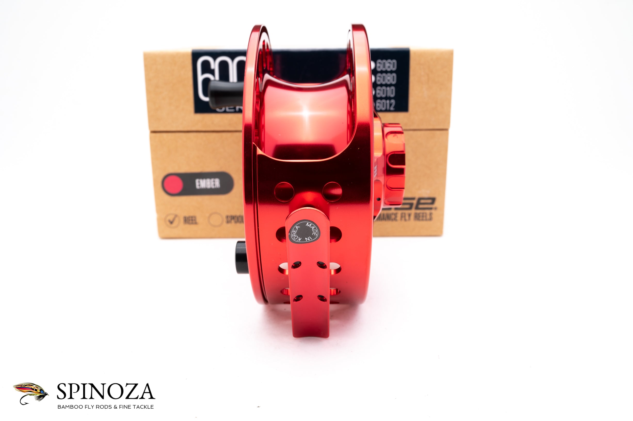 A nice Sage 6010 fly reel, 4 1/4" diameter and set up for LHW. This is the third largest reel in Sage's 6000 series. Highly ported, large arbor design, it weighs only 8.75 ounces Anodized a bright red "ember" color with a sealed drag system. Mint, unused condition. Capacity for 9/10 lines and 200 yards of backing. Comes with the original neoprene pouch and box with paperwork. Made in Korea.
