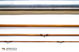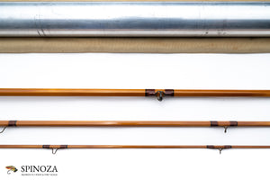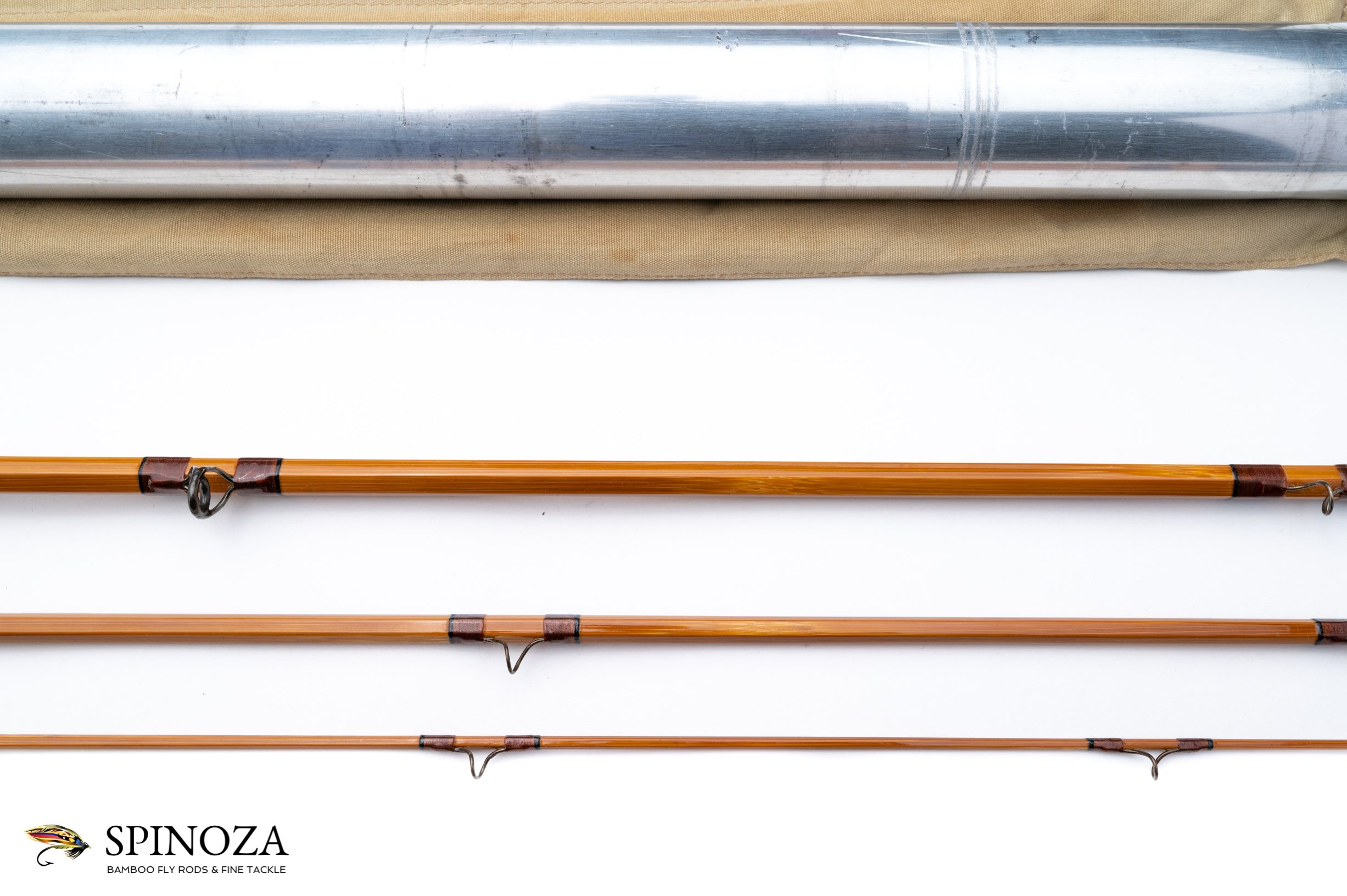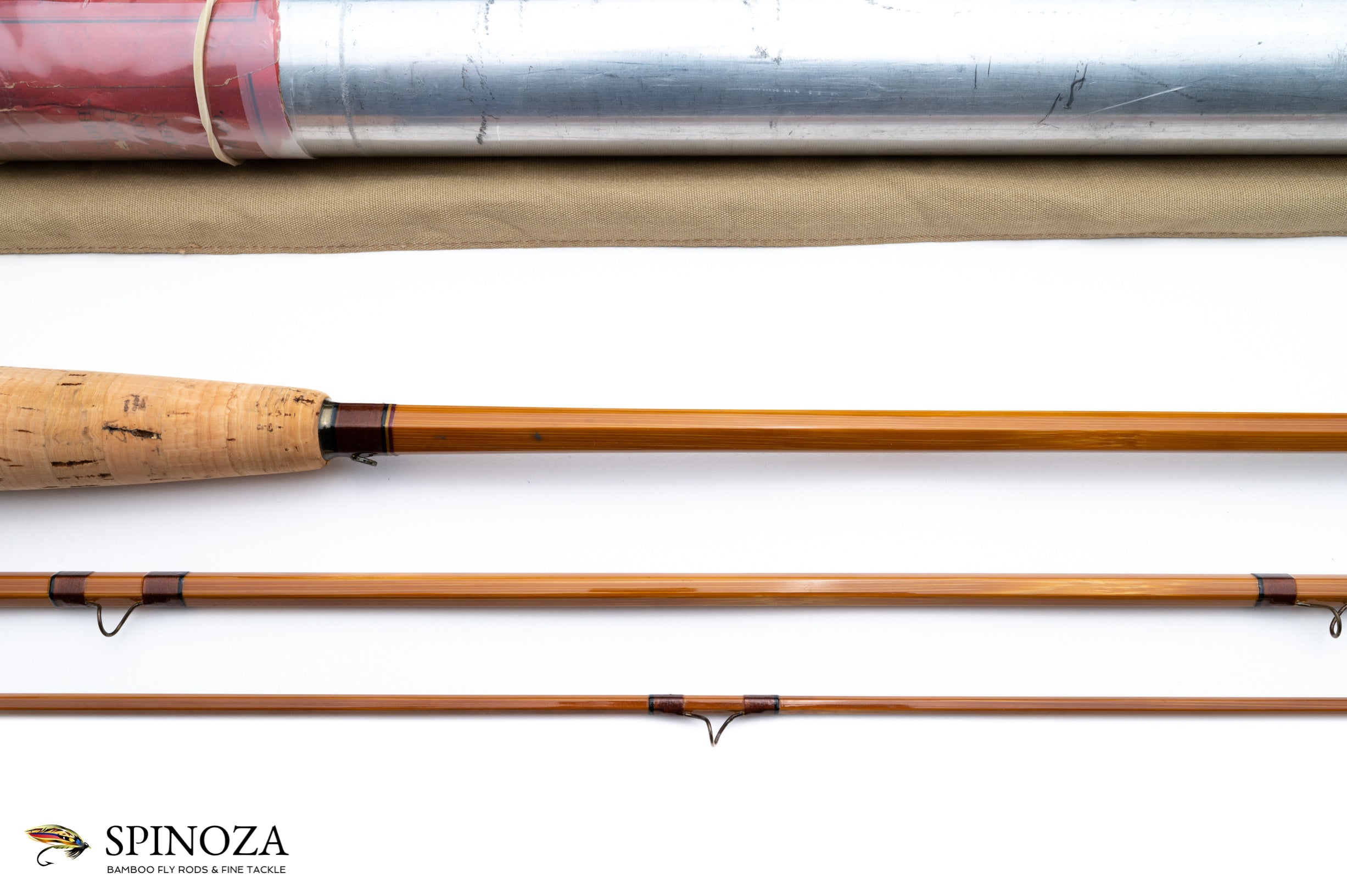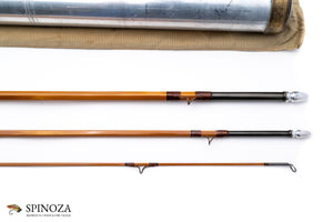 An EF Payne Model 205 bamboo fly rod, 8'6", 3-piece, 1-tip, and built for a #6 or #7 line. Weighs 4.9 ounces. Very light use the rod is straight and the ferrules are tight. No soiling of the grip. There are some cosmetic casting cracks at the ferrule wraps. A "Made for Abercrombie and Fitch" stamp indicates a manufacture date of 1963 or later. Perfection stripper and finial ferrule plugs. The action is on the quicker side. My guess is that this rod was made as a one tip rod which was more common when sold through Abercombie exclusively. The varnish is superb and flawless. The main wraps are brown with black edges with yellow and maroon tipping at the keeper and male ferrules. The step ferrules are oxidized jet black with the aformentioned finial ferrule plugs. The stripping guide is a #10 Perfection with black snakes the rest of the way. The grip is 6" long and shaped to a western profile with a hidden pocket cap. The rod has a Spanish cedar spacer and aluminum uplocking screwlock hardware. The hardware has "Payne" stamped in a cartouche and under that "Reg US Pat Off" and on the reverse "Made for Abercrombie and Fitch Co". The rod packs into an olive poplin bag with the original hang tag. The tube is also original and has a gray felt insert in the brass tube top. Both the green and red A&F labels on the tube are 80-90% intact.