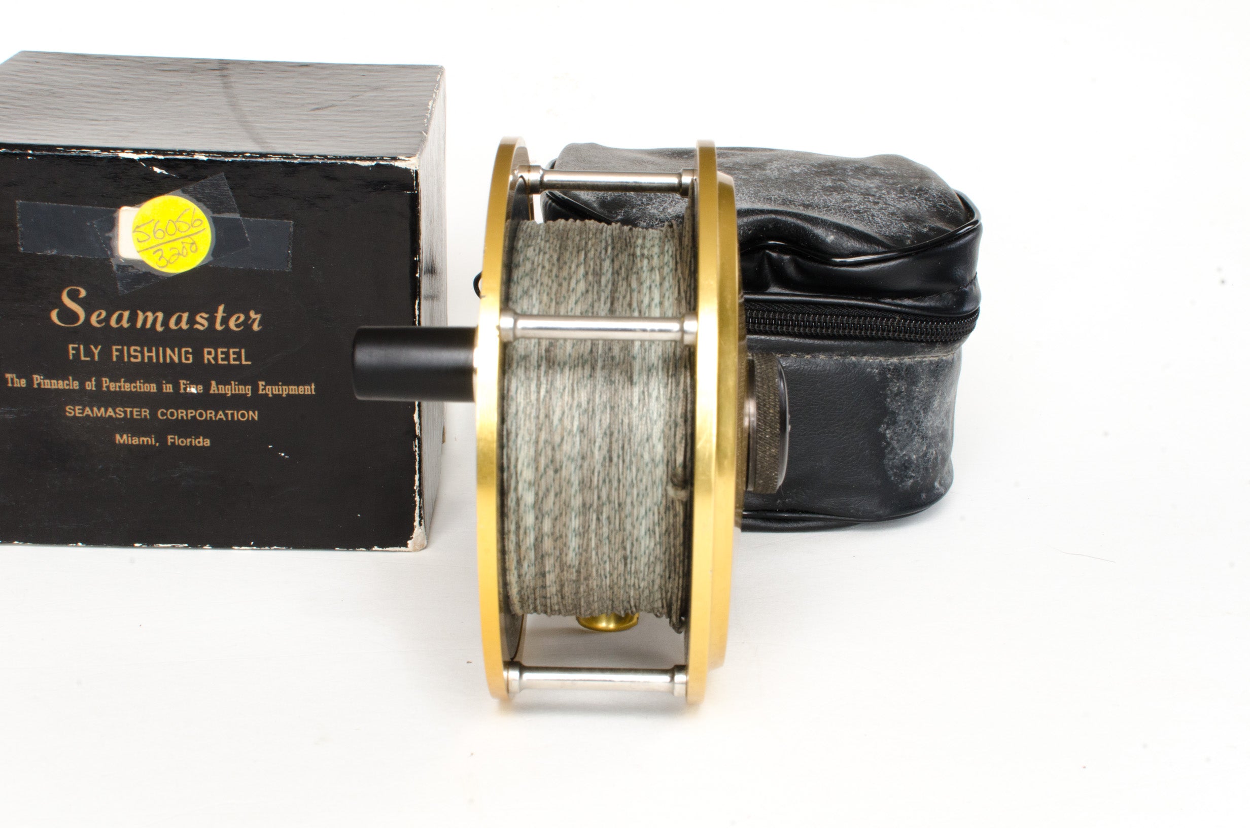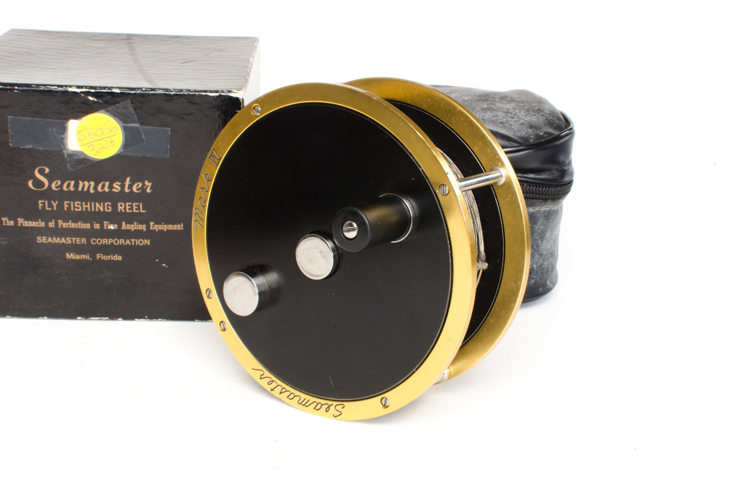 A rare Seamaster Mark IV fly reel, Serial #800. R.H.W. This is the big boy, the model designed for sailfish, and is 4 3/8" diameter with a spool width of 1 3/8". Direct drive. Designed to hold a WF13 with 600 yards of backing. Listed reel weight of 13 oz. Used but very good condition. There is a small amount of rim rash to the bottom of the frame. The reel is still loaded with backing but no line. Gold anodized frame and reel foot. Black anodized spool. The owner's name is scratched into the foot. This reel comes in the original padded case with the box and warranty papers. This model is very hard to find.