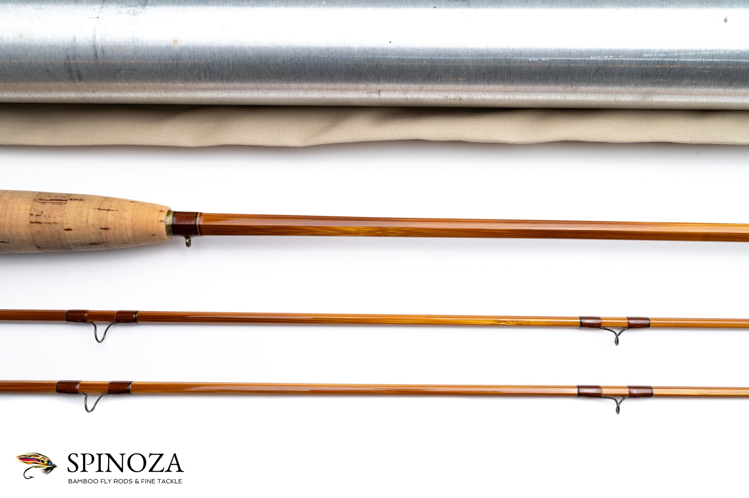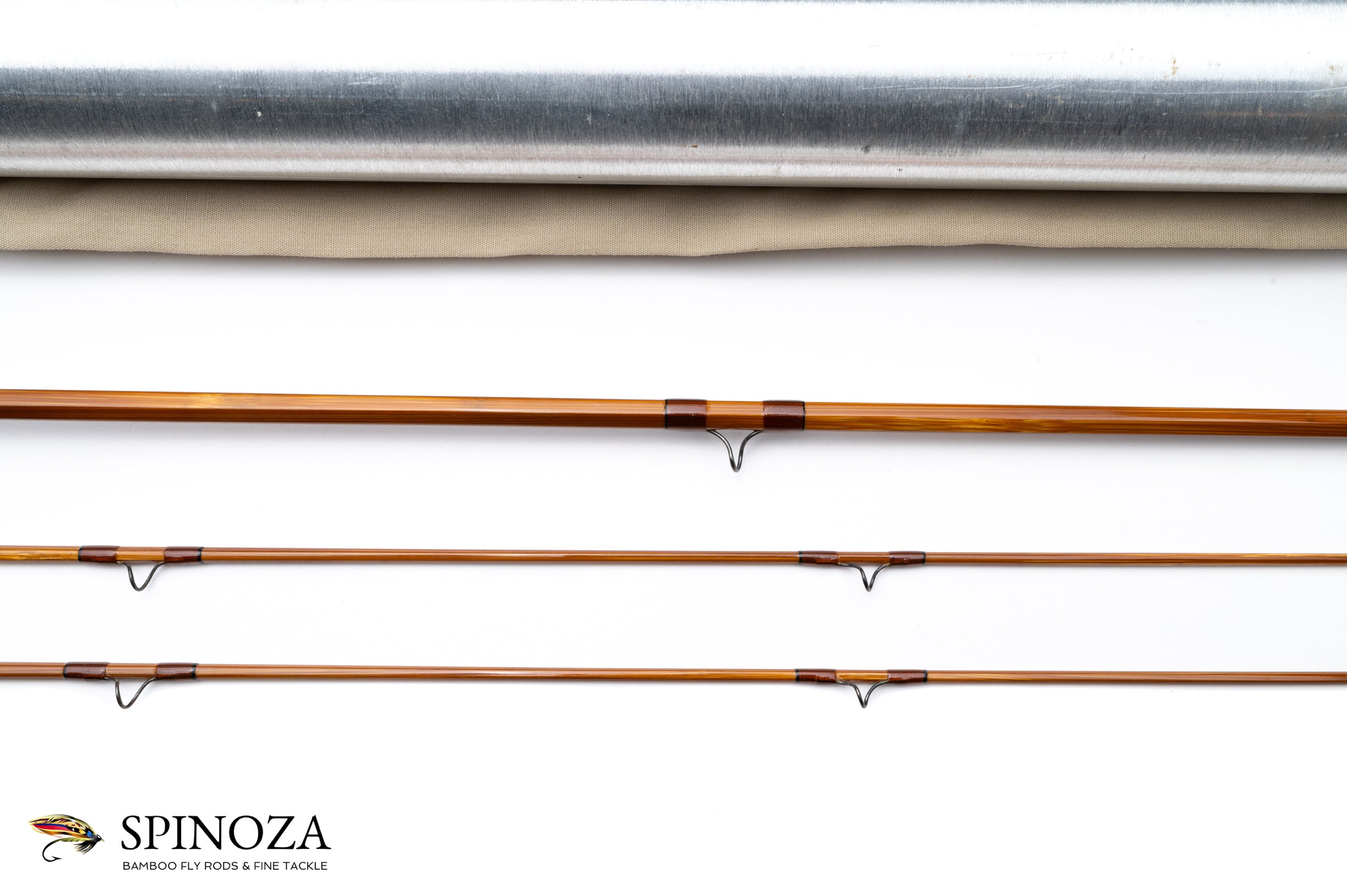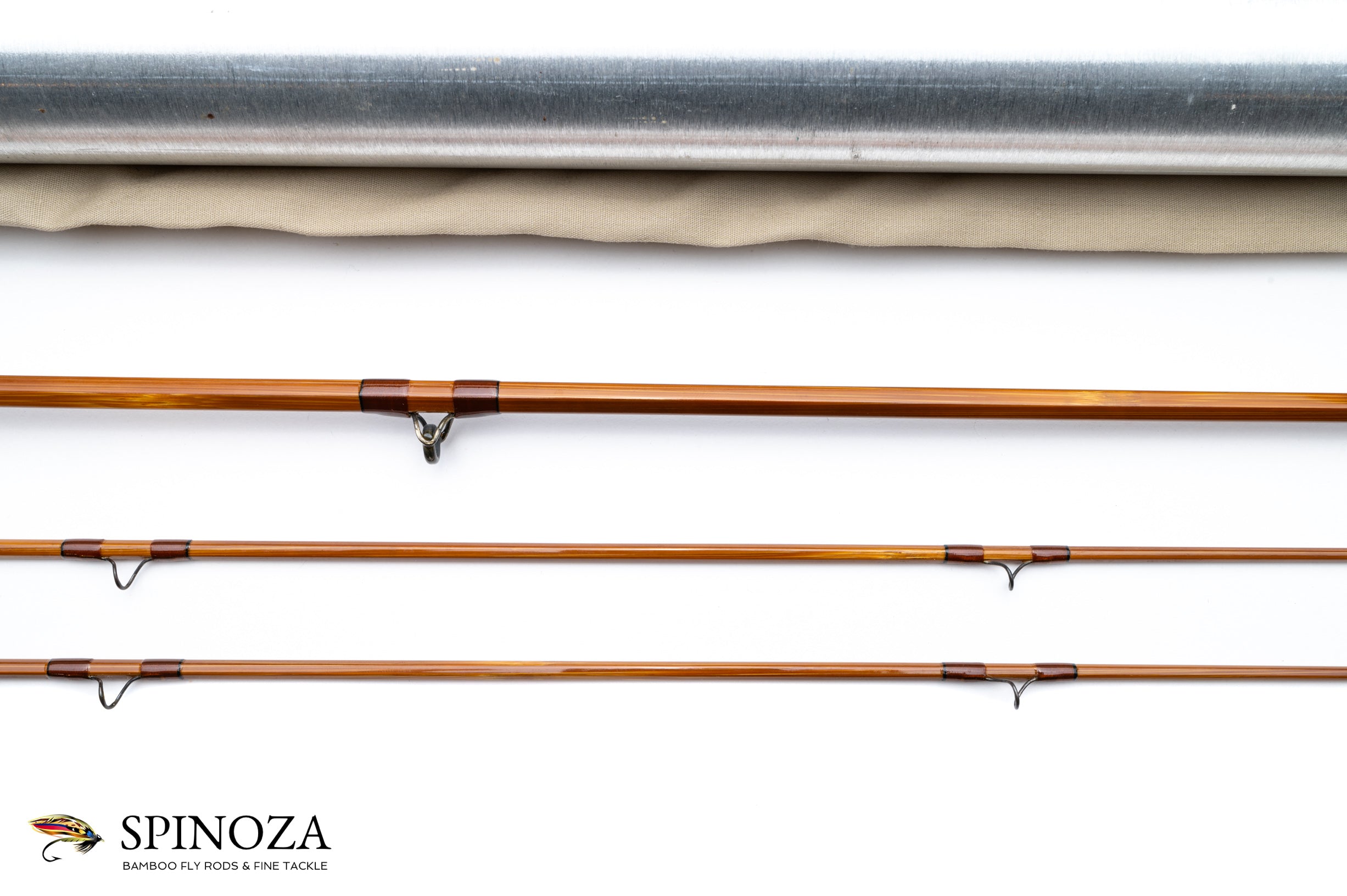 A very nice Walt Carpenter Browntone bamboo fly rod, 7'6", 2-piece, 2-tip, and built for a #4 or #5 line. 3.7 ounces on my scale. Serial #93276. Lawn cast or very very light use at most. Just the faintest start of some hand soiling to the grip. Both tips have the faintest beginning of cosmetic casting cracks to the ferrule wraps, and the high arch HSS snake guides have just a hint of brassing. The action is medium fast. Flamed cane with light nodes done in a three up node pattern. Excellent varnish and the brown main wraps have black edges with an extra band of yellow and purple at the keeper and male ferrules. Perfection style stripper. The rod is pin straight and retains 100% of the original oxidation. The cigar grip is 5 1/2" long and tapers down to a cork seat the last inch of which is a burl walnut. The nickel silver ring and pocket cap are oxidized. The bag is an eggshell color and the brushed aluminum tube has brass hardware and Walt's data sticker (it is a Huntington Mills, PA period rod).
