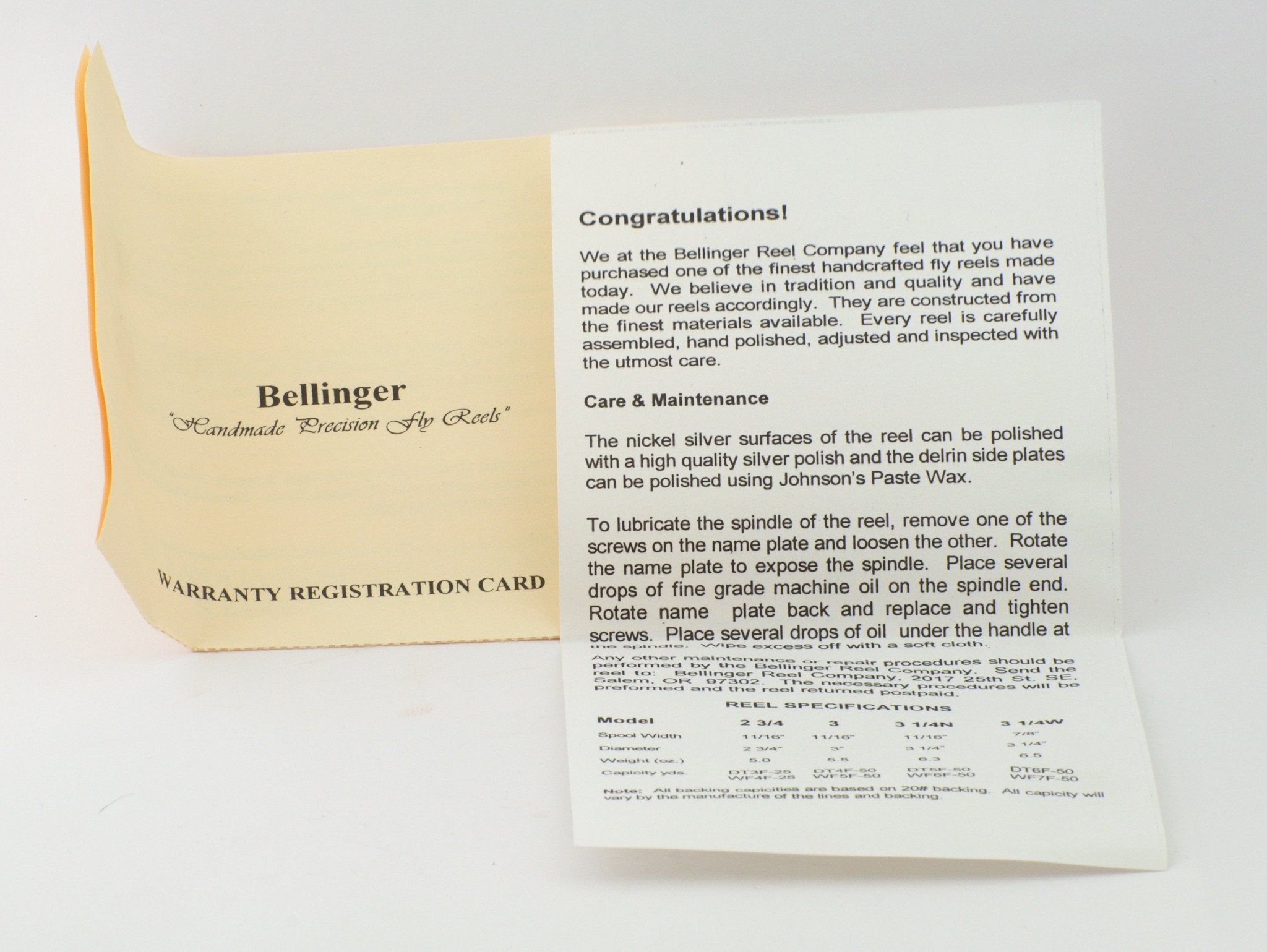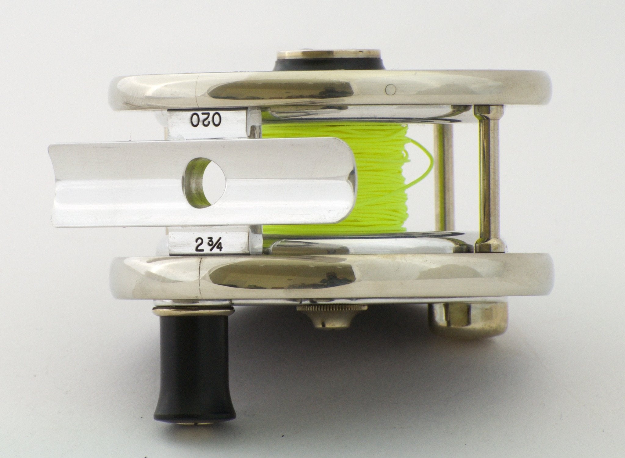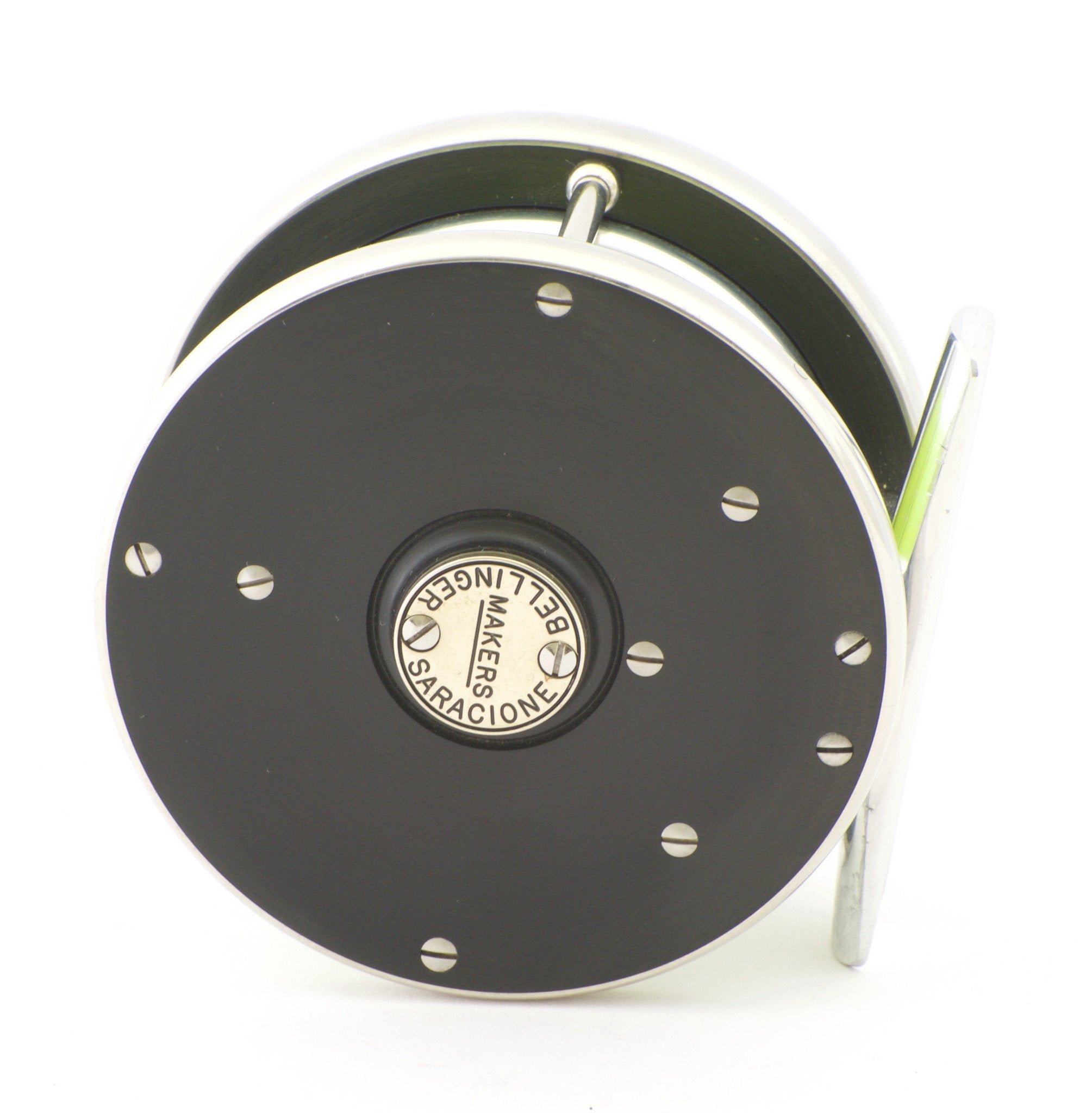 For sale here is a 2 3/4" Bellinger/Saracione fly reel in near mint condition. Serial #020. Right hand retrieve, but Joe can change it to left for a fee. These bench-made reels have german silver protective side bands and delrin sideplates. The artfully-bolstered cross-pillars are german silver, as are the counterbalance, winding-arm washer-cup, and oil cap. Comes with original box, reel pouch, warranty card, and paperwork. Capacity is a WF4 plus 25 yds of 20# backing.