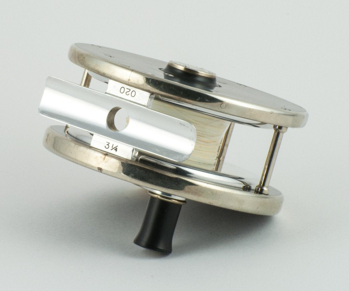 For sale here is a 3 1/4" Bellinger/Saracione (narrow) fly reel in excellent+++ condition. Spool width is 5/8" and the reel weighs 6.2 oz.Serial #020. Right hand retrieve. These bench-made reels have german silver protective side bands and delrin sideplates. Artfully-bolstered cross-pillars are german silver, as is the counter-balance, winding-arm washer-cup, and knurled oil cap. Comes with original box, reel pouch, and warranty card.