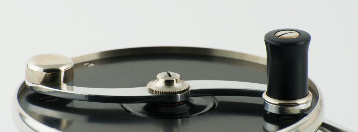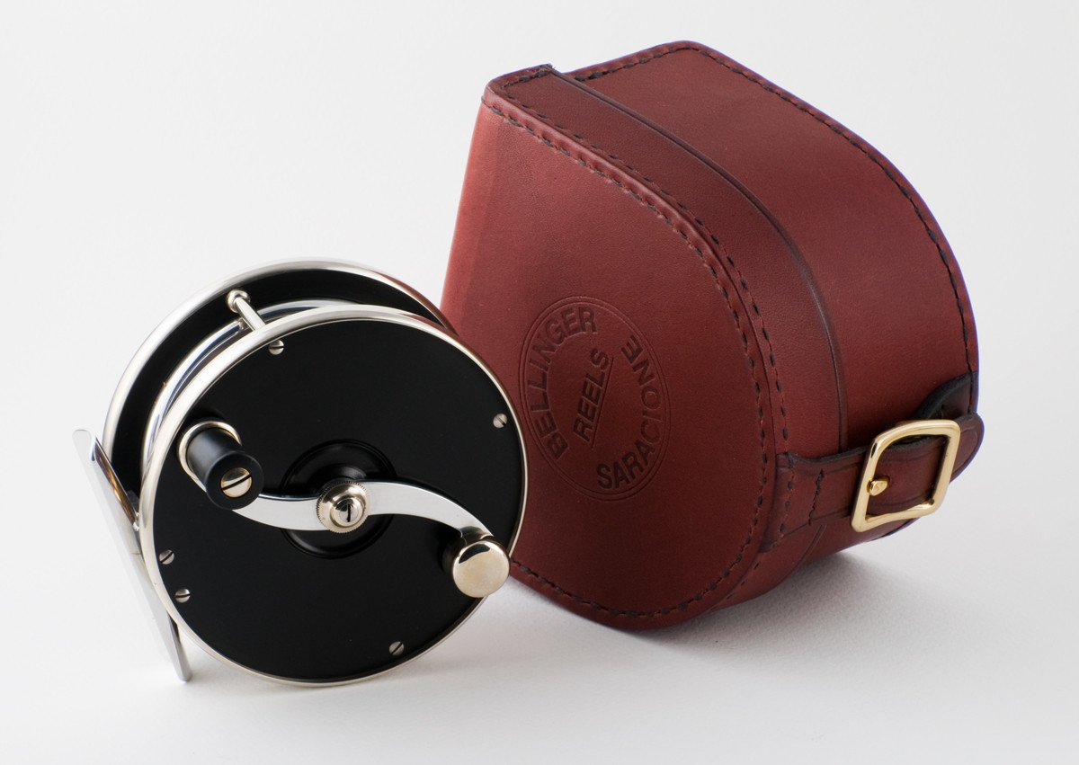 For sale here is a 3 1/4" Bellinger/Saracione (narrow) fly reel in unused condition. Spool width is 5/8" and the reel weighs 6.2 oz.Serial #049. Joe recently changed the reel from RHW to LHW. These bench-made reels have german silver protective side bands and delrin sideplates. Artfully-bolstered cross-pillars are german silver, as is the counter-balance, winding-arm washer-cup, and knurled oil cap. Comes with original box, Arne Mason leather reel case, and warranty card.
