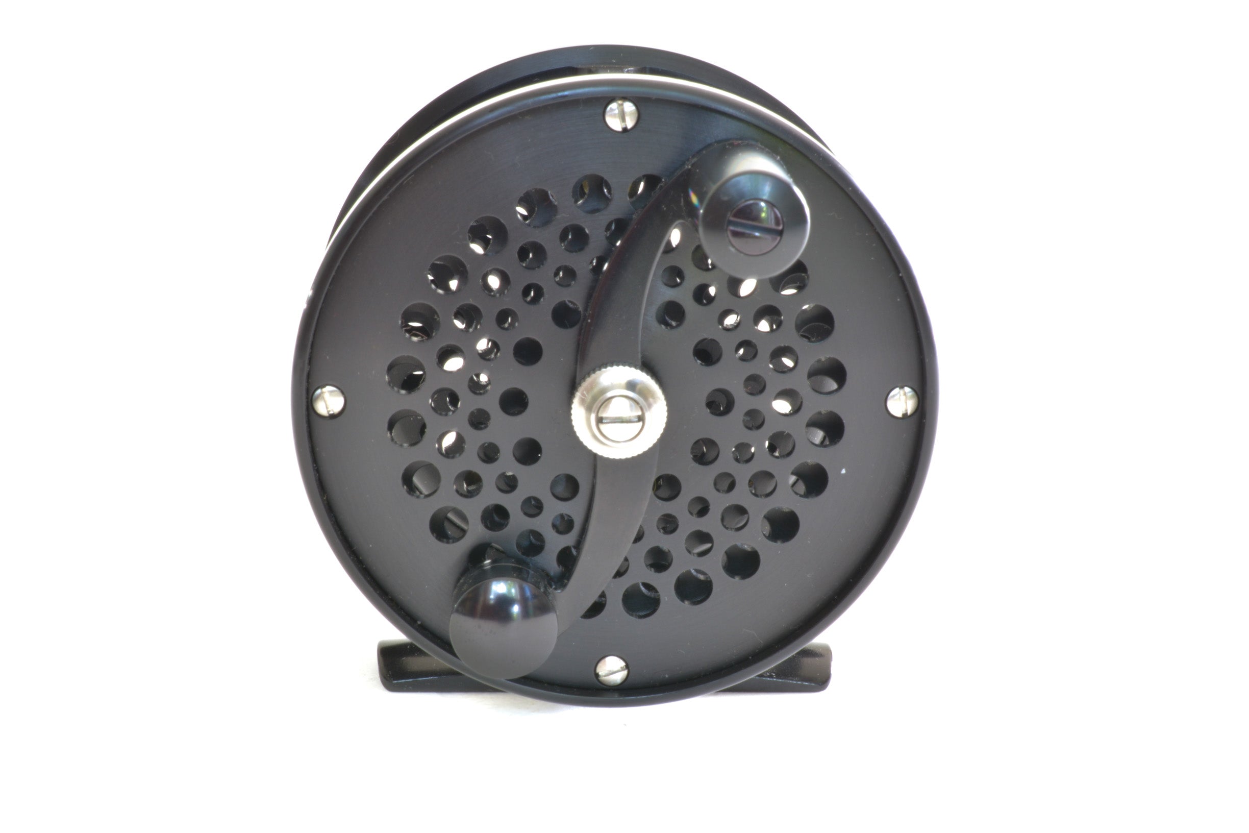 A superb Saracione Mark IV trout reel, 3" in diameter and set up for RHW. Mint condition. The spool width is 13/16" and the whole reel weighs in at 5oz on the nose. This 3" model was Joe's most popular size and is designed to hold #4/5/6 lines with 50 yards of backing. Fixed check drag. A beautiful all black anodized reel, which I believe must have been custom ordered from Joe. "Saracione Mark IV, 3" and "Made in USA" stamped on the backplate. This reel has a lovely ultra-high-precision fit and finish. It comes in a Saracione logo pouch and original box.