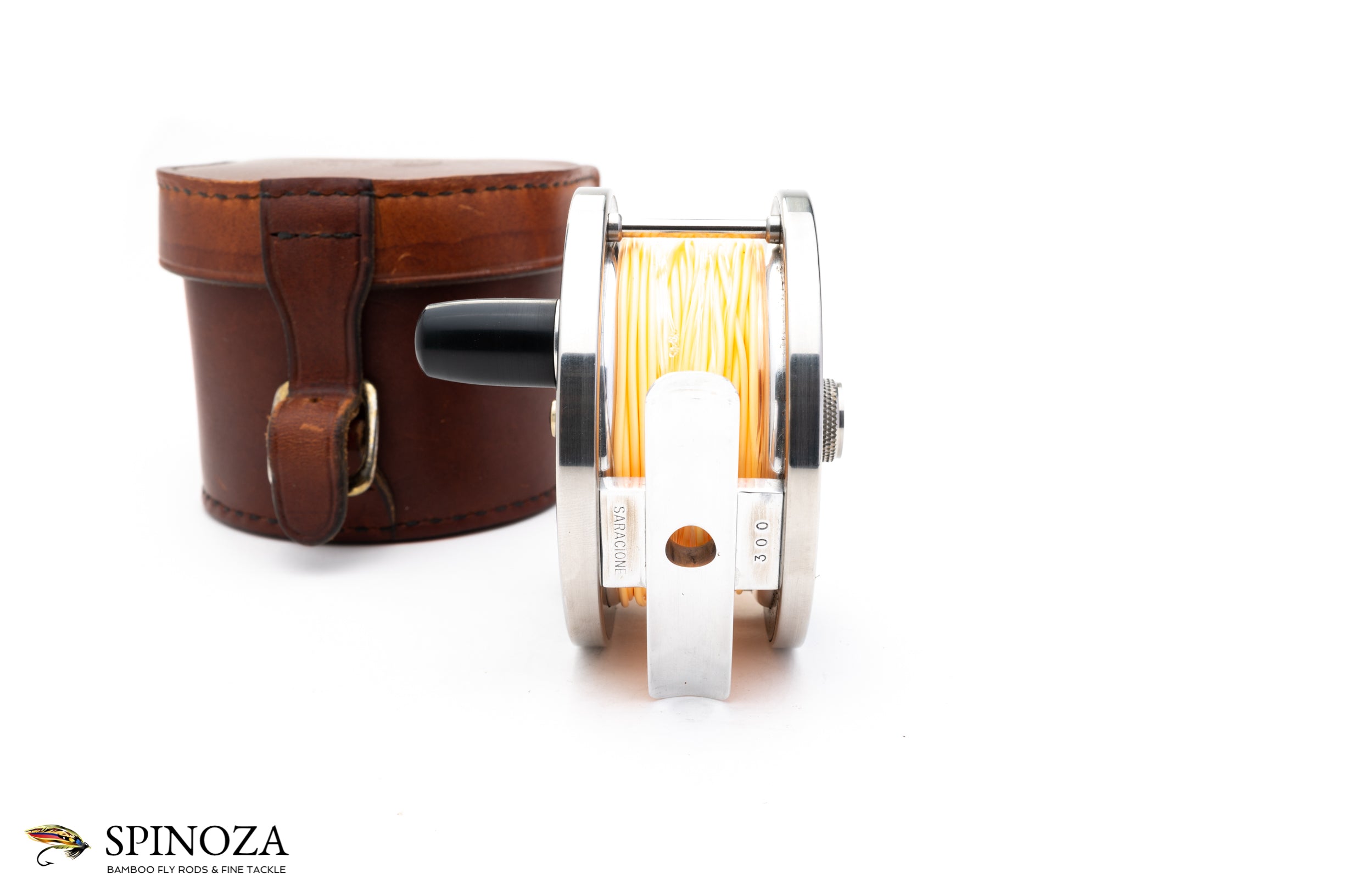 A superb Saracione Deluxe trout reel, 3 1/4" in diameter. LHW. Near mint condition with some very minor rubbing in a few spots on the rims and some mounting marks on the foot. Completely clean otherwise. Serial #300. Fixed drag with a nice loud click. A classic S-style reel, with black ebonite side plates, nickel silver rims, stainless pillars, and aluminum foot and crank. Capacity for a #6 or #7 line with 125 yards of backing, and the reel appears to currently have a Rio gold line on it (perhaps a #5). Phenomenal craftsmanship on this reel, the kind you have come to expect from a maker like Joe. Comes in an Arne Mason leather case with Joe's logo embossed on the top of it.