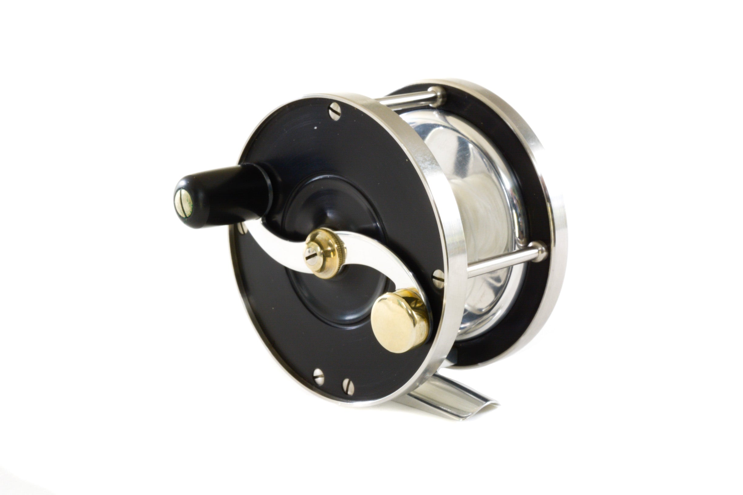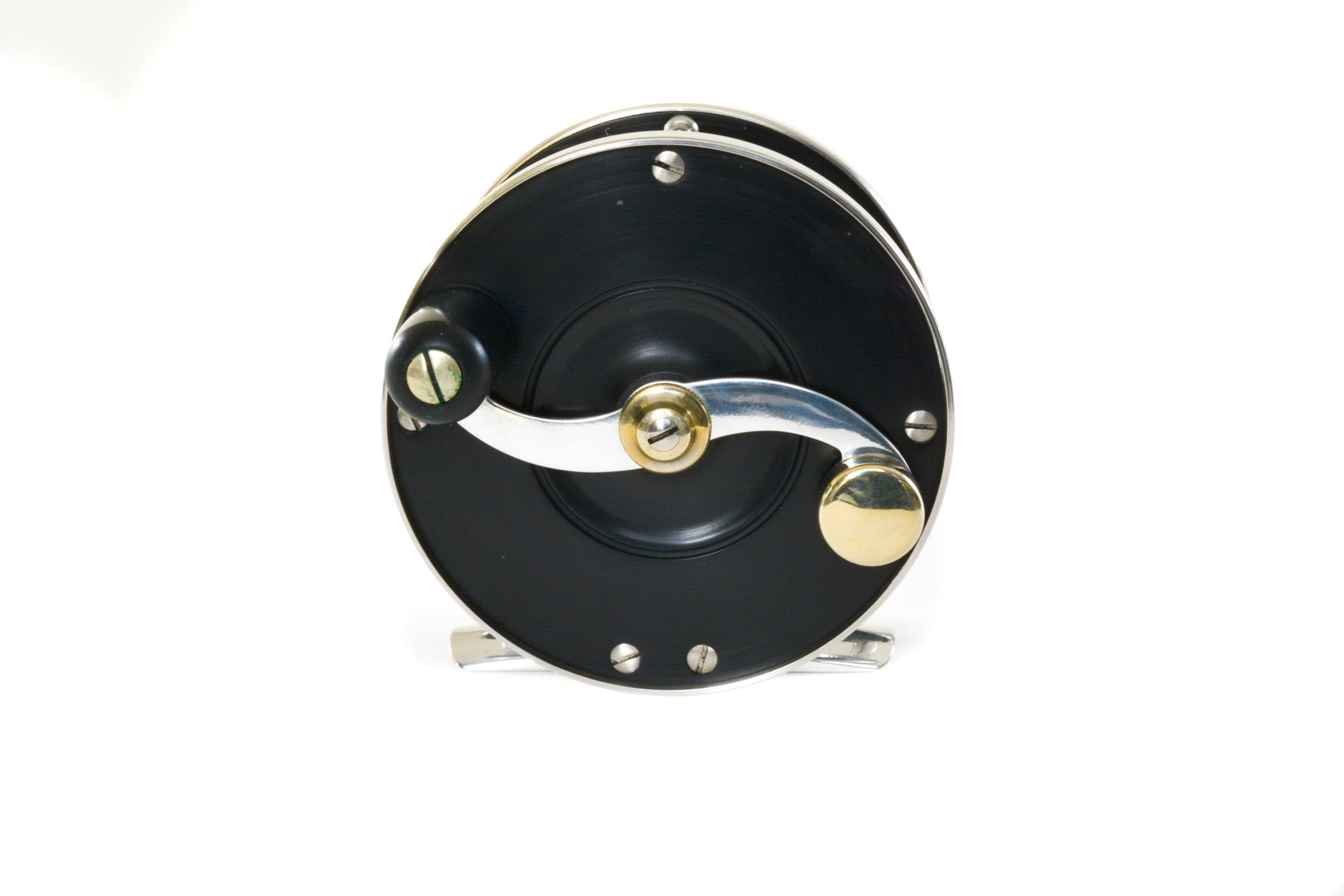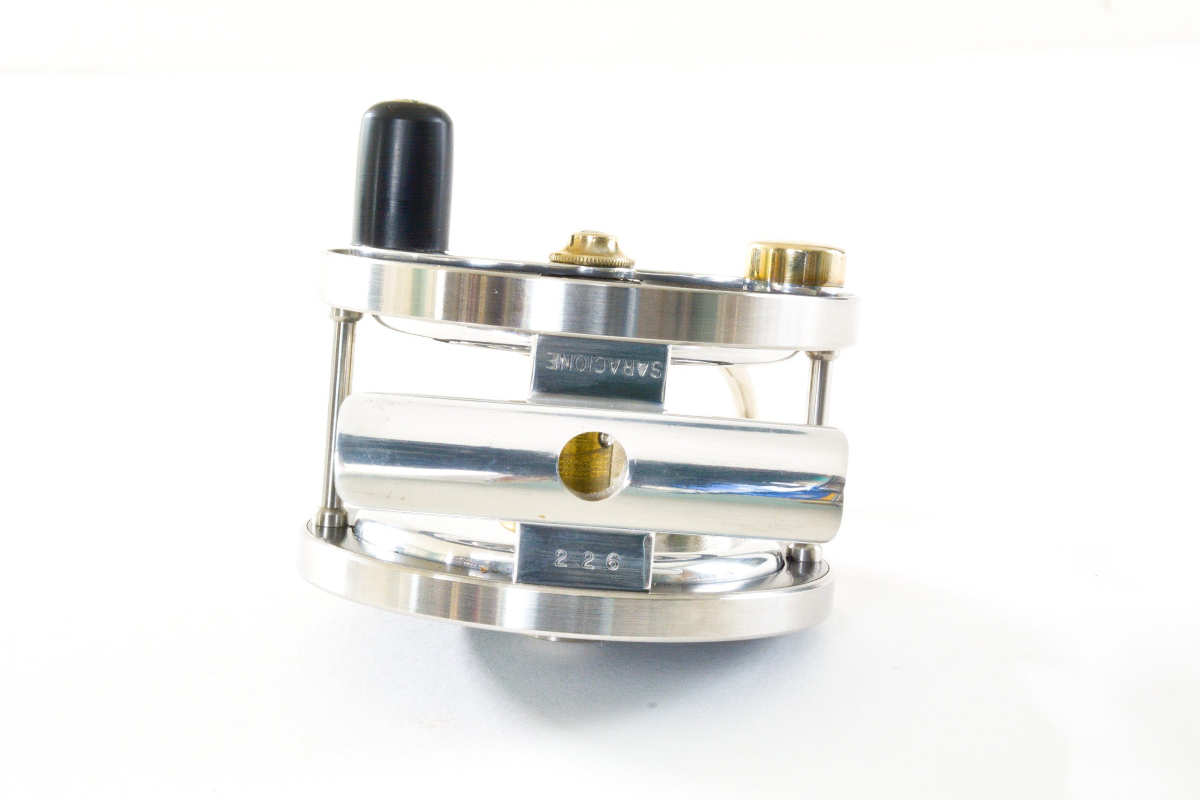 An excellent Saracione Deluxe trout reel, set up for LHW. 2 3/4" diameter with a 1" spool width. Serial #226. 4.9 oz. Near mint condition, looks like it might have been used once or twice. A jewel of a small reel. The serpentine handle is aluminum and the counterbalance nickel silver. Black Delrin side plates. Stainless steel rims, screws, pillars, and oil port. Aluminum foot and spool. Bronze center pin. "Saracione" is stamped on the reel as well as the serial. The leather case is by Arnie Mason with Joe's logo stamped on the top. It doesn't get better than this in terms of pairing a reel with you favorite small stream rod.