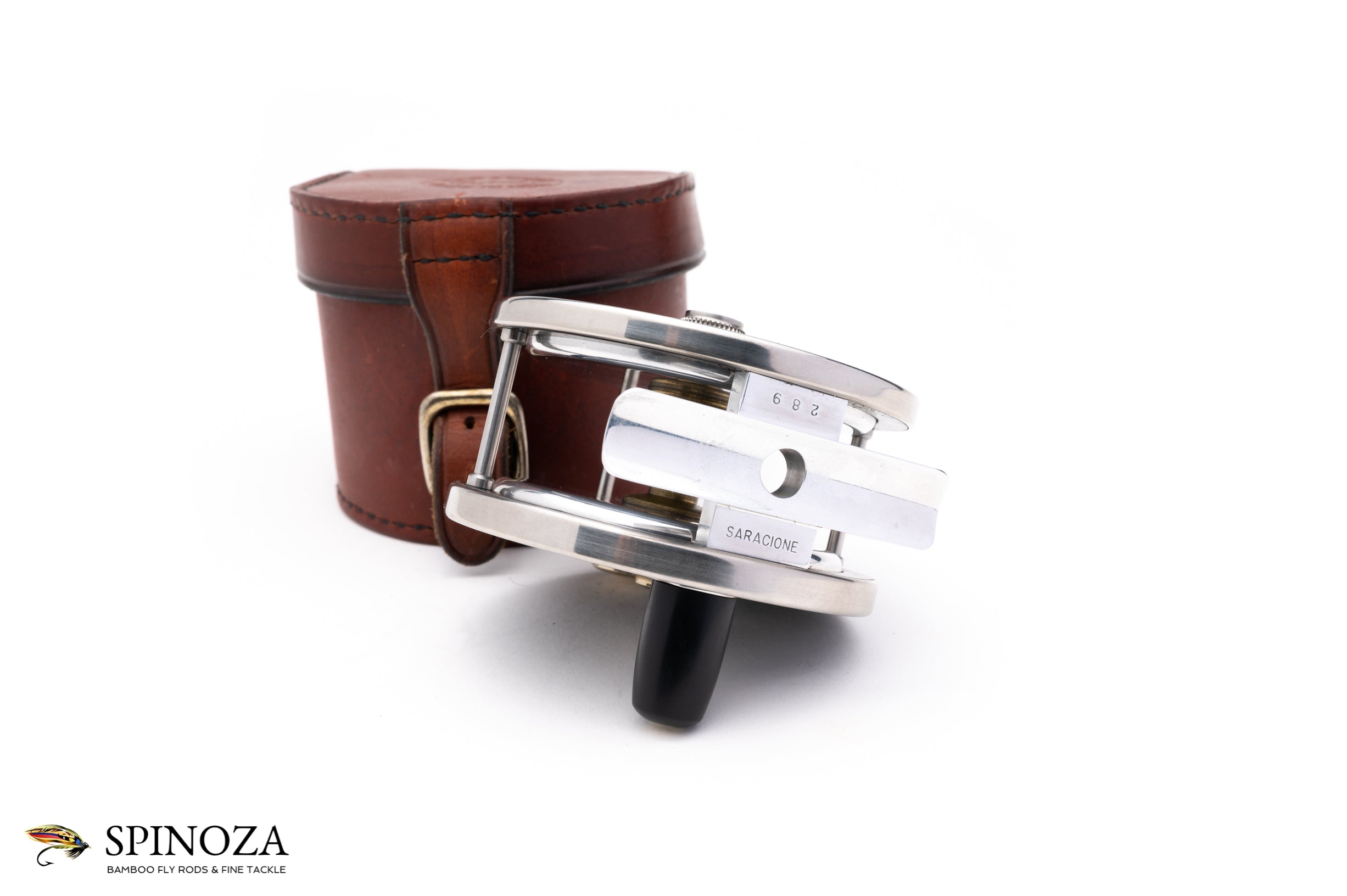 A beautiful Saracione Deluxe fly reel, 3 1/4" diameter and set up for LHW. Serial #289. Appears unfished. There is a tiny mark on one edge of one foot, likely from being fitted to a rod, but I can find no sign whatsoever that this has been fished. The rims, plates, spool, etc., are clean as the day they left Joe's shop. Stainless steel rings and delrin sideplates. Comes with an Arne Mason leather reel case. Capacity is a DT6 line + 50 yds 20# dacron backing. A fantastic model for those looking for a classic S-handle style trout reel.