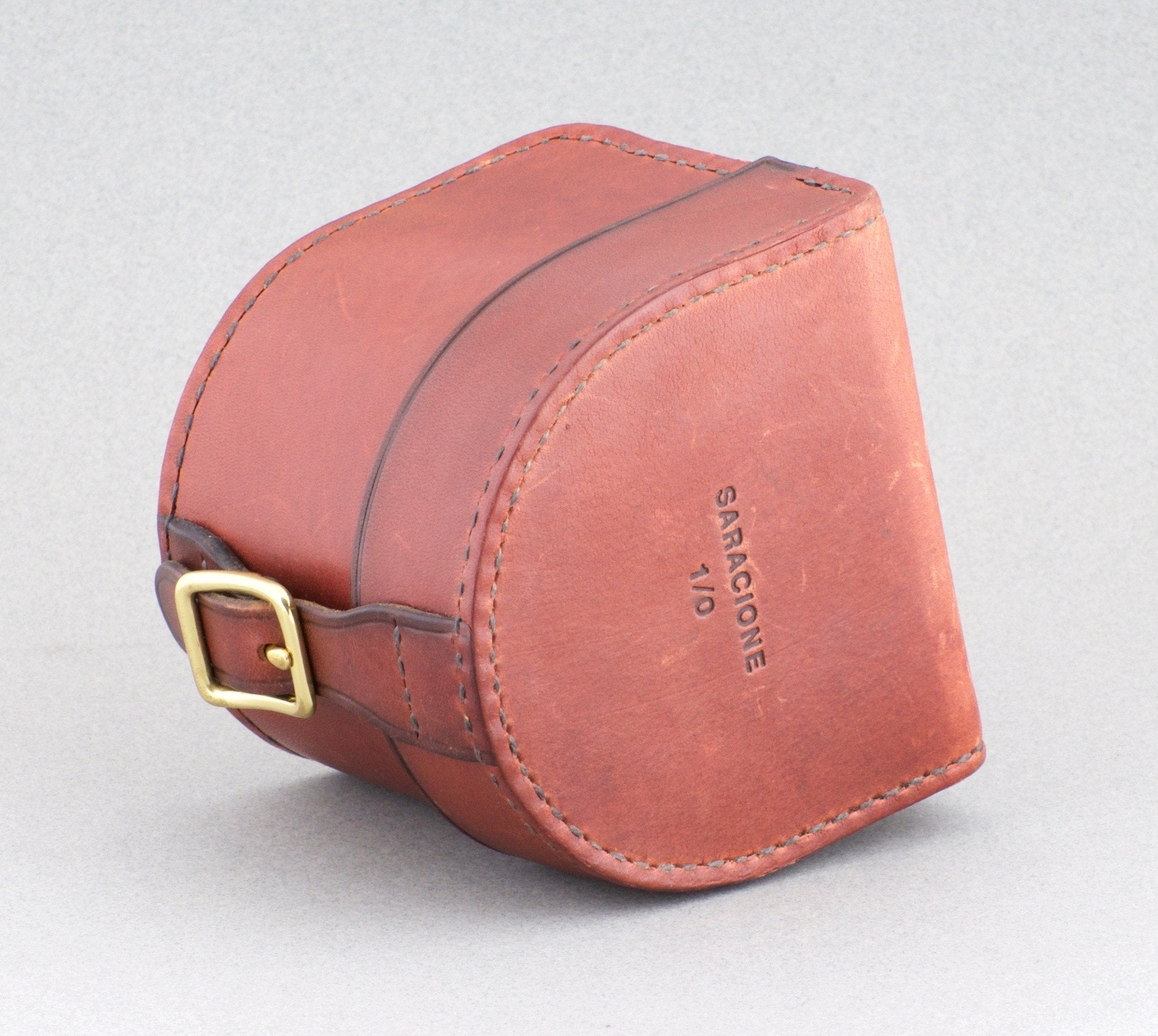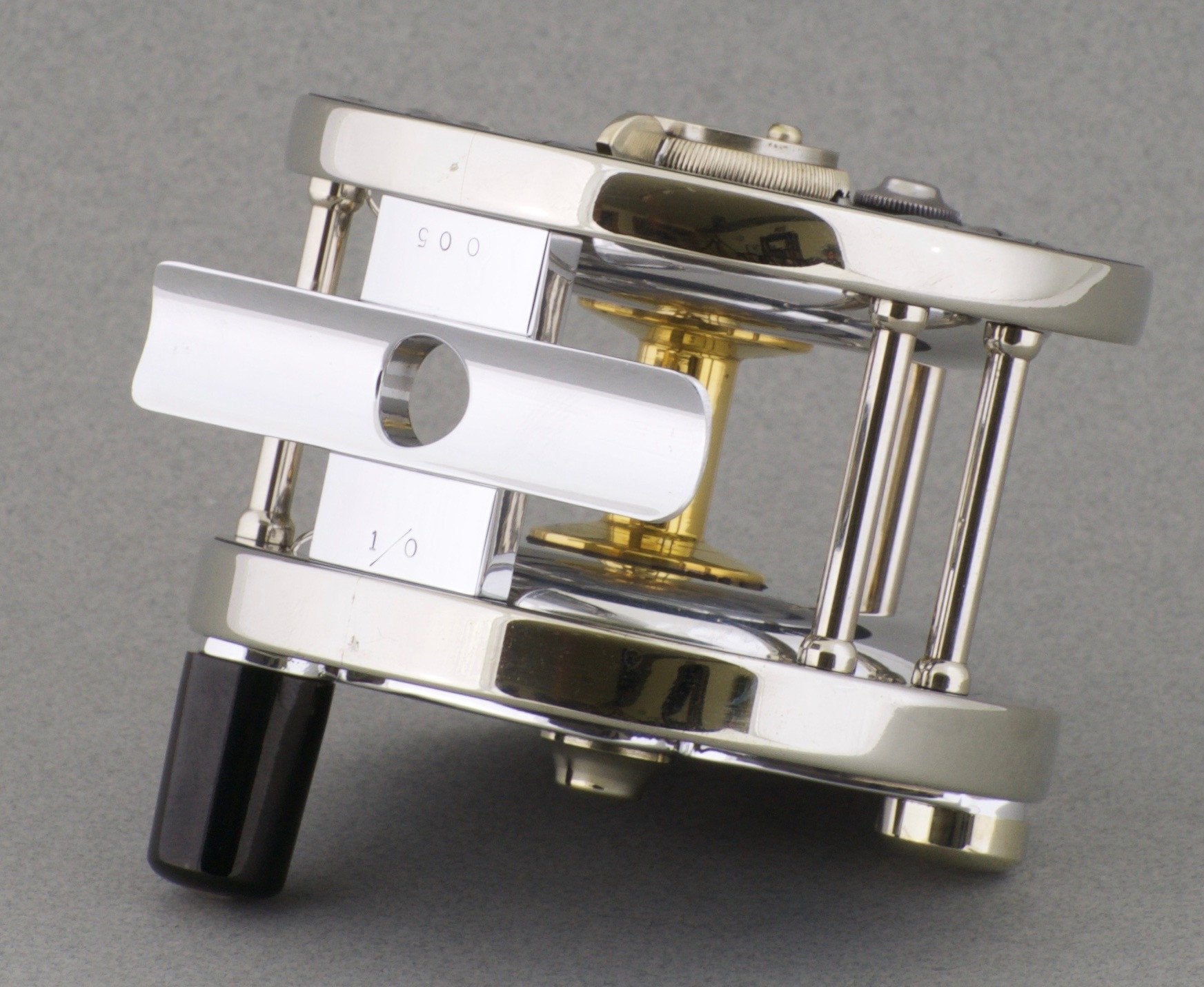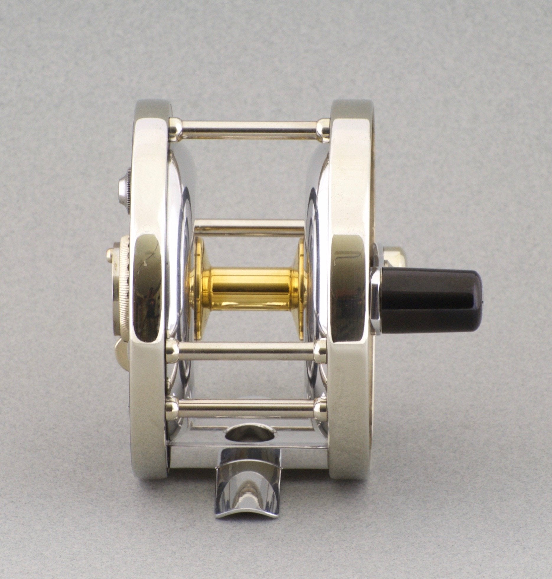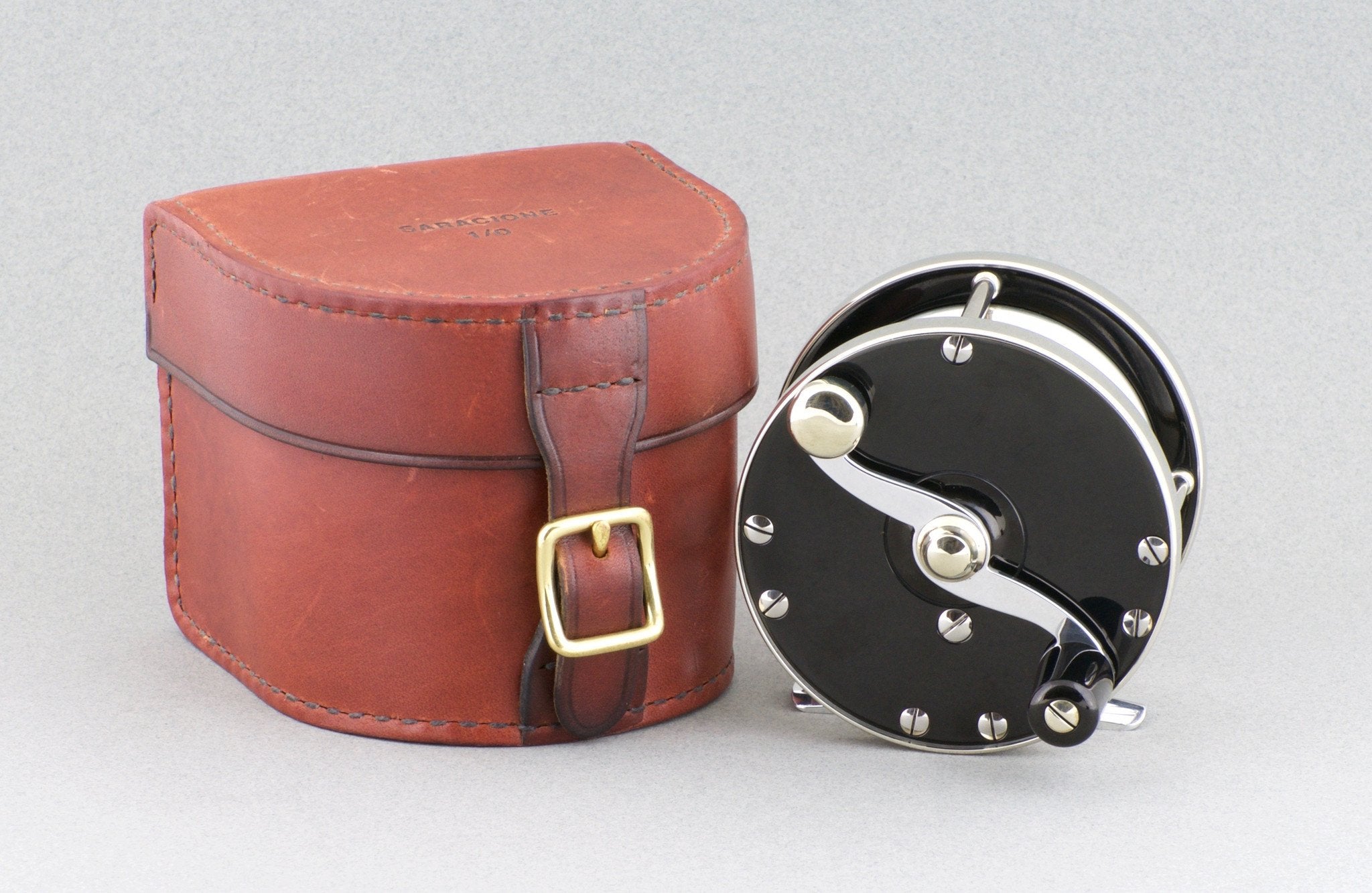 These are flawless reproductions made of hard rubber and nickel silver. Each comes with a hard leather case embossed with "Saracione" and the model number. The reel is right hand retrieve.3" diameter, 1 5/16" cross pillar width, 2:1 ratio multiplier, rear 7-position drag, two rolling cross pillars, bronze spindle.