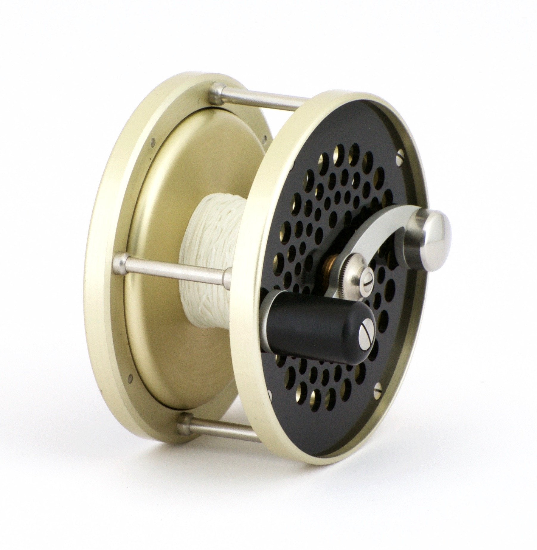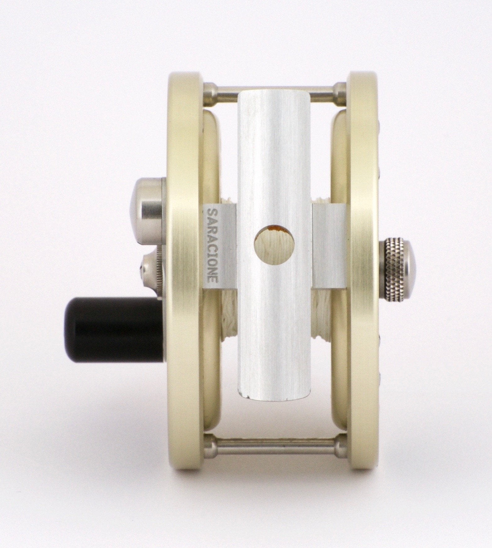 For sale here is a 3" Saracione MKI fly reel in near mint condition. Currently set up for LHW. These bench-made reels with aluminum rings were light champagne-gold anodized. Sideplates were black-anodized. Headplate vents align with drive-side spool venting. Assembled spool with bronze arbor--with the original Vom Hofe-style grub screw through the arbor to the spindle-shaft to allow centering adjustment of the spool in the cage. Artfully-bolstered cross-pillars are stainless. Counter-balance, winding-arm washer-cup are nickel silver. Easily switched to RHW if needed. Comes with original box.