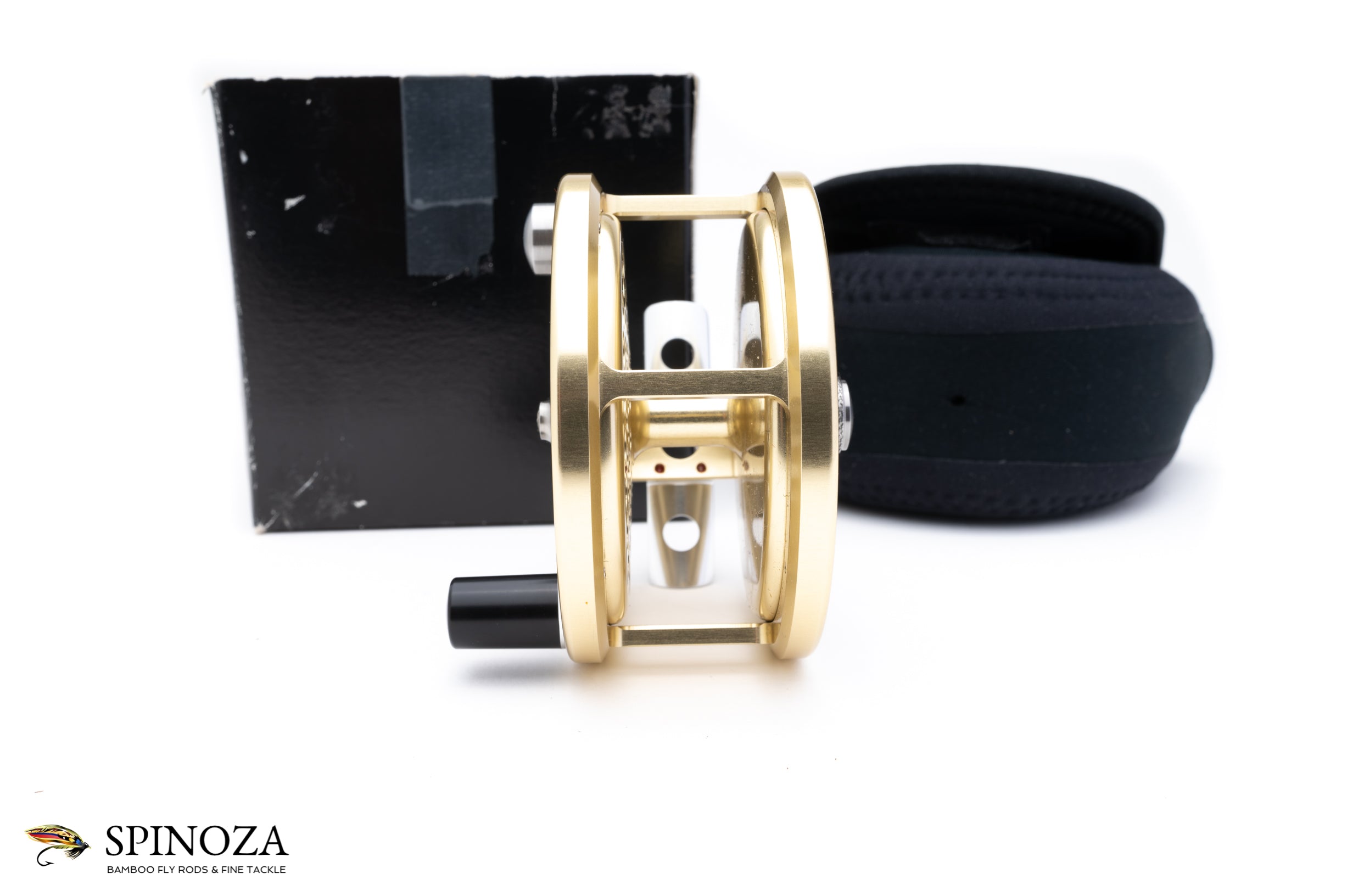 A nice Joe Saracione Mark IV Trout Fly Reel, 3 1/4" diameter and set up for RHW. Mint condition. Fixed check. Serial #644. 13/16” spool width and a weight of 5.7 ounces. Gold frame with black sideplates and a silver handle and foot. Ventilated spool and sideplate on the winding side. Joe's MKIV reels feature a preset gear and pawl drag system for spool control while paying out line to a running fish while also controlling light tippets. Precision machined from 6061-T6 Aluminum Alloy, 300 Series Stainless Steel and Silicone Bronze. Should carry a #4, #5, or #6 with 50 yards of 20# dacron. Comes with original box, neoprene reel pouch, warranty, and instructions.