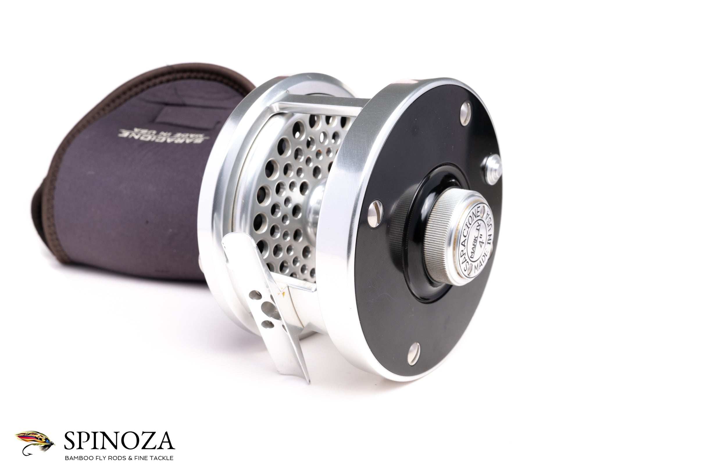 A very nice Saracione MKIV fly reel, 4" diameter and set up for LHW. The interior spool width is approximately 1 5/32" and it weighs 15.1 ounces on my scale. Good lightly used condition with some modest rim rash concentrated around the "resting area" but very clean overall. Black sideplates with a clear anodized frame. The spool is ventilated on both sides and the sideplate on the cranking side is ventilated as well. A powerful drag with a nice loud click. Single action retrieve. Designed to hold 8/9/10 lines and 150+ yards of backing. The reel comes in the original neoprene pouch. A great option for your mid to larger size spey rod.