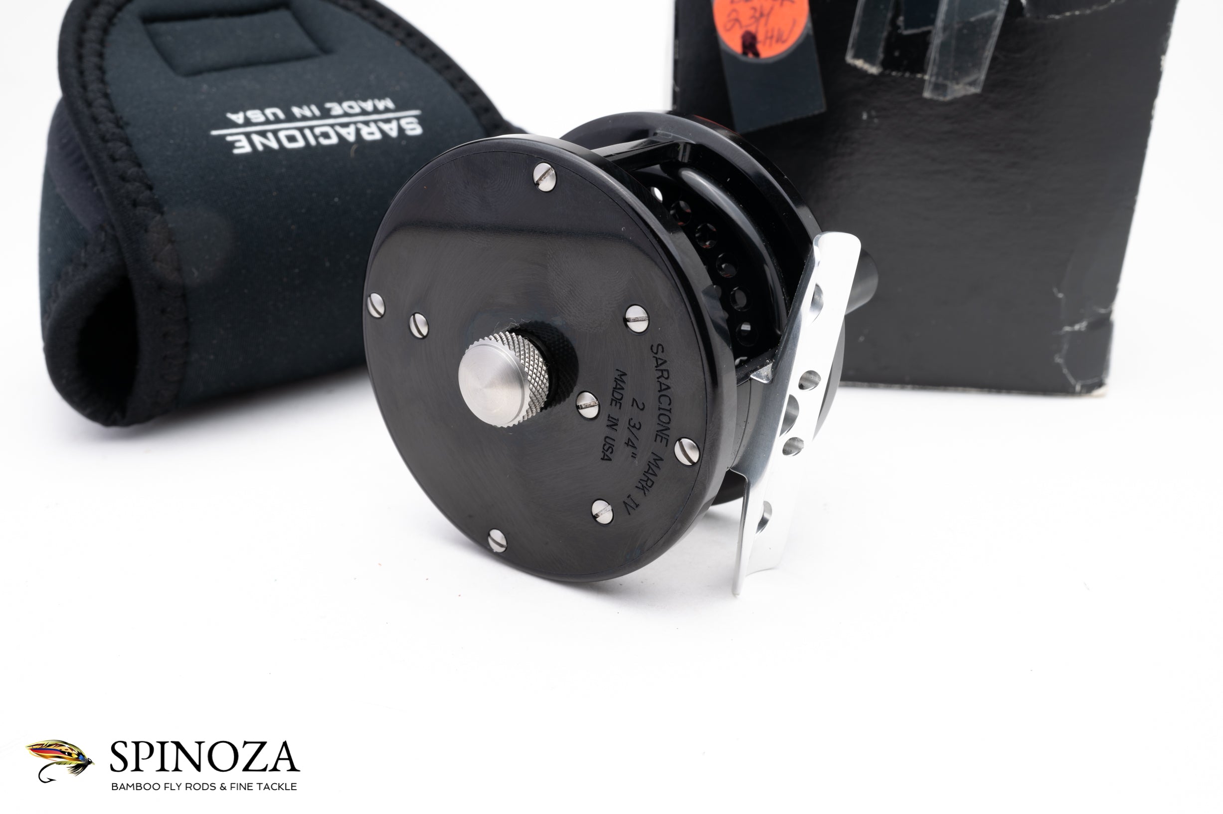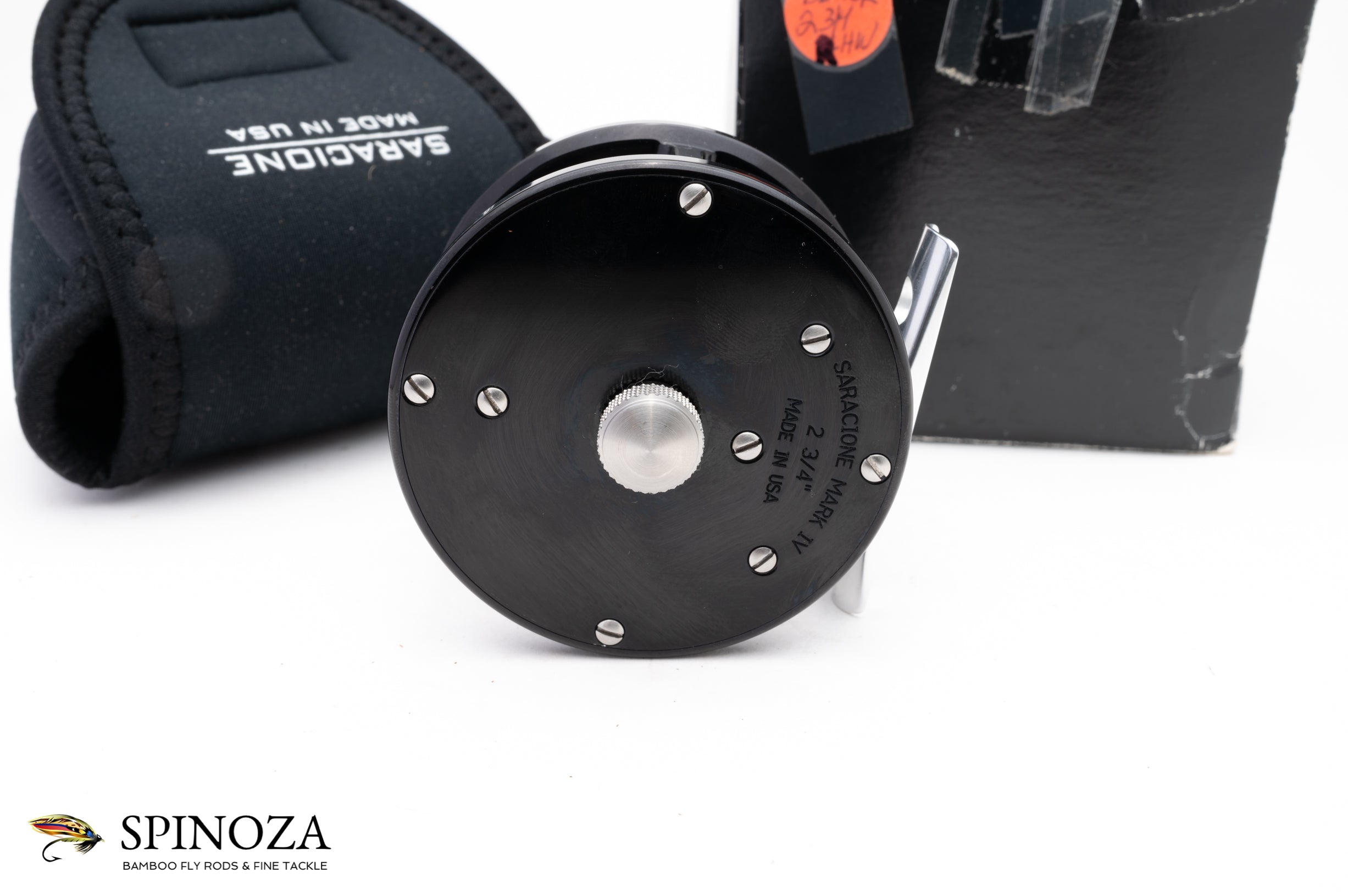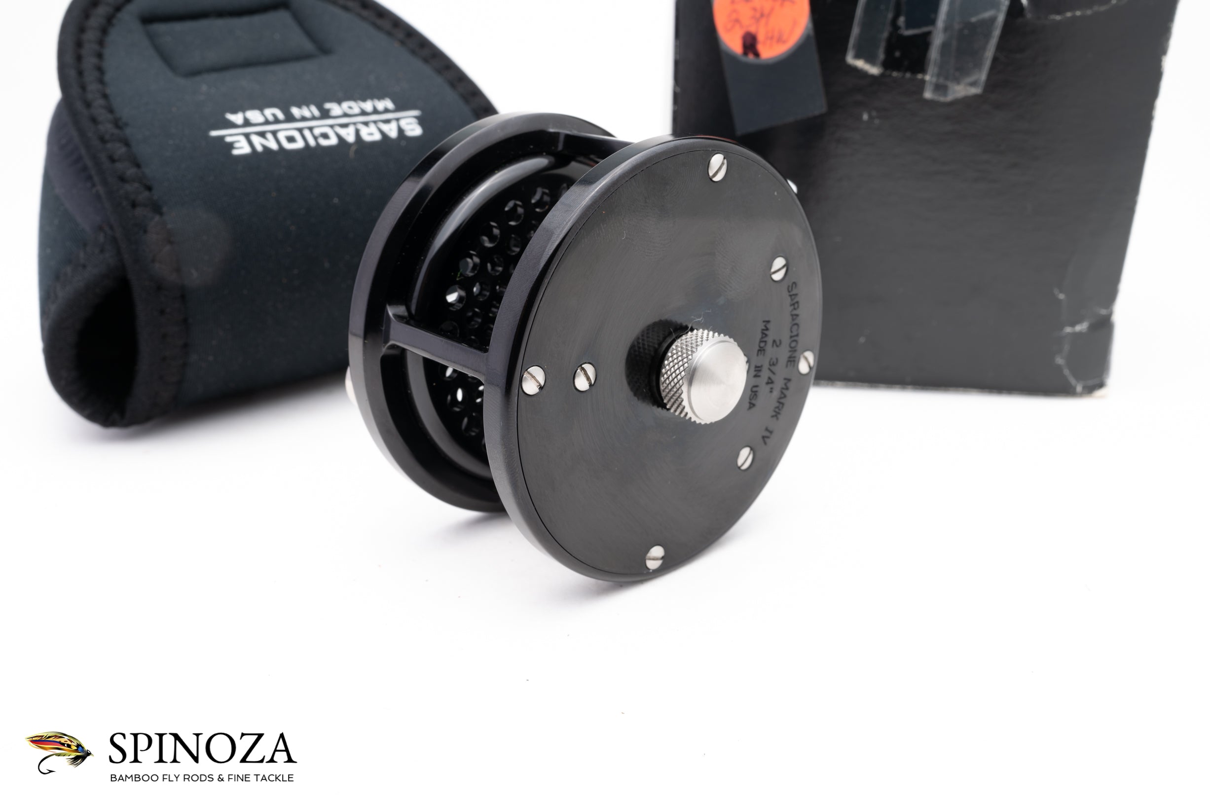 A very nice Joe Saracione Mark IV trout Fly Reel, 2 3/4" in diameter and set up for RHW. This is the rarer all-black model that I believe Joe no longer offers. Mint condition. Fixed check. Serial number "431" stamped into the side of the foot. Machined from 6061-T6 aluminum alloy with a 300 series stainless steel and silicone bronze. The spool width is 13/16” and the reel weighs 5.7 ounces. Designed to hold #4/5/6 lines, and with capacity for 50 yards of 20# dacron when loaded with a DT5F or WF6F. Comes with the original box and neoprene pouch. An excellent little trout reel by one of the best!