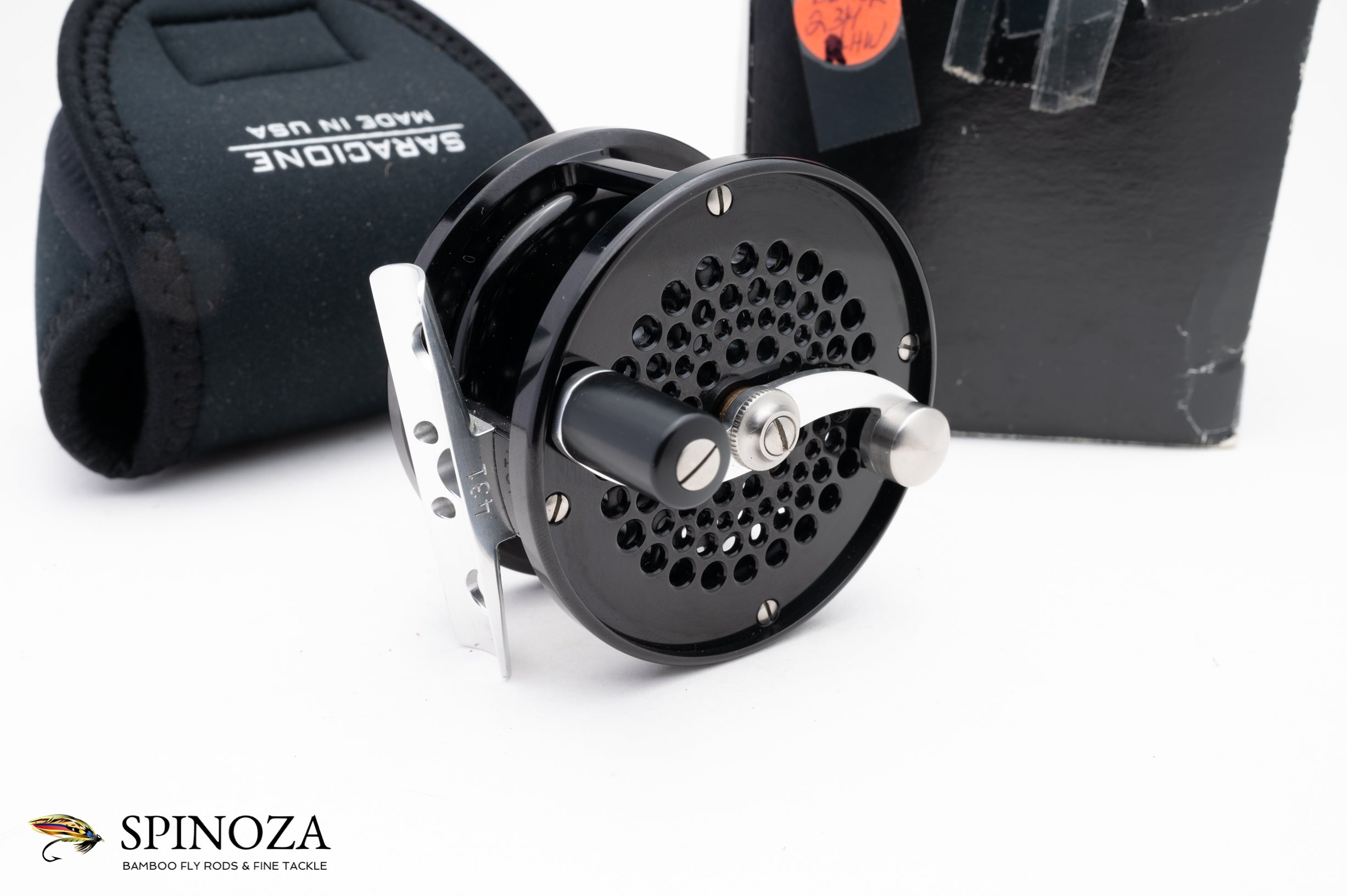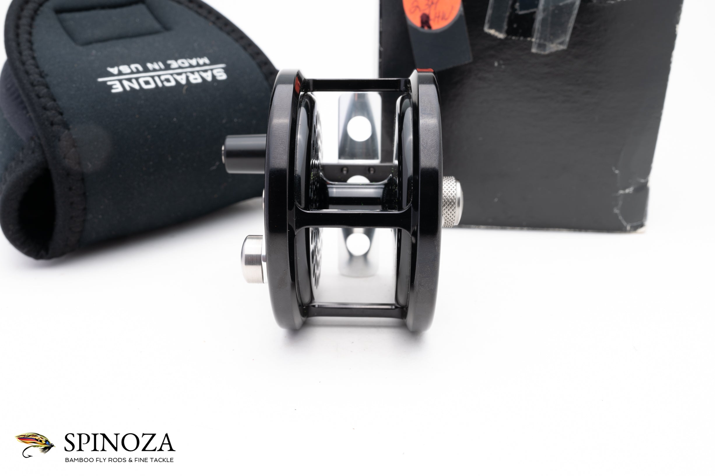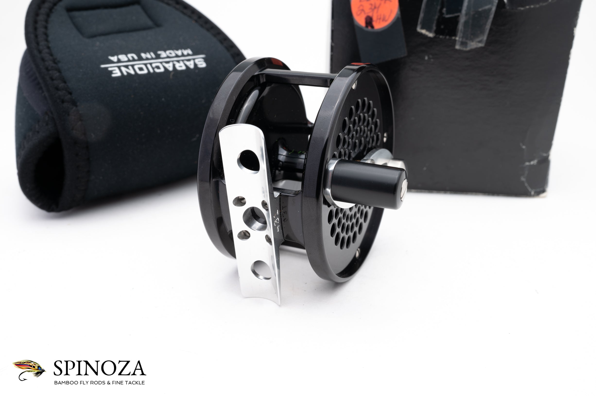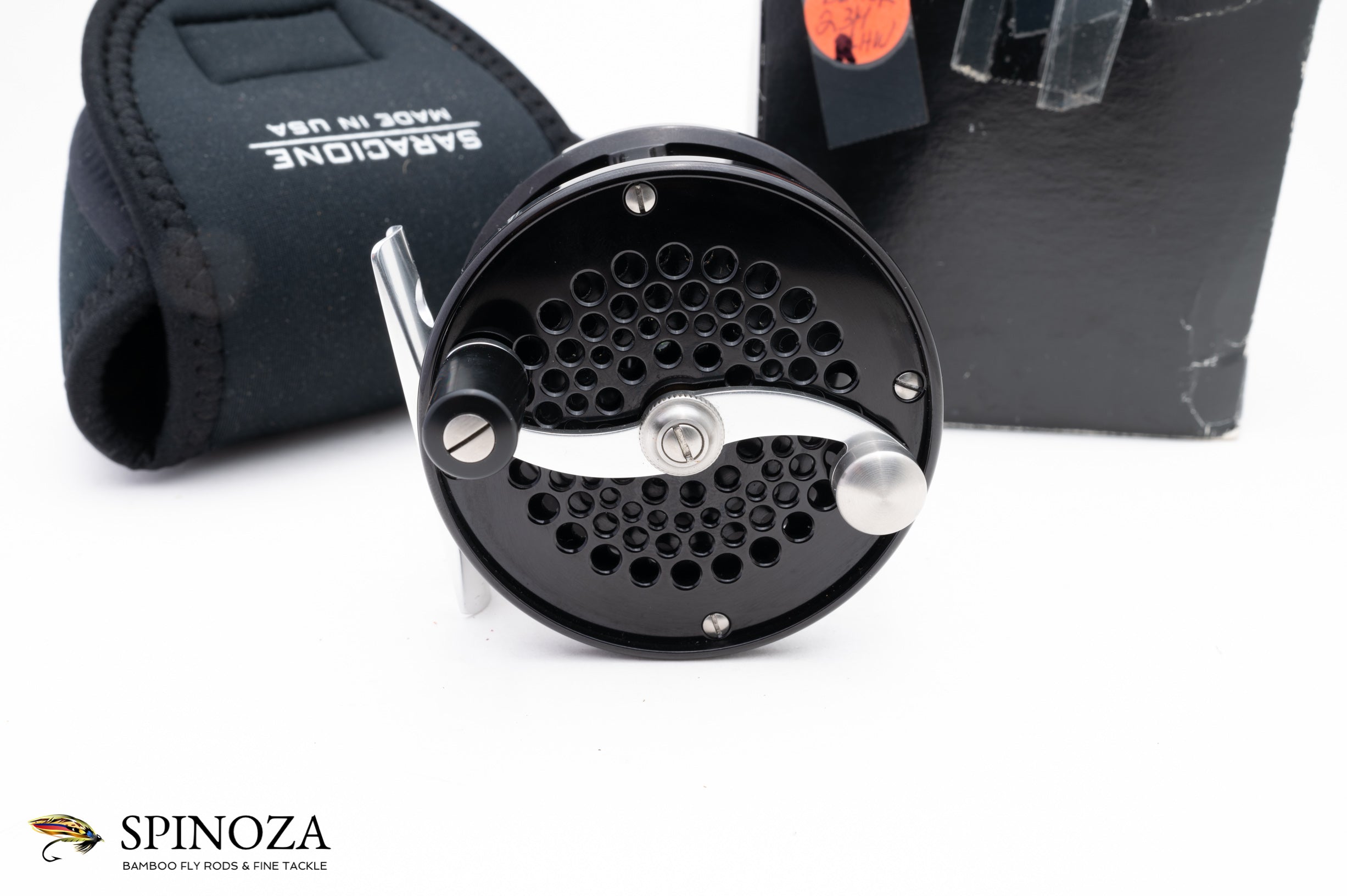A very nice Joe Saracione Mark IV trout Fly Reel, 2 3/4" in diameter and set up for RHW. This is the rarer all-black model that I believe Joe no longer offers. Mint condition. Fixed check. Serial number "431" stamped into the side of the foot. Machined from 6061-T6 aluminum alloy with a 300 series stainless steel and silicone bronze. The spool width is 13/16” and the reel weighs 5.7 ounces. Designed to hold #4/5/6 lines, and with capacity for 50 yards of 20# dacron when loaded with a DT5F or WF6F. Comes with the original box and neoprene pouch. An excellent little trout reel by one of the best!