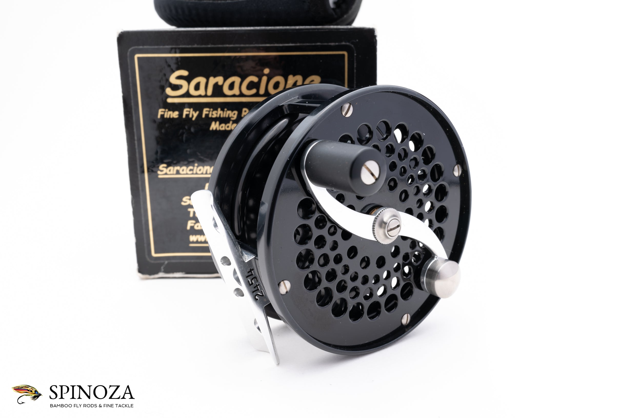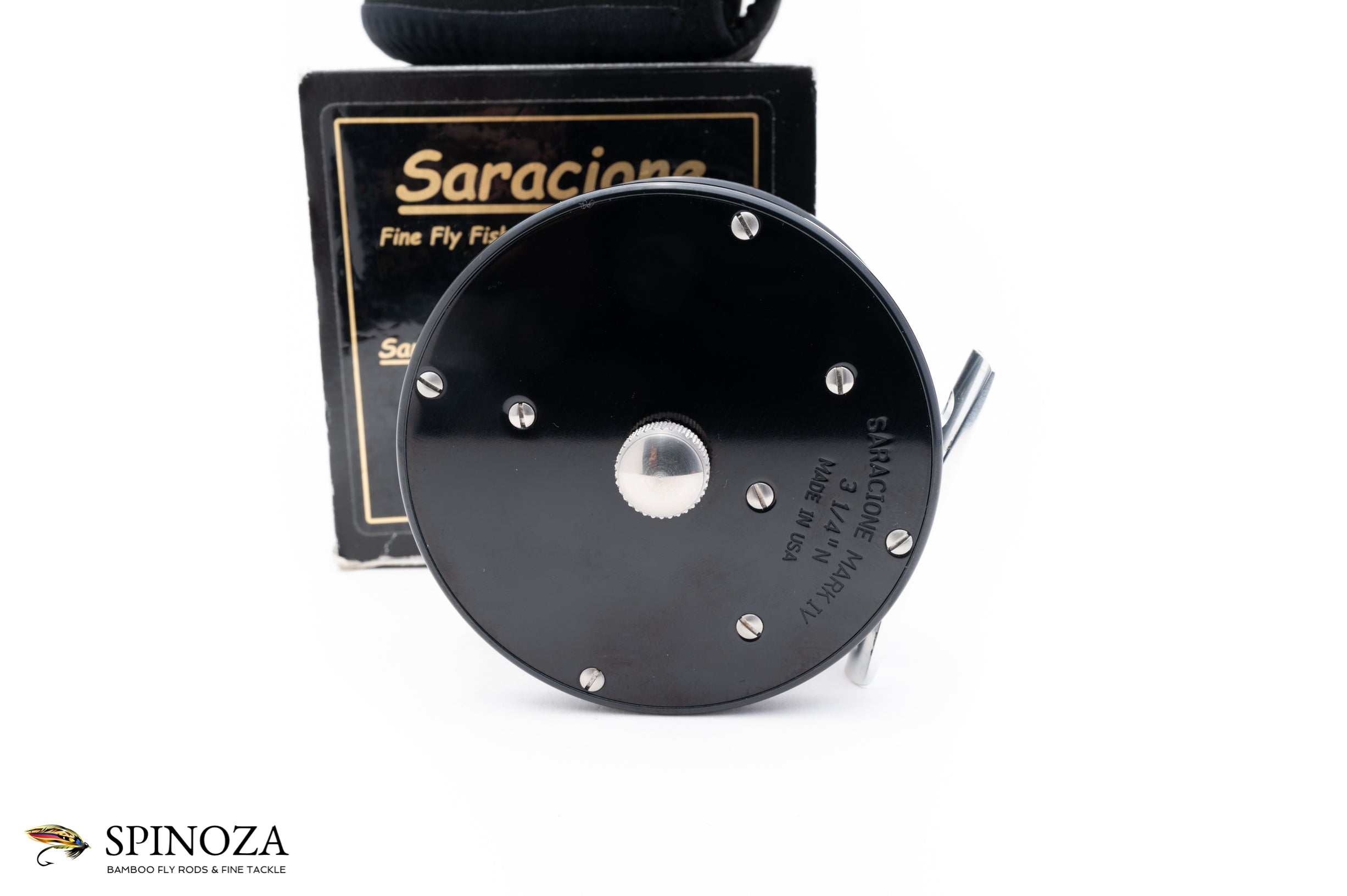 An excellent Saracione 3 1/4" Mark IV trout reel. Feels like a fairly neutral bias though perhaps slightly favoring right hand retrieve. Mint condition, in a superb all black anodized finish. 13/16” spool width with a weight of 6.3 ounces. Perfect for 5/6/7 lines with capacity for 100 yards of 20# backing. A preset fixed gear and pawl drag system for spool control while paying out line to a running fish. No surprise on the phenomenal quality here, with this reel precision machined from 6061-T6 aluminum alloy, 300 series stainless steel and silicone bronze. Comes with original box, neoprene reel pouch, warranty, and instructions.