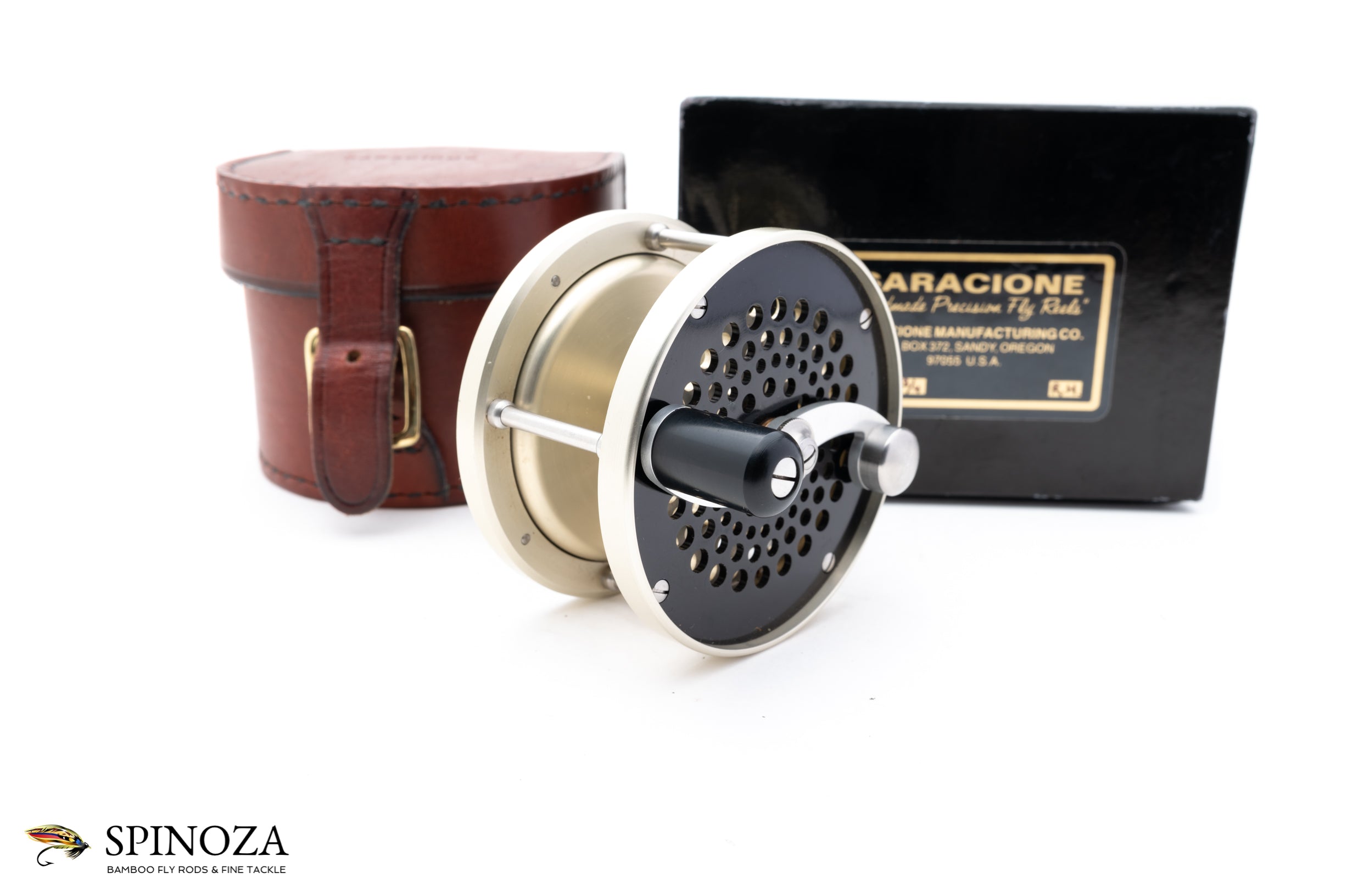 A very nice Saracione MKI fly reel, 2 3/4" diameter and set up for RHW (though can be switched to LHW). Near mint condition with some faint mounting marks on the foot and a few tiny spots of use on the frame edge, but is otherwise perfect. This was an early series of bench-made reels from Joe, with a light champagne anodized frame and black anodized sideplates. Handsome stainless cross-pillars. Nickel silver counterbalance on the handle and the washer cup is nickel silver as well. Unlike many of these reels this one comes in a handsome leather Arne Mason case with "Saracione" embossed on the top and one of Joe's original boxes (there is also an extra screw provided that's tucked into the bottom of the case). A fine example of a light, bench-made reel done in the classic style.