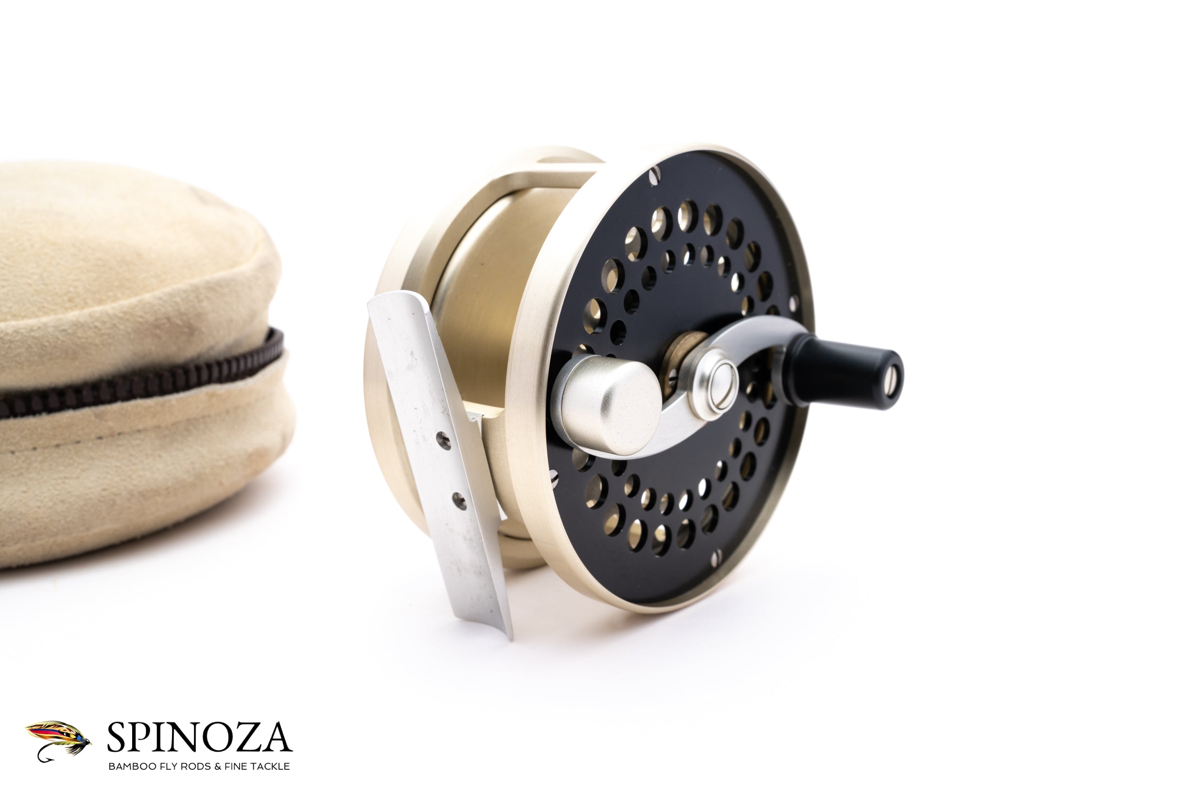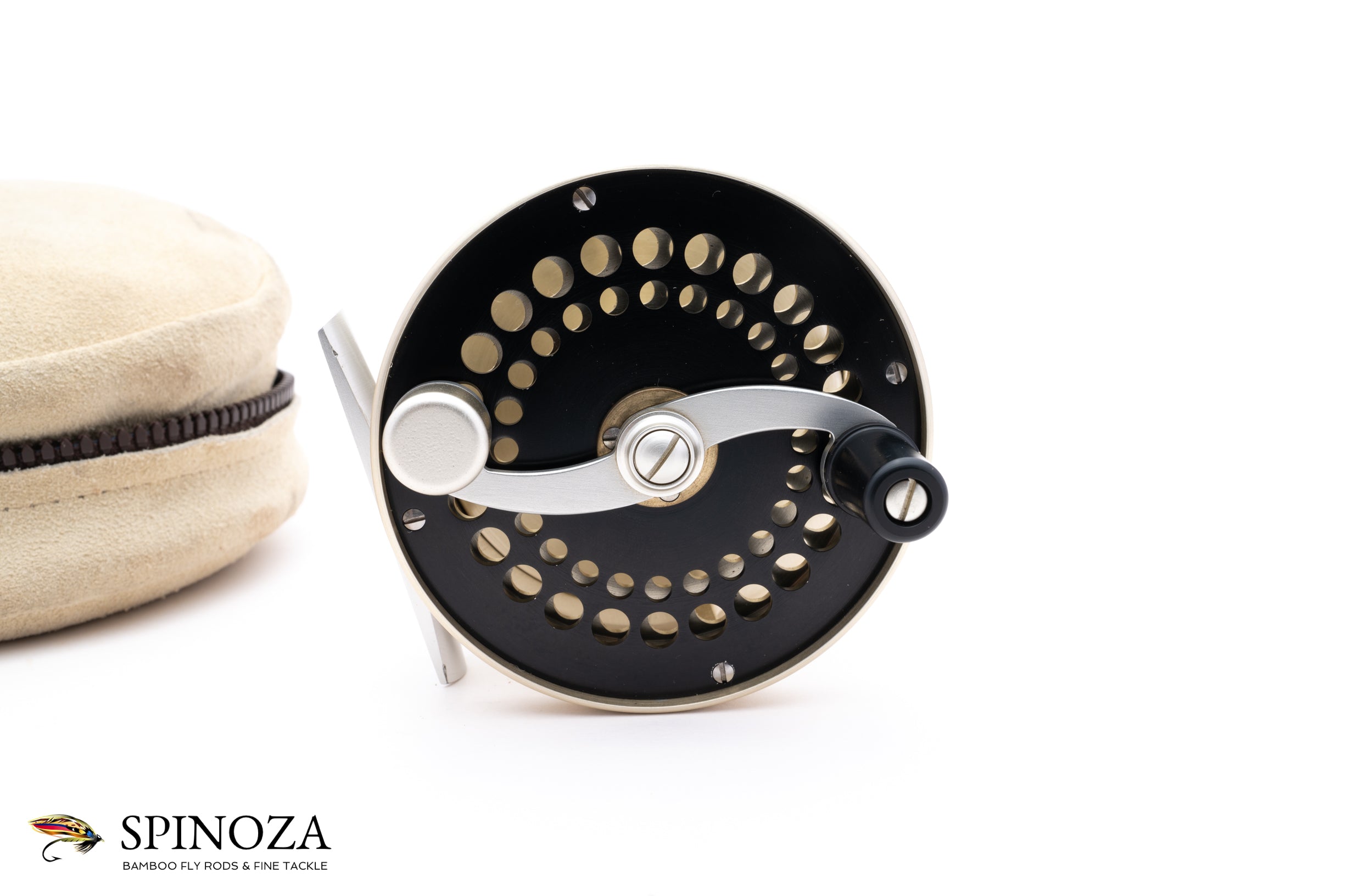 A nice Saracione Classic American (SCA) fly reel, 3 1/4" diameter and set up for RHW. The reel weighs 7.3 ounces with a spool width of 1 3/16". Mint condition. This is the adjustable dial version. The drag direction can be switched by retracting a pin on the side plate and rotating until the side plate comes out, making it easy to flip the the drag or swap out the spool. Black anodized side plates with light gold anodized frame and spool. The serpentine crank handle and foot are silver. A rugged and beautifully machined reel. The original owner of this reel told me that it was part of a display set that Joe used very early in his career to show anglers the reels he was building. Comes in a padded suede leather zipper pouch.