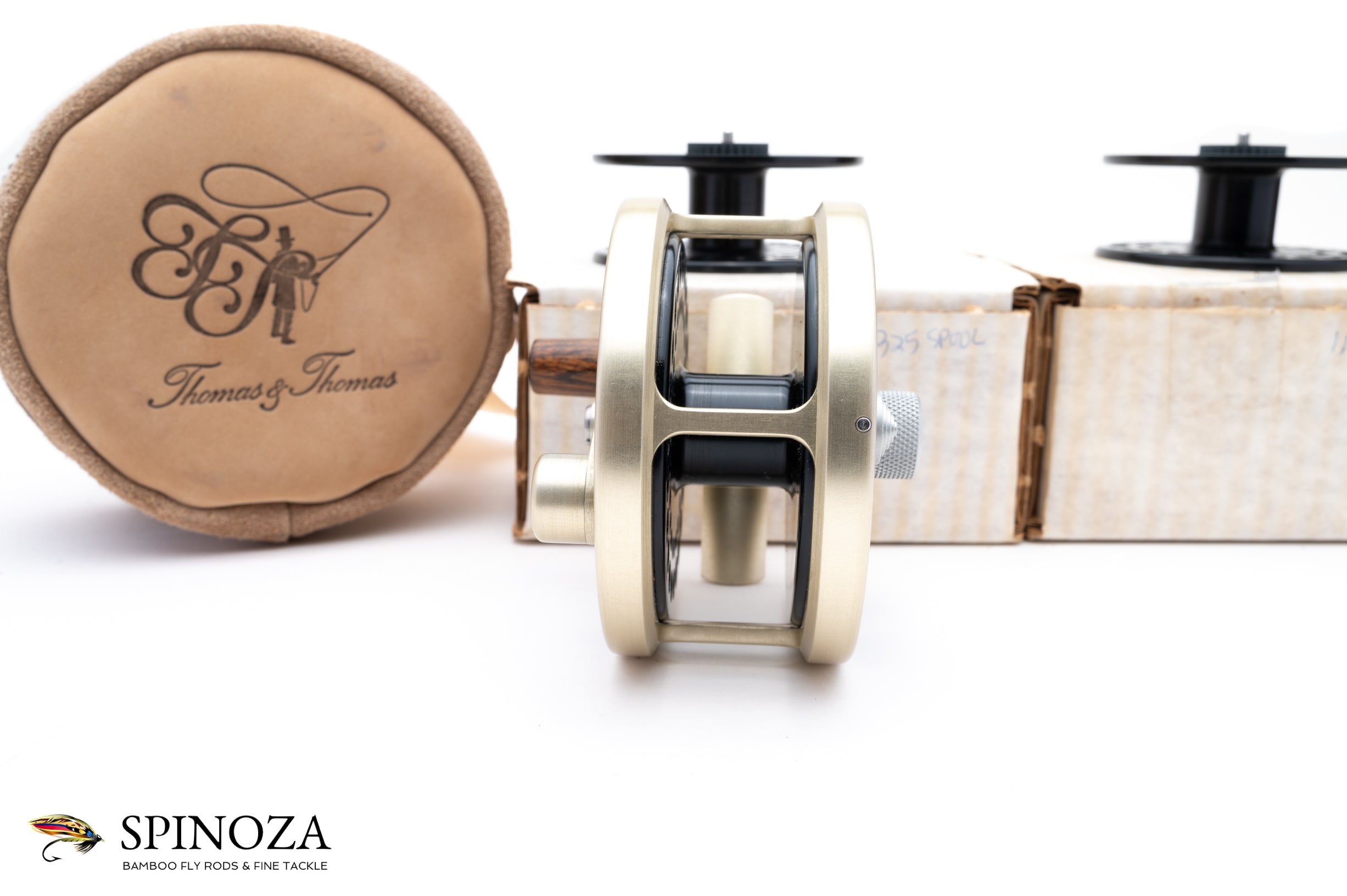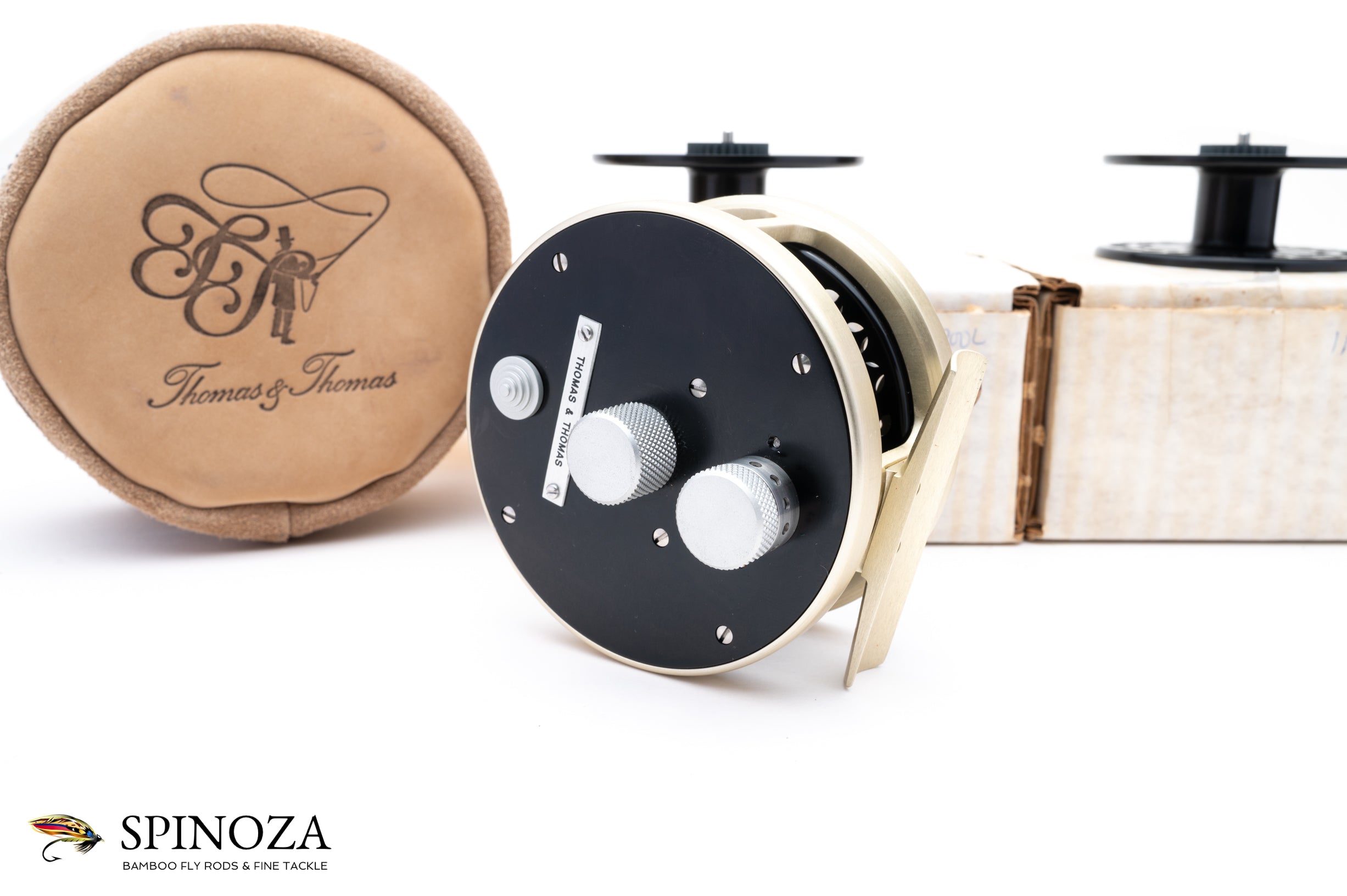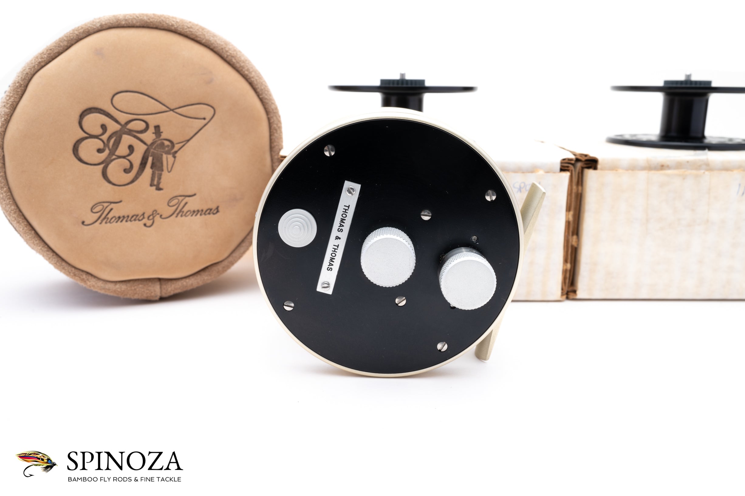 An excellent Saracione SCA (Saracione Classic American) reel with two spare spools made for Thomas and Thomas, 3 1/4" diameter and set up for RHW. Mint, unused condition. The reel weighs 7.6 ounces on my scale and the spool width is approximately .85". Joe made these in the mid-to-late 1980's and this one features a "Thomas and Thomas" nameplate on the backplate. Champagne anodized frame with a black-anodized spool and sideplates. The two spare spools are black anodized as well. The drag is adjusted via a knob on the backplate, and these reels also have an ingenious removable spool system whereby the backplate (and spool) are removable by pushing a sliding knob on the backplate and rotating the plate approximately 90 degrees. The reel packs into a suede, fleece-lined zipper pouch with the T&T logo embossed on the top, and the two spare spools pack into their original cardboard boxes. A very nice offering here that brings together two of the most respected names in the craft.