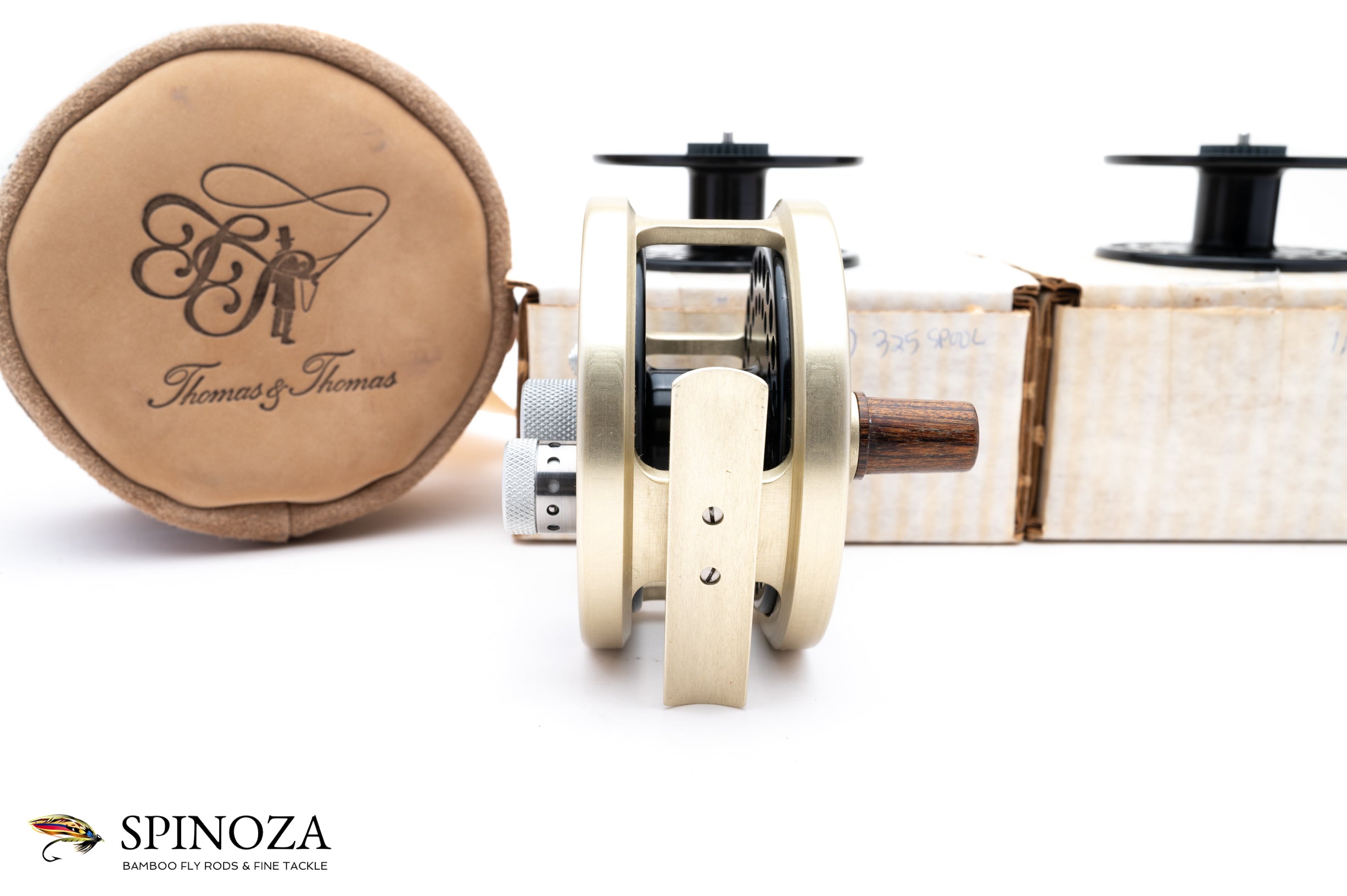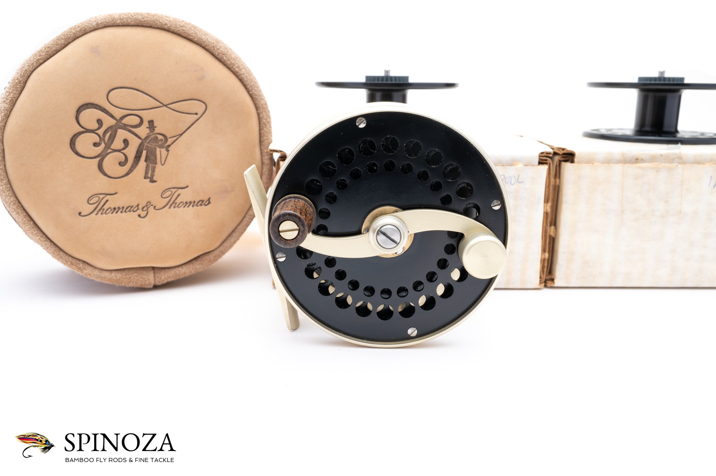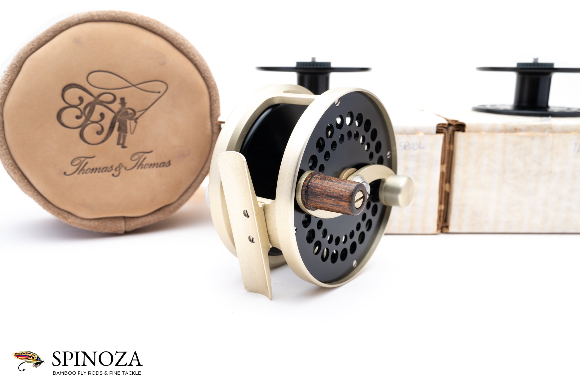 An excellent Saracione SCA (Saracione Classic American) reel with two spare spools made for Thomas and Thomas, 3 1/4" diameter and set up for RHW. Mint, unused condition. The reel weighs 7.6 ounces on my scale and the spool width is approximately .85". Joe made these in the mid-to-late 1980's and this one features a "Thomas and Thomas" nameplate on the backplate. Champagne anodized frame with a black-anodized spool and sideplates. The two spare spools are black anodized as well. The drag is adjusted via a knob on the backplate, and these reels also have an ingenious removable spool system whereby the backplate (and spool) are removable by pushing a sliding knob on the backplate and rotating the plate approximately 90 degrees. The reel packs into a suede, fleece-lined zipper pouch with the T&T logo embossed on the top, and the two spare spools pack into their original cardboard boxes. A very nice offering here that brings together two of the most respected names in the craft.