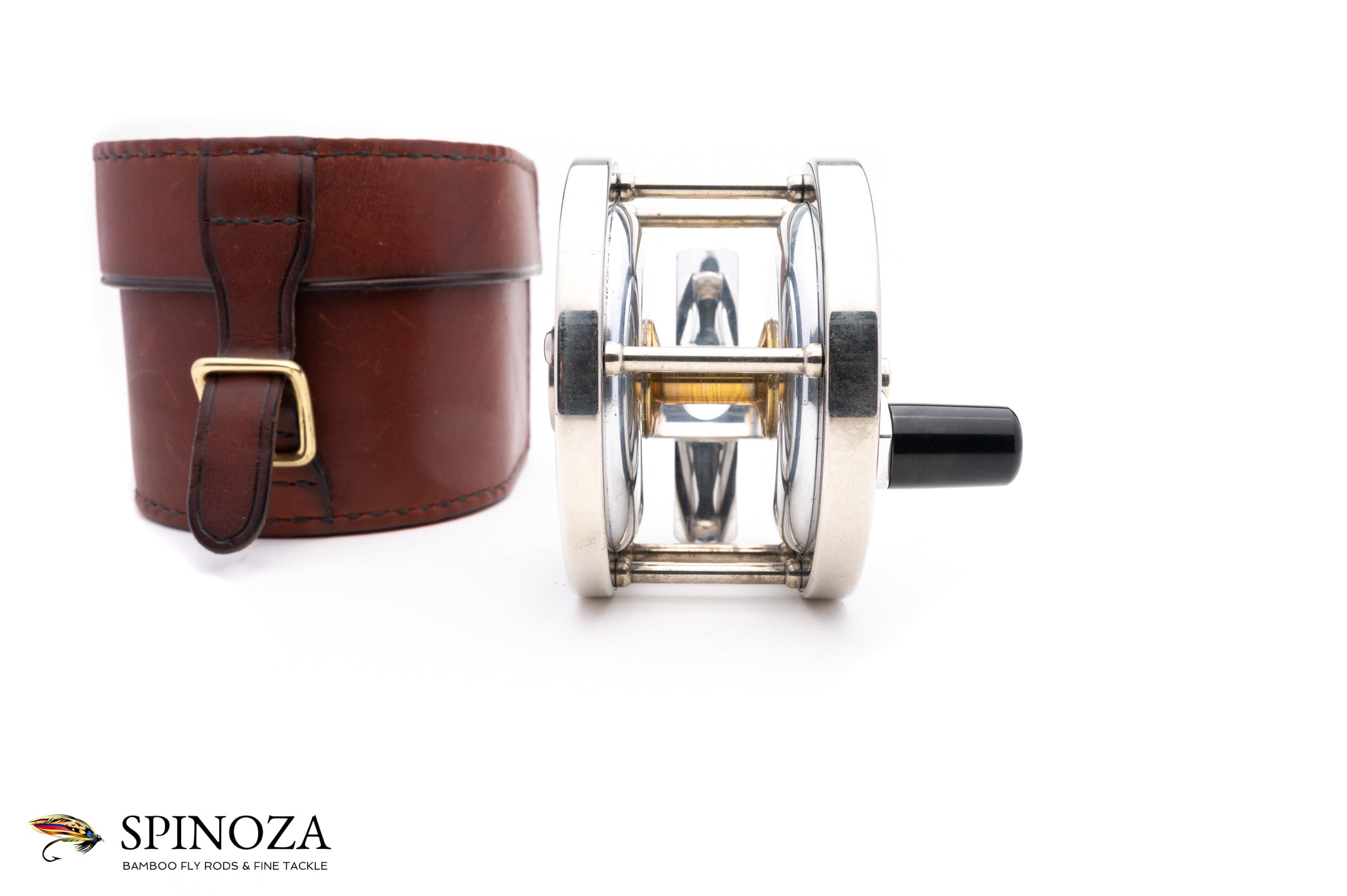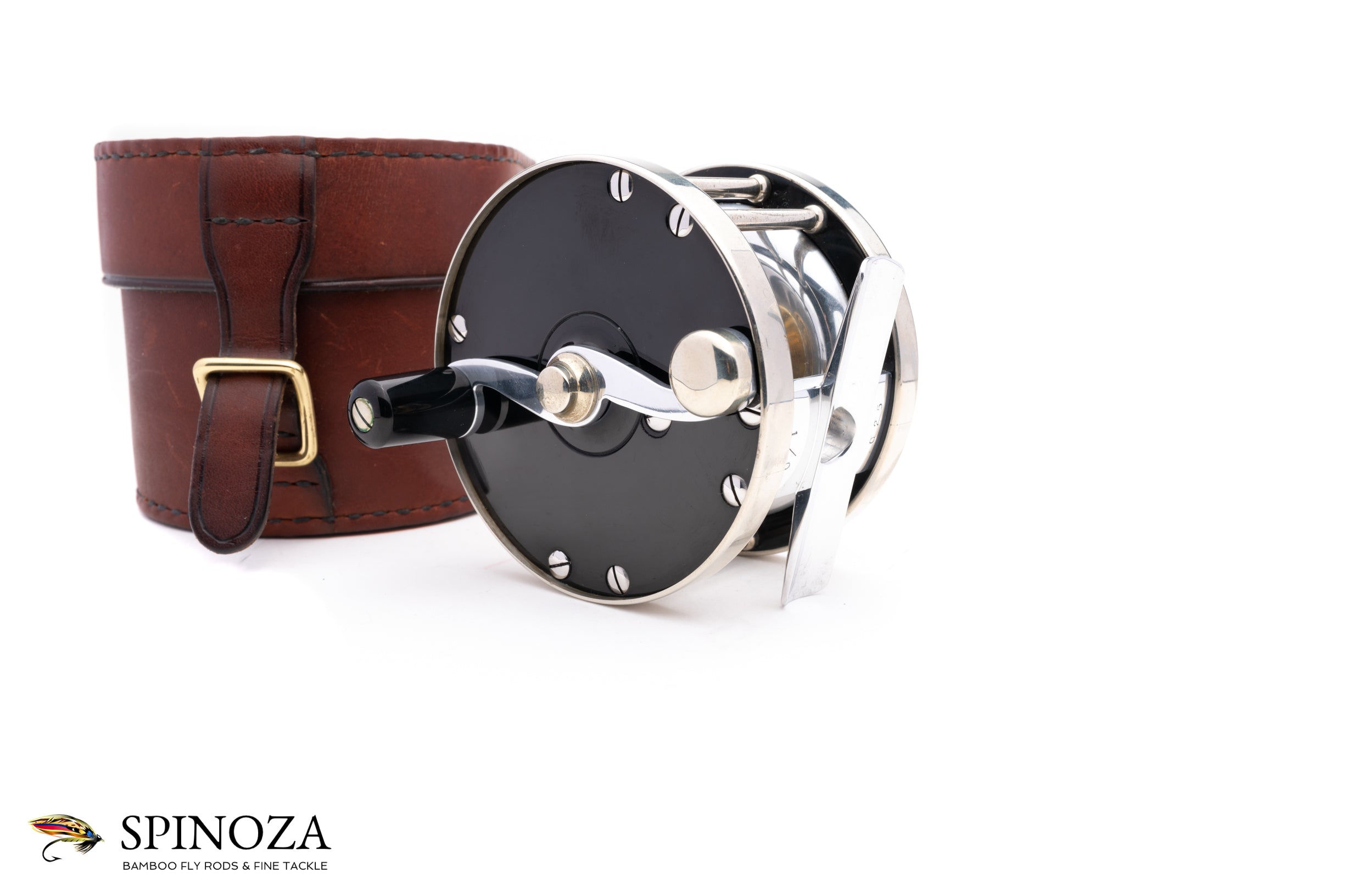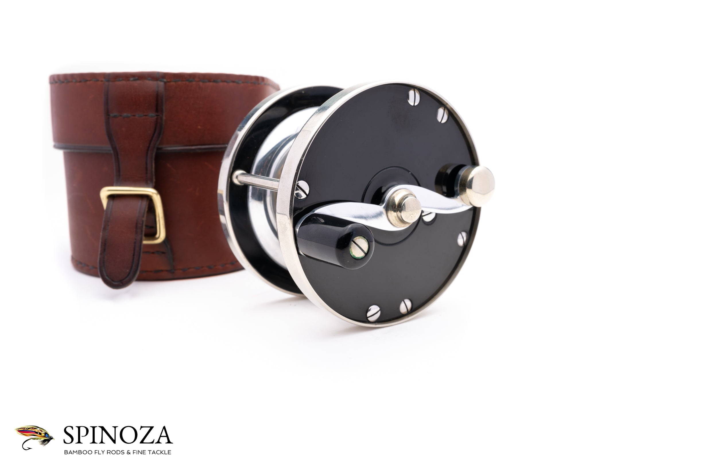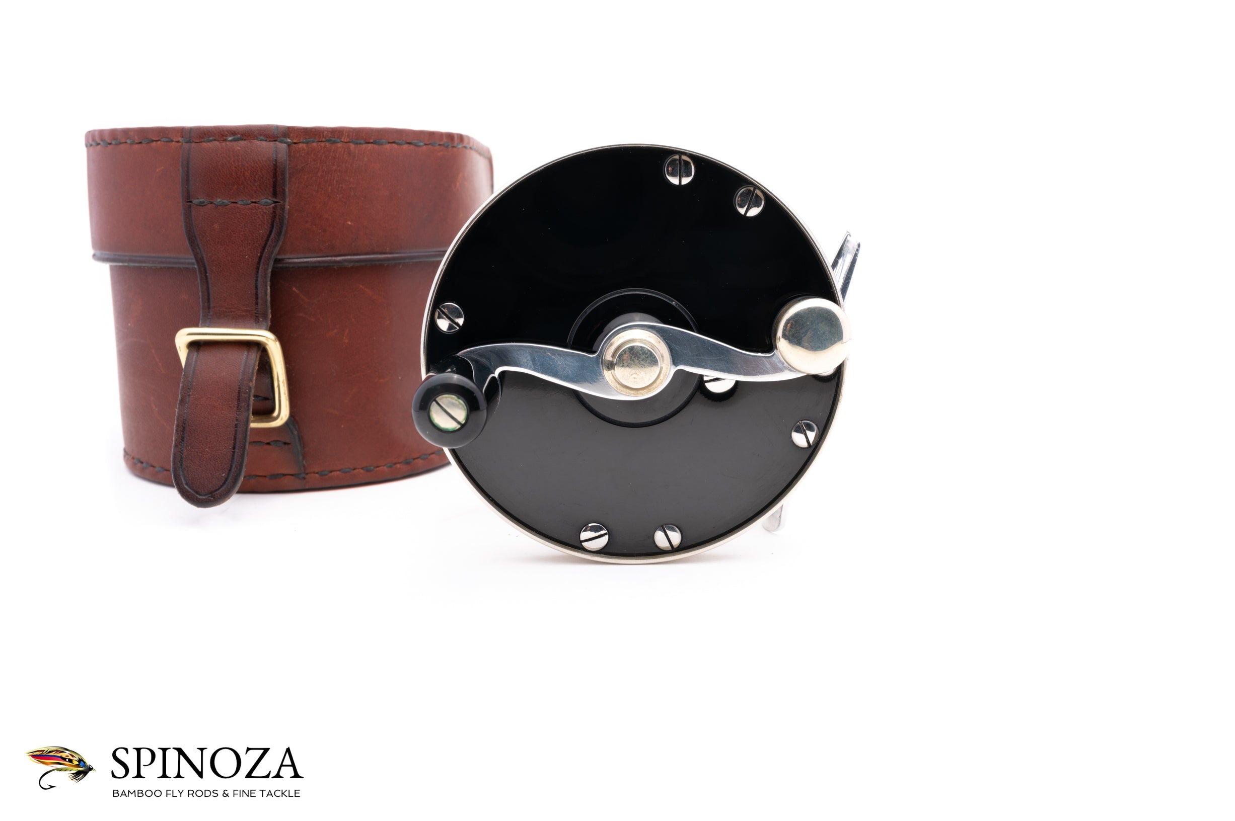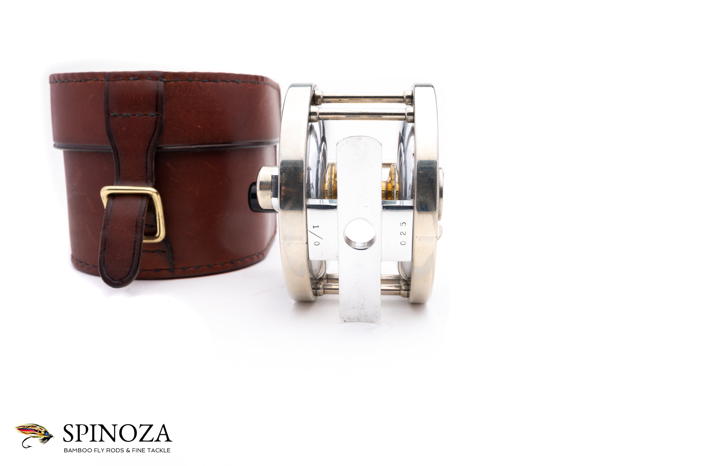 A rare Joe Saracione Tobique 1/0 Limited Edition fly reel in 1/0 size. This was from a set of Vom Hofe replicas that Joe made in the 1990's and he only made 20 of these (I believe he had planned to do fifty in total, and the serial numbers were chosen by the customers, hence this one as serial #025). This reel is a flawless reproduction of the original Tobique complete with highly polished hard rubber sideplates and nickel silver rims. It measures 3 3/16" diameter with a 1 5/16" cross pillar width, 2:1 ratio multiplying retrieve, a rear 7-position drag, two rolling cross pillars, and a bronze spindle. It weighs 9.8 ounces on my scale, and is designed to hold #7/8 lines with approximately 100 yards of 30lb backing. This one is in near mint condition with a few very tiny marks on the frame edge in one area on the rims and some tiny mounting marks on the foot. Very clean otherwise. Set up for LHW. The reel comes in a hard leather Arne Mason case embossed with "Saracione" and the reel size. A superb homage to one of Vom Hofe's best reels by a modern master!