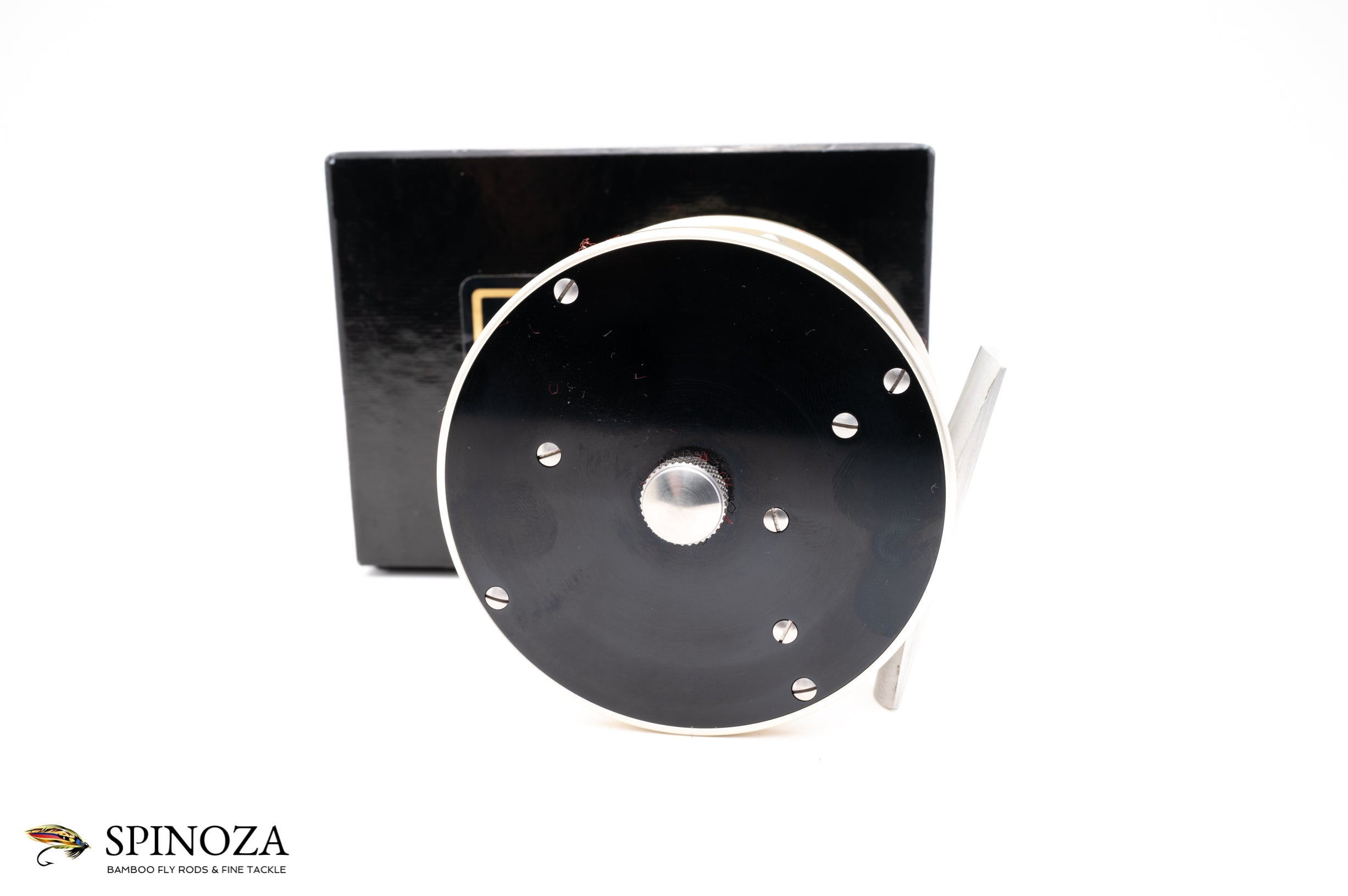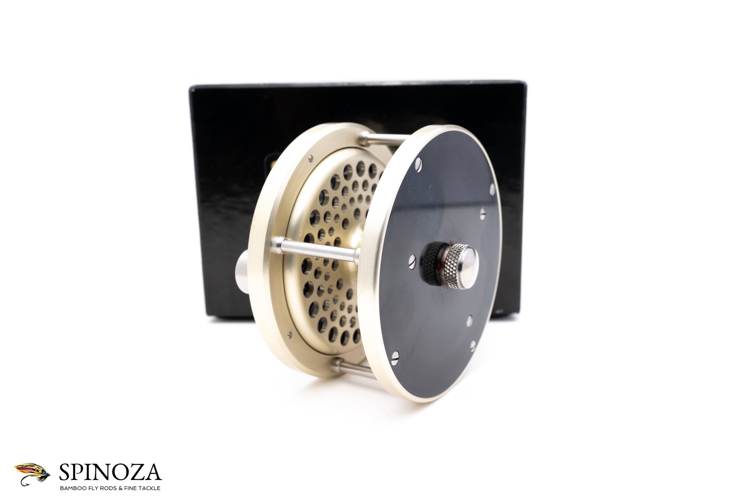 A nice Saracione Mark I Trout Reel, 3" in diameter and currently set up for LHW. Approximately 13/16" spool width. New unused reel, and I believe these were bench-made by Joe. "Saracione" stamped into the underside of the foot crossbar. Smooth fixed drag. Light champagne anodized frame with black anodized sideplates and stainless steel pillars. The counterbalance and winding-arm washer-cup are nickel silver. Easily switched to RHW if needed. Comes with original box, red velvet pouch and warranty card.