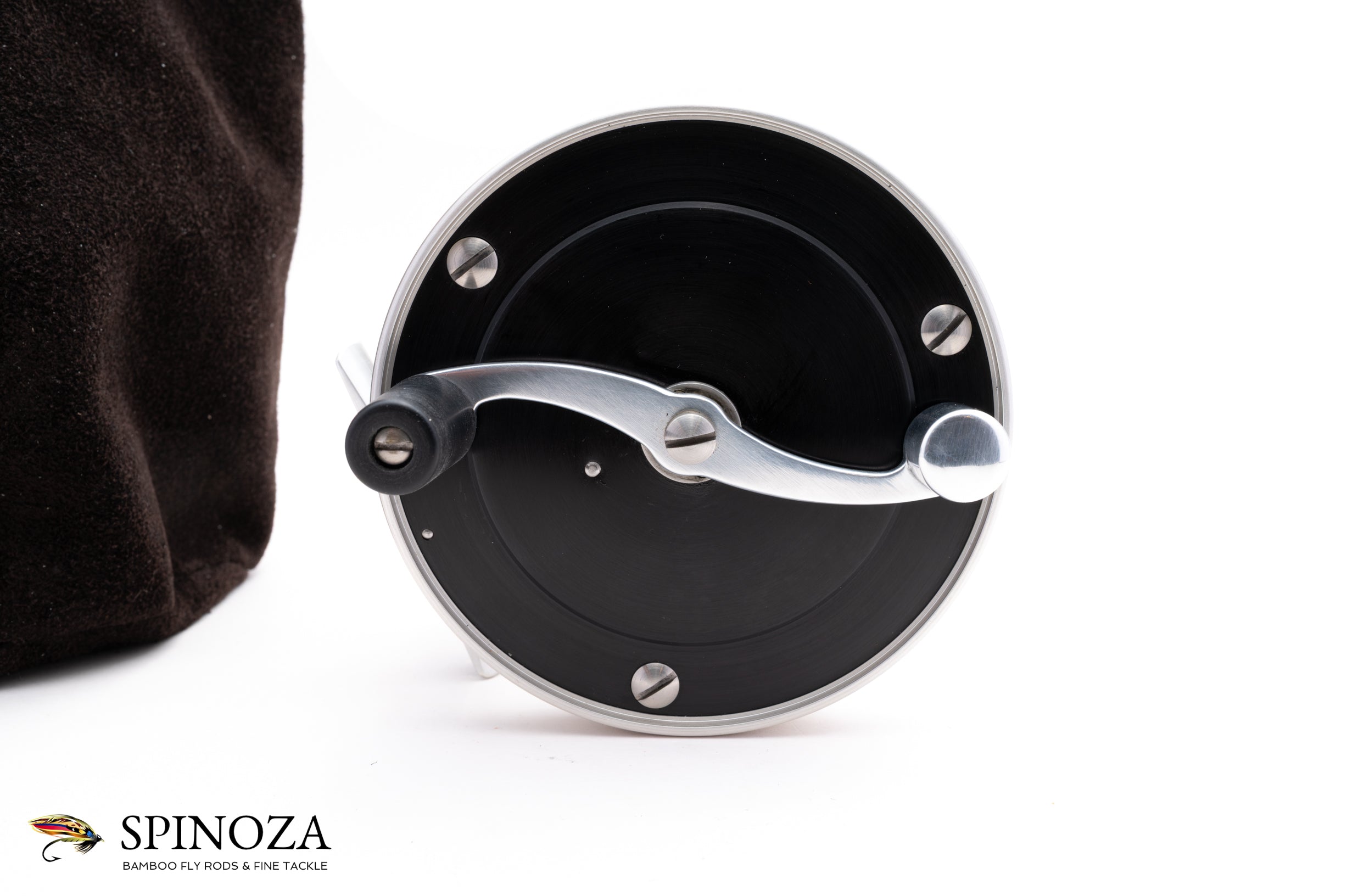 A gorgeous Bogdan model 400 salmon reel, set up for RHW. This is one you don't see every day! The largest model in the standard Bogdan catalog, this reel has a 4" diameter with a 1 5/8" spool width. It weighs approximately 16.5 ounces and was designated as having capacity to carry a #12 line and 275 yards of backing. It should accommodate just about any modern shooting head or mid or long belly spey line and would match up perfectly for rods 14' and up. We probably get more requests to "please find me one of these" than just about any other Bogdan model. Best of all this reel is mint, and unfished. All silver color frame, foot, serpentine handle, oil port cover, poacher's knob, and Bogdan nameplate. Black sideplates. "400" is stamped into the underside of the foot. It comes in the original black suede drawstring pouch. A very hard-to-find model here that's perfect for the Restigouche, Norway, the larger Scottish rivers, or really anywhere salmon or steelhead swim in large rivers. This would make for a fantastic centerpiece in any serious collection of Bogdans or American fly reels more broadly.