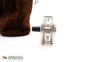 A nice Bogdan Baby Trout reel, set up for RHW. Excellent lightly used condition, with some minor rim rash in the "resting spot" on the frame edges and very minor cosmetic wear elsewhere. 2 3/4" diameter with a 3/4" spool width. Black sideplates with a very light champagne frame and spool. The foot, serpentine handle, oil cap, and nameplate are silver. The backplate has the original owner's name professionally engraved, along with an engraved caricature of Al Ellis, a well known figure in the Arizona fly fishing community, who, I am told, helped procure reels for friends and customers. The sideplate and spool are both ventilated on the crank side. Perfect mechanical condition with a fixed drag. The reel packs into the original brown leather suede bag.