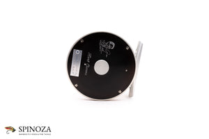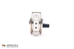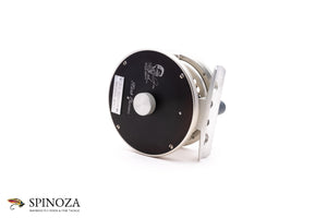 A superb Bogdan Baby Wide trout reel, set up for RHW. 2 3/4" diameter with a 31/32" spool width. I could find no sign of use on this reel. Black-anodized sideplates (as is sometimes the case, they have a slight copper undertone to them) with a clear-anodized aluminum colored frame, crank, oil port, nameplate, and foot. Perfect mechanically with a nice fixed click. The backplate has the original owner's name professionally engraved in a flowing script, along with an engraved caricature of Al Ellis, a well known figure in the Arizona fly fishing community, who, I am told, helped procure reels for friends and customers. No bag or pouch.