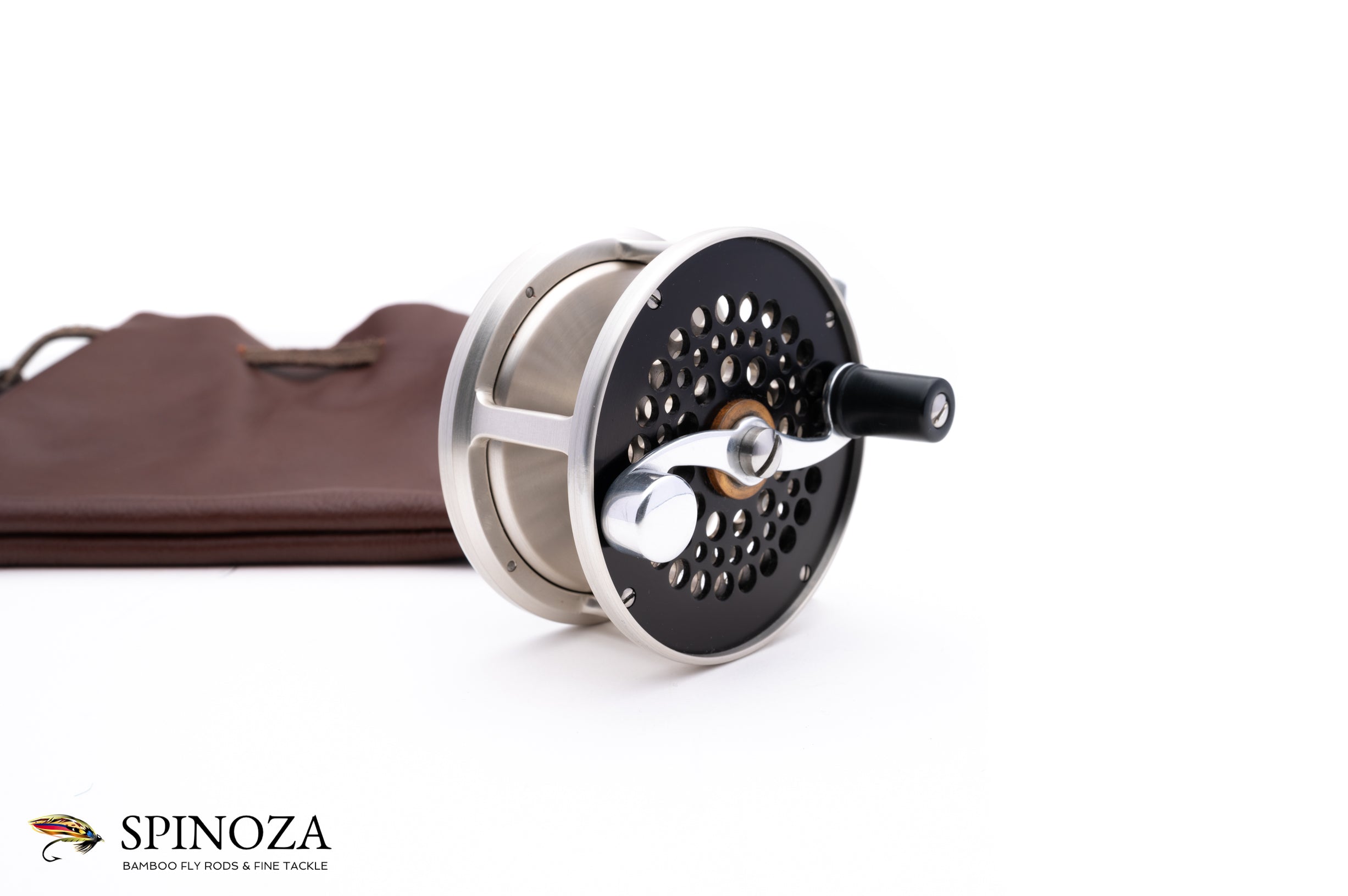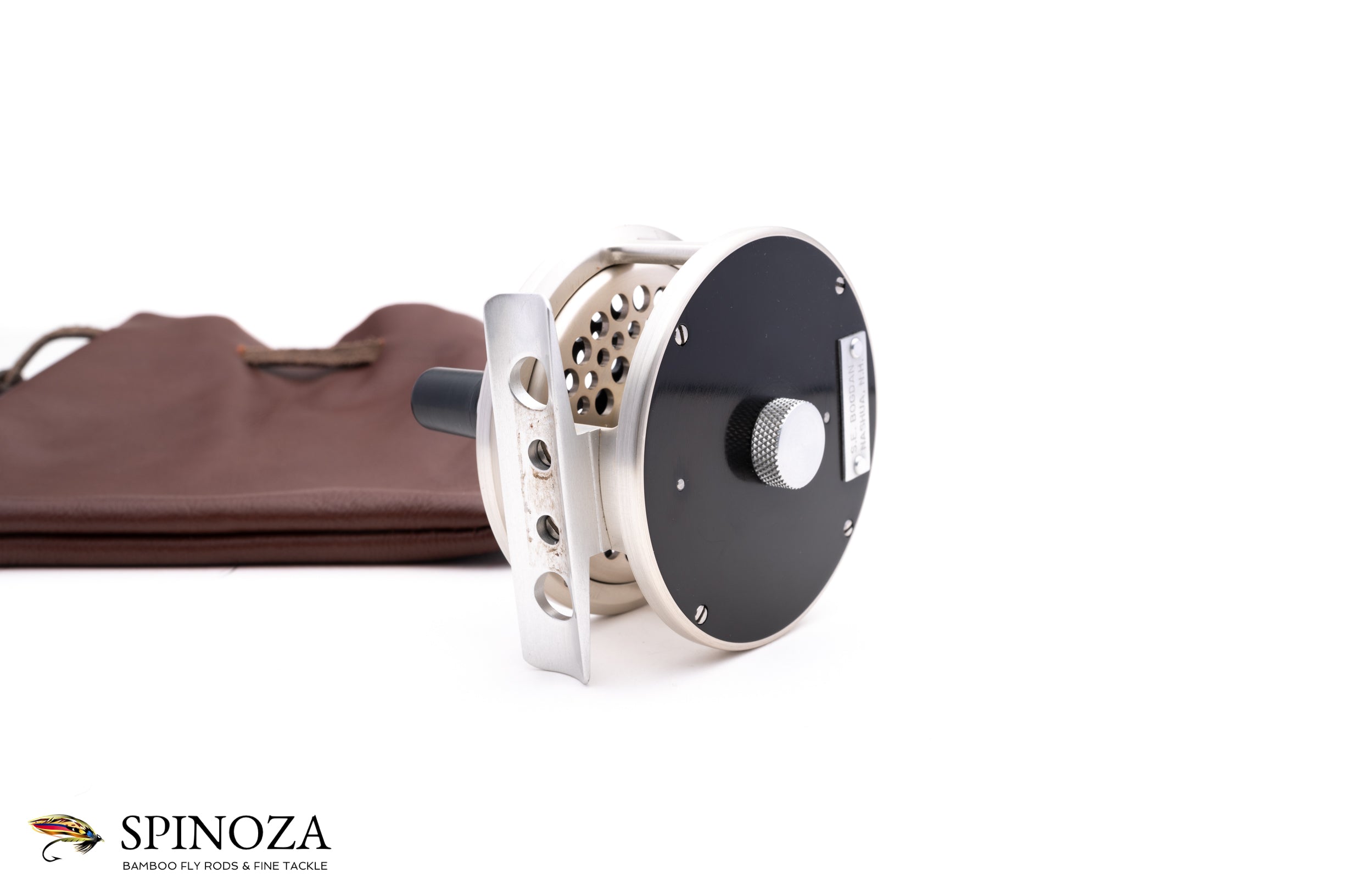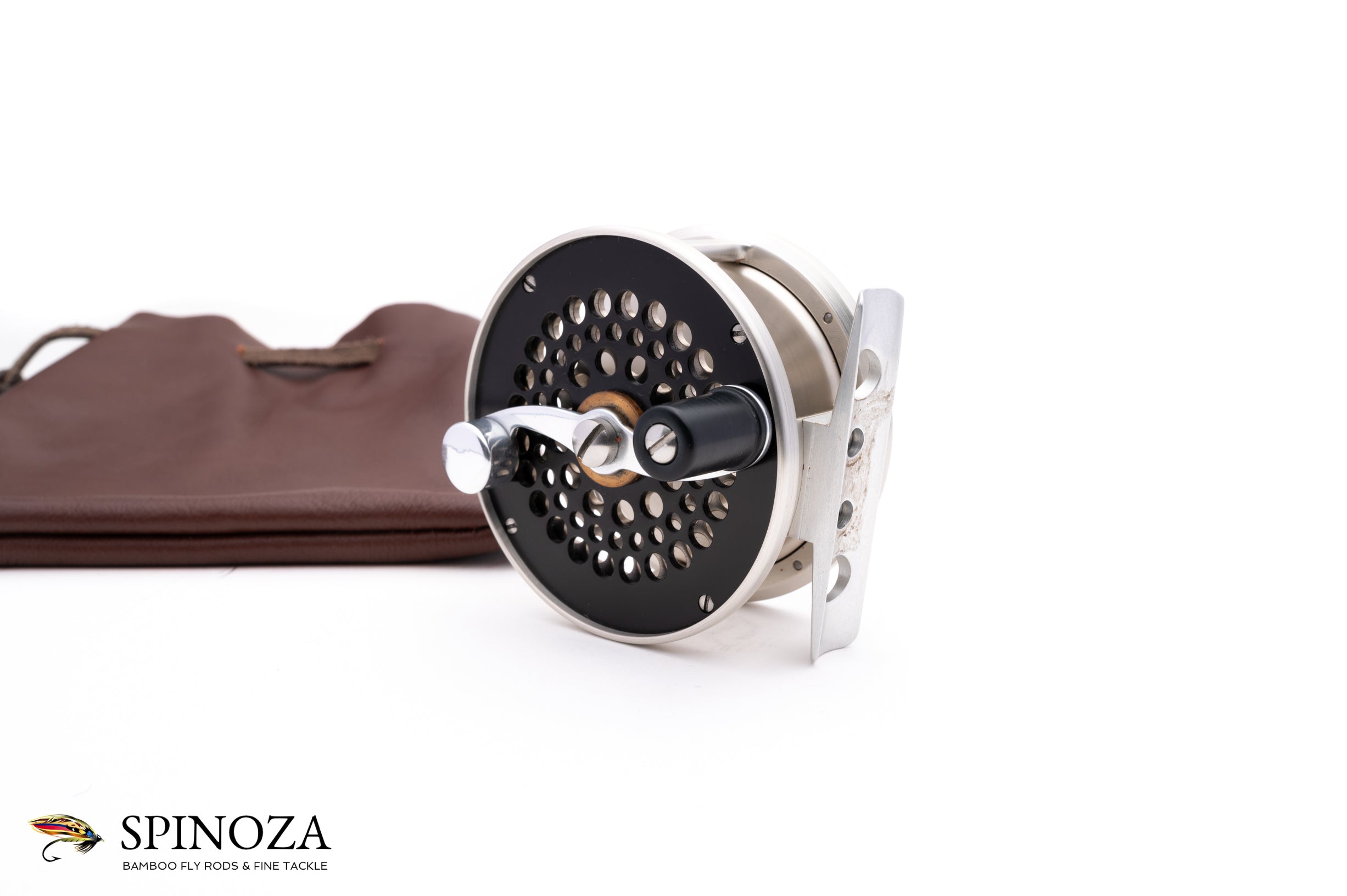 A nice Bogdan Baby Wide trout reel, set up for LHW. 2 3/4" diameter with a 31/32" spool width. Excellent used condition, with a tiny bit of rim rash in one area and a ding on the frame edge, but exceptionally clean otherwise. It's bordering on near mint condition. Perfect mechanically with a nice loud click. Black sideplates and silver colored frame, crank, oil port, nameplate, and foot. Comes in a non-original leather drawstring bag. A nice little trout reel that's perfect for a #4 line and your favorite small stream rod.