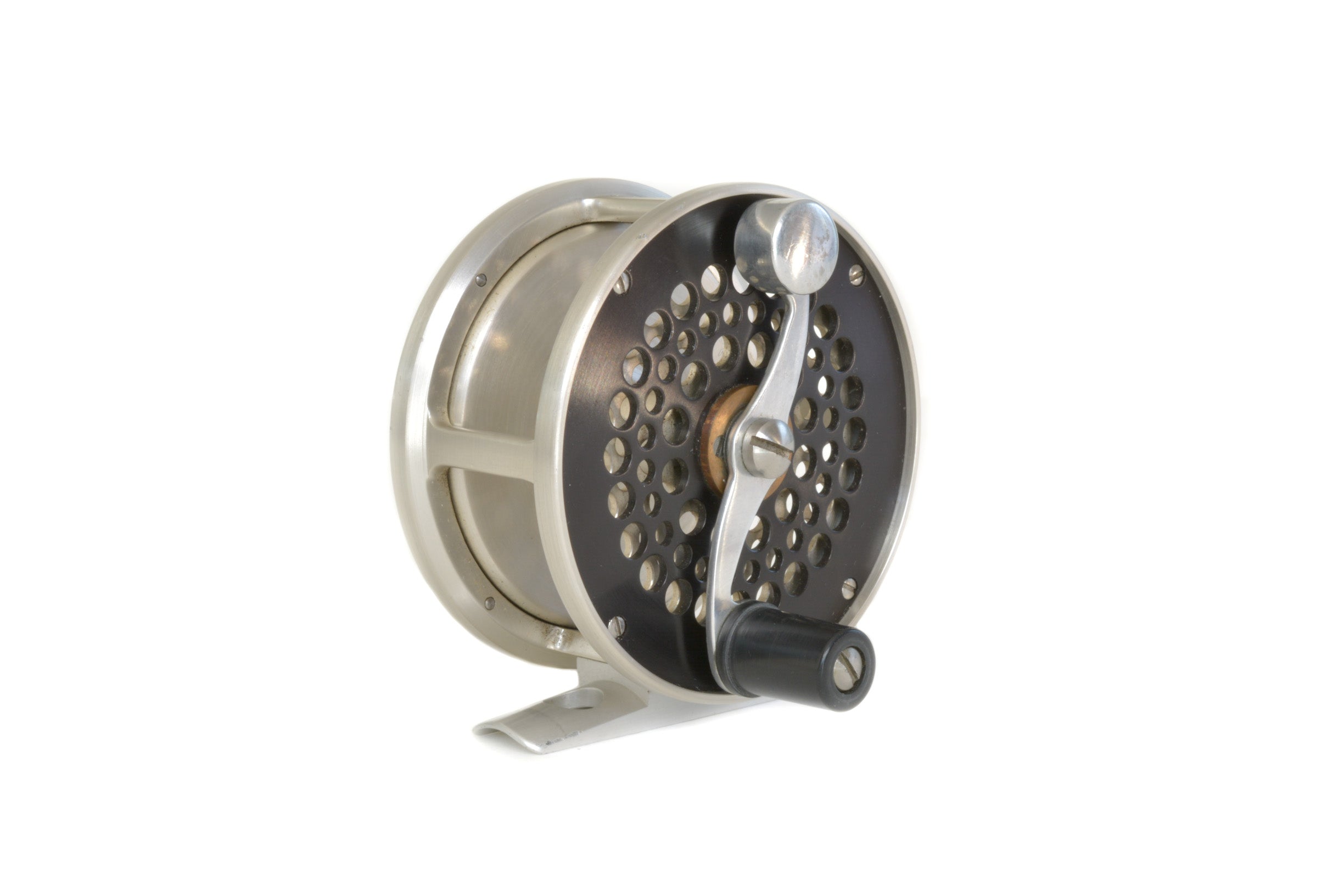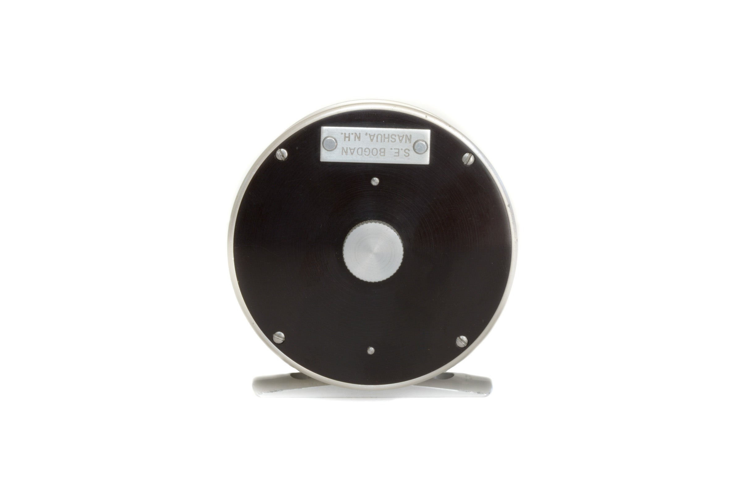 A nice little Bogdan Baby Wide Trout fly reel, set up for LHW. Used but excellent condition. 2 3/4" in diameter with a 31/32" spool width. 4.2 ounces on my scale. The sideplates are in perfect shape, there are some micro scratches on the frame and on the foot from being mounted on a rod. Very nice condition overall though. Capacity for a #4 line with capacity for 50 yards of backing. Fixed click drag. Black anodized side plates. Silver frame, spool, foot, crank handle, button and nameplate. Ventilated side plate and spool on the crank side. No pouch.