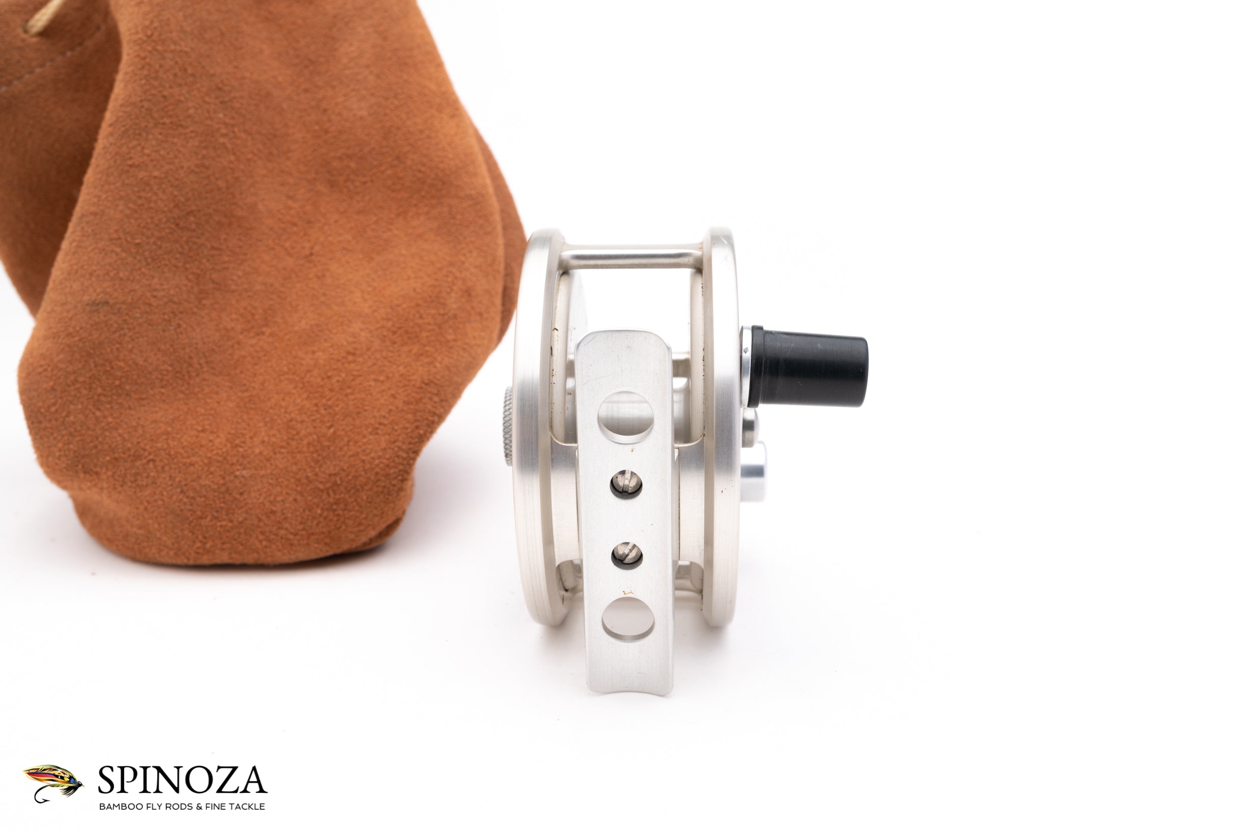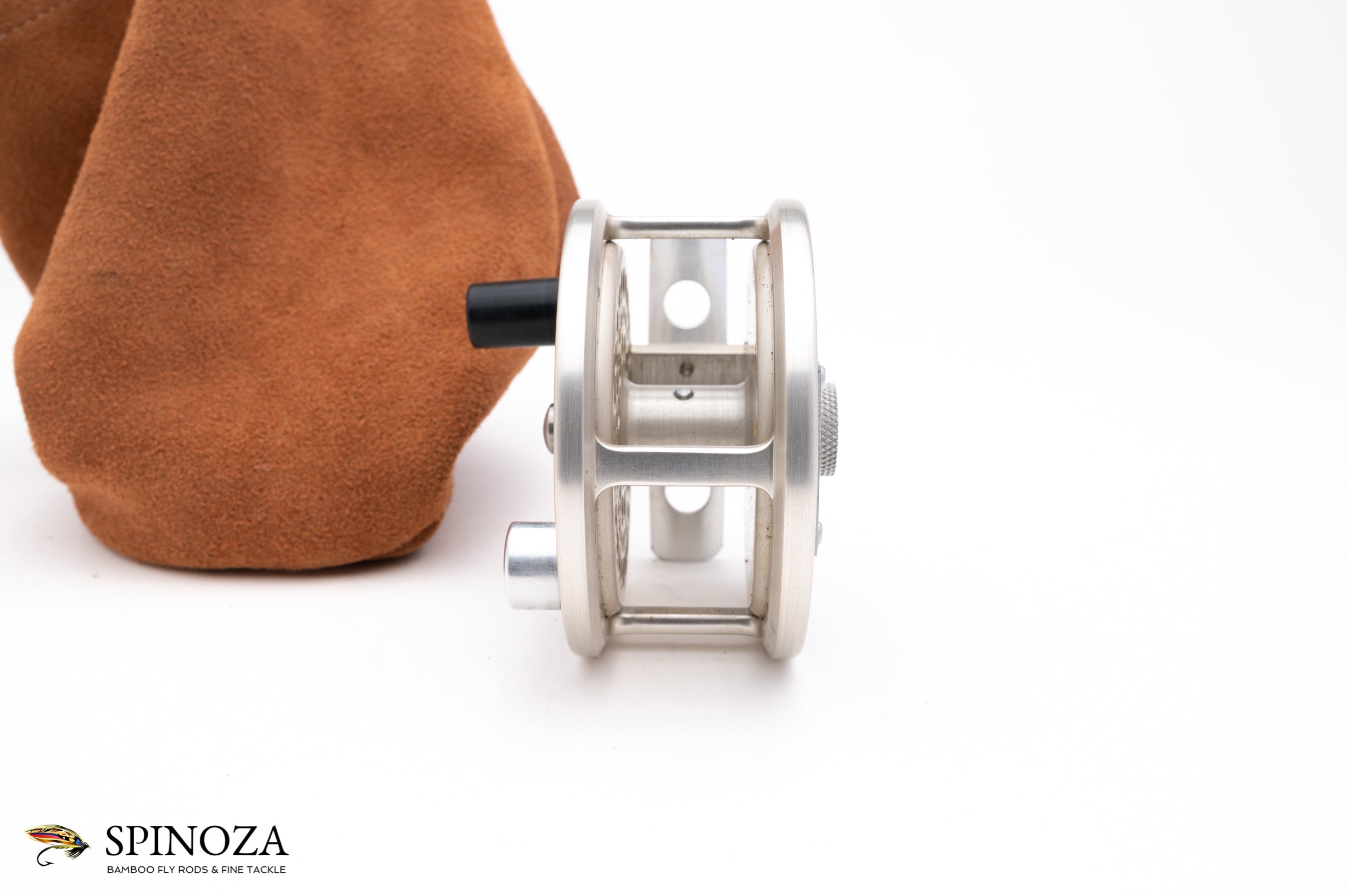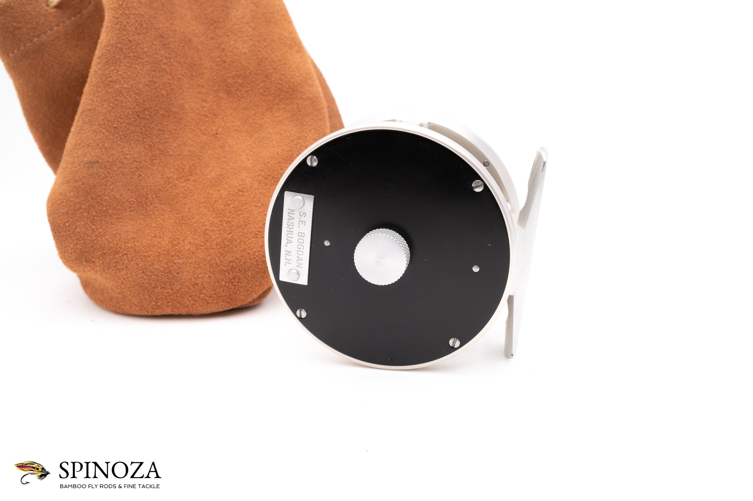 A nice Bogdan Baby Wide trout reel, set up for RHW. 2 3/4" diameter with a 31/32" spool width. Excellent used condition with one modest scratch along the rim being the only sign of use I could find. Perfect mechanically and otherwise clean throughout. Black sideplates and silver colored frame, crank, oil port, nameplate, and foot. The initials "J.C.S." are professionally engraved in small letters on the plate on the crank side. Nice loud click in both directions. Comes in the original suede bag. A nice little trout reel that's perfect for your small stream rod.
