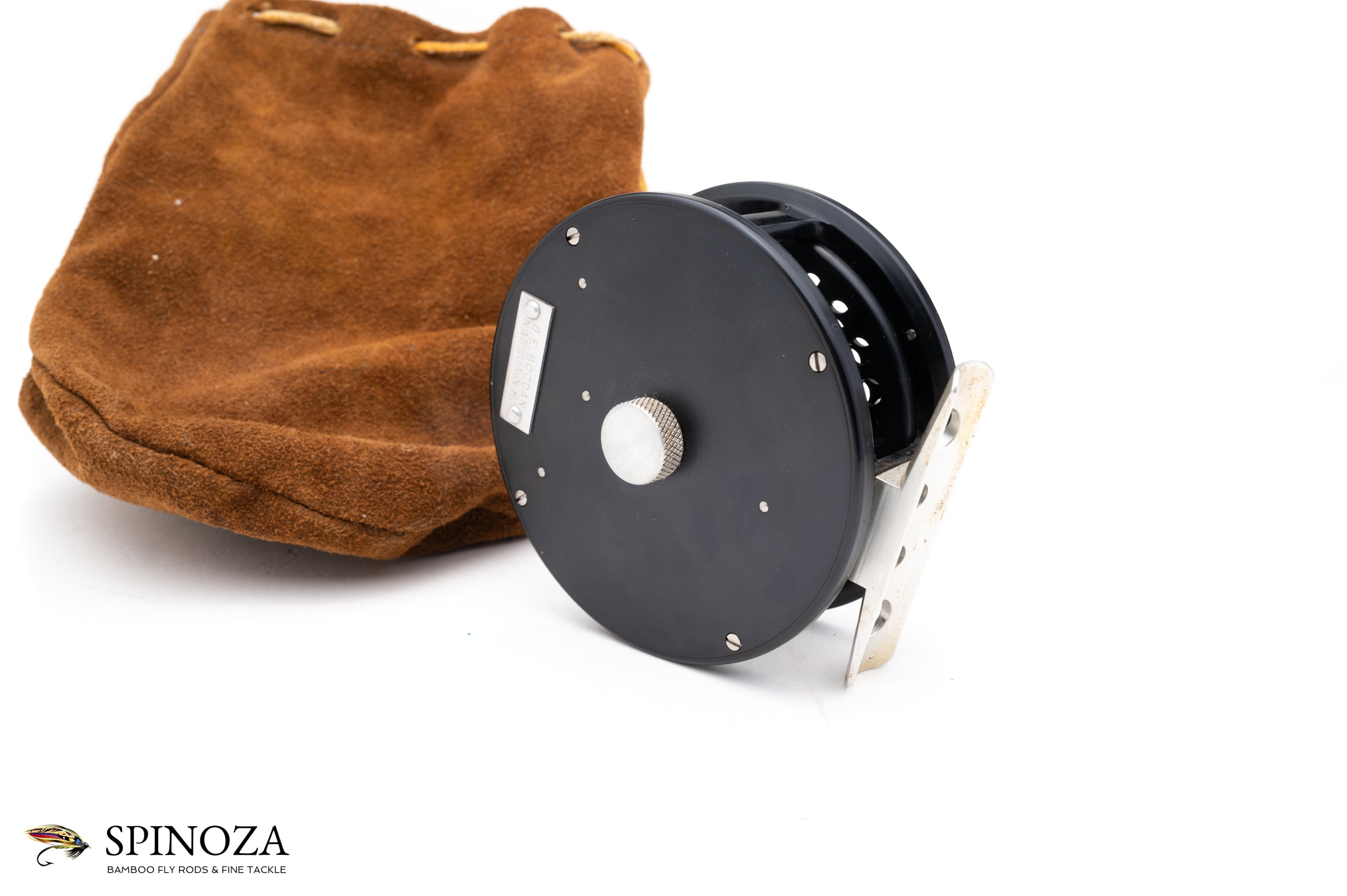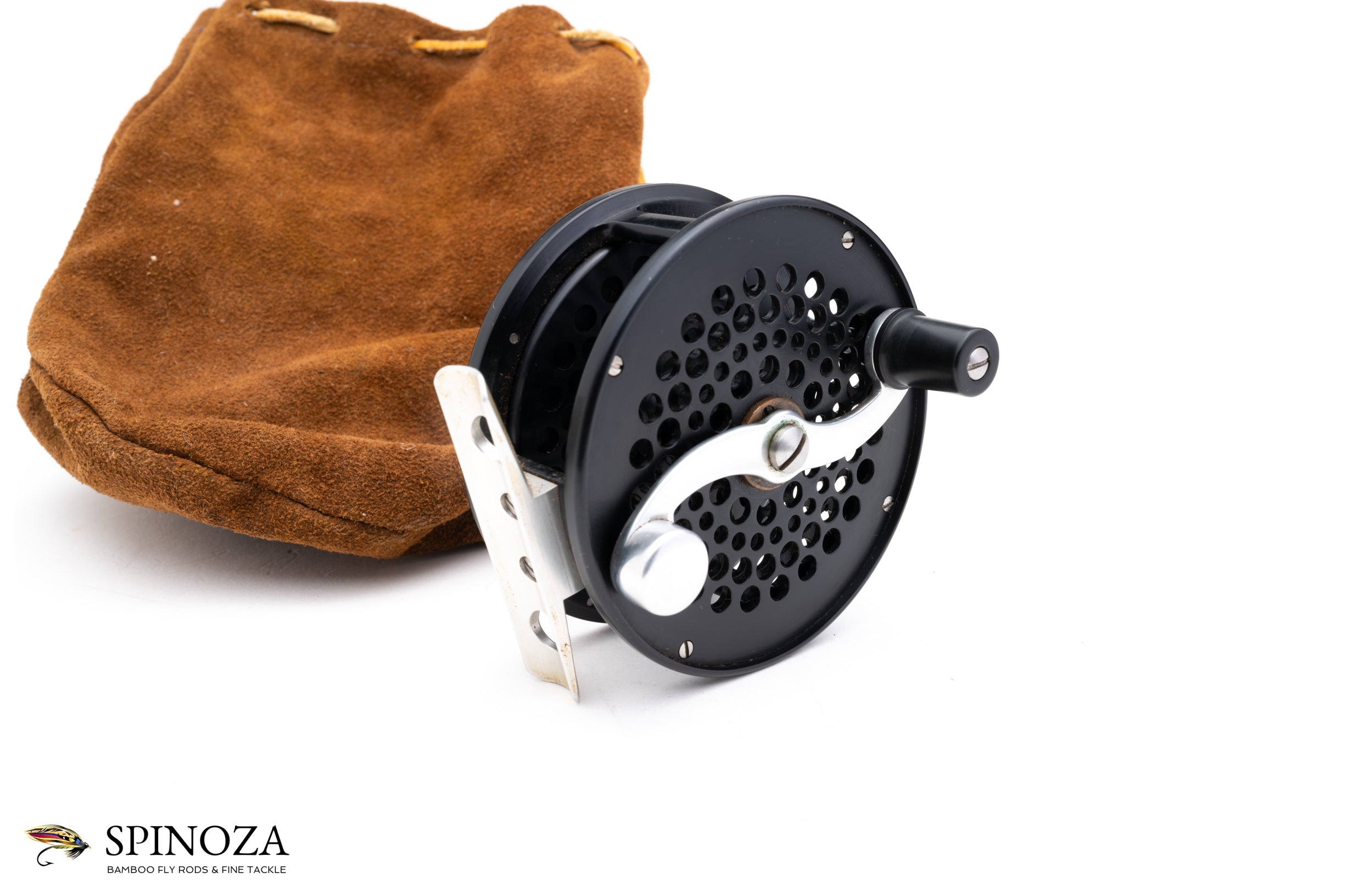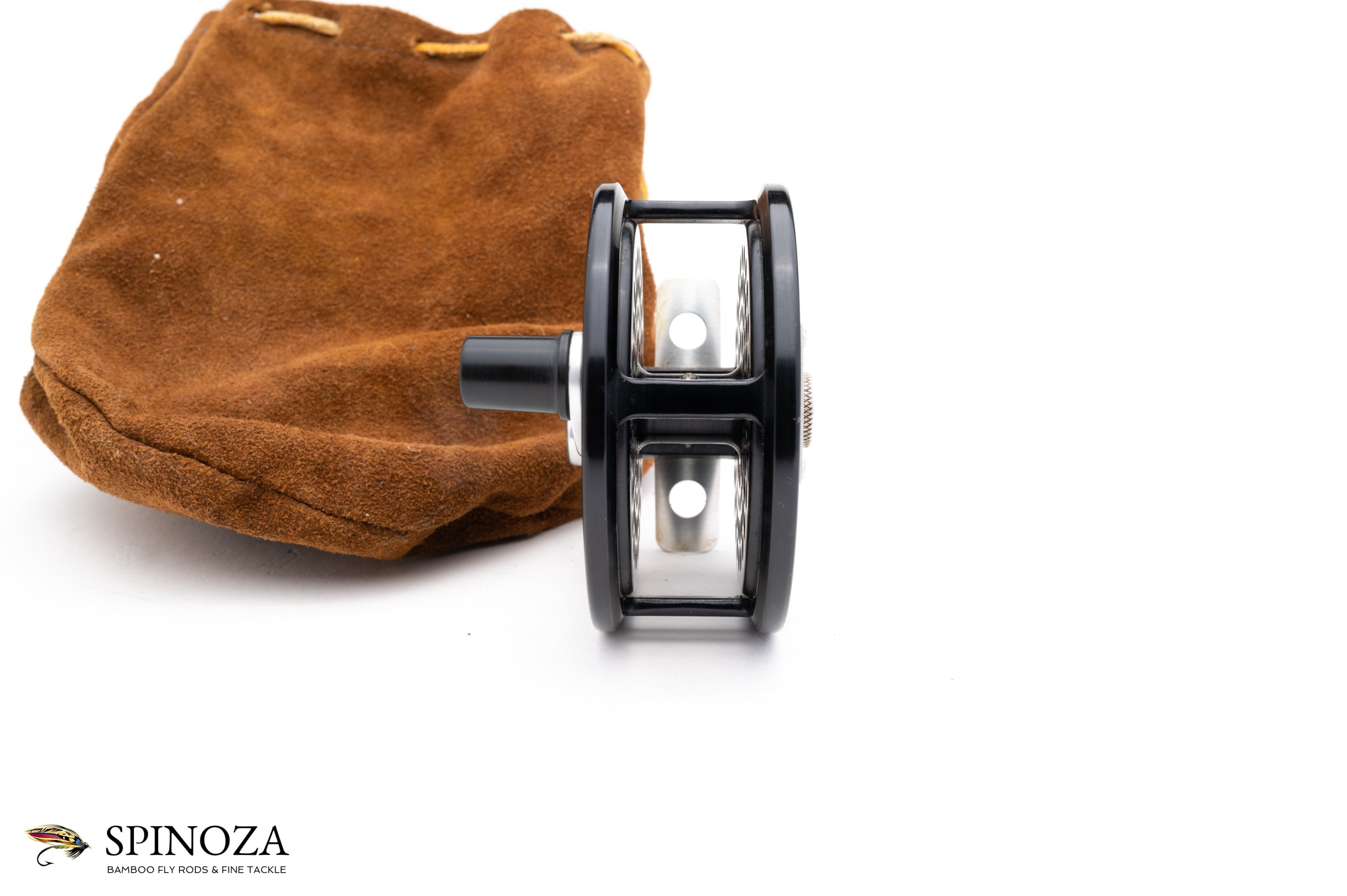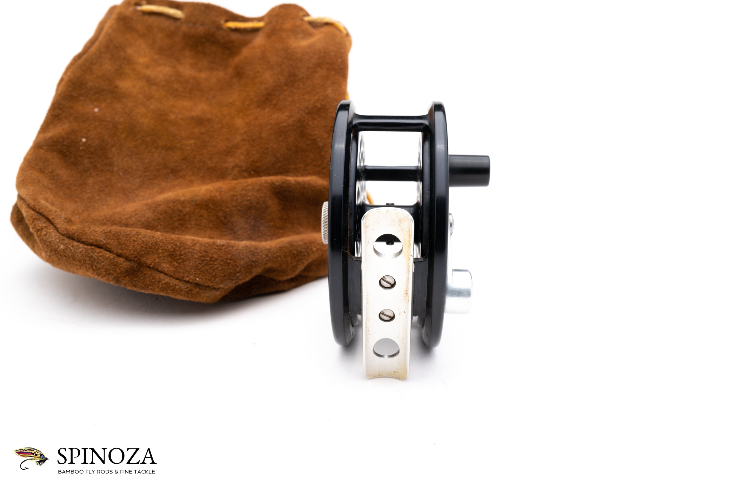 A great Bogdan Large Trout reel, set up for RHW. 3 1/4" in diameter with a 31/32" spool width. 5.5 ounces in weight and with capacity to hold lines up to a #7 with 50 yards of 20# backing. Excellent used condition with a tiny bit of rim rash on the frame edges, but little wear elsewhere. Click and pawl fixed drag. Black anodized frame, sideplates, and spool (the sideplate on the cranking side is ventilated, as are both sides of the spool). Silver aluminum foot, handle, oil port cover, and Bogdan nameplate. Comes in the original suede leather drawstring pouch.