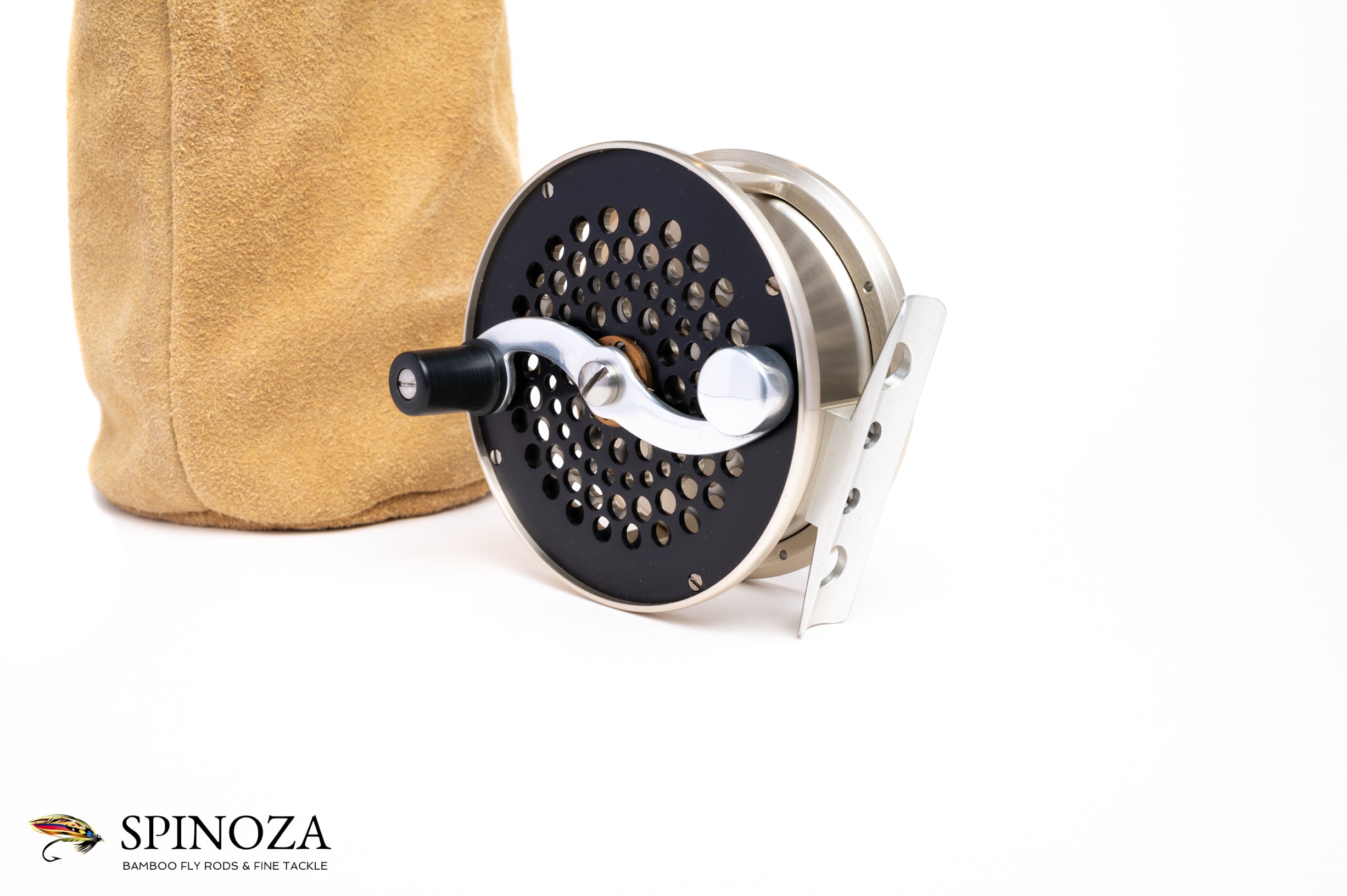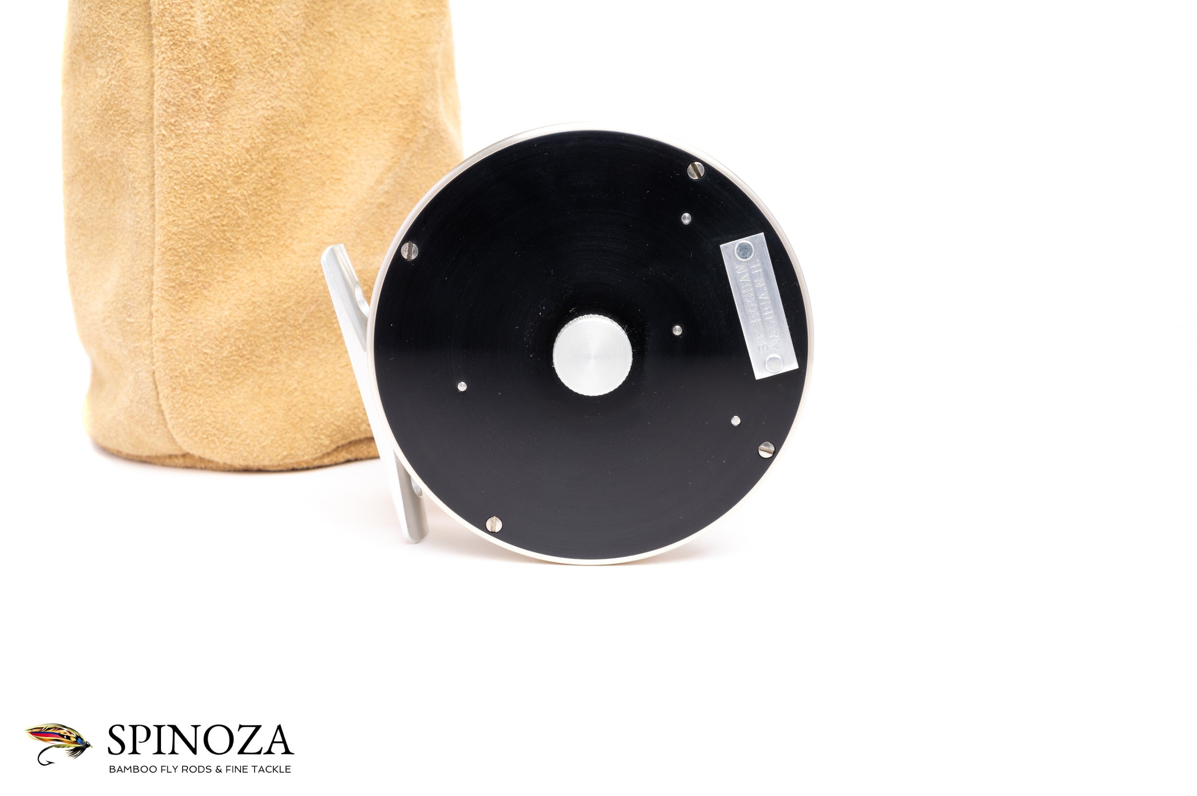 A nice Bogdan Large Trout reel, set up for LHW. 3 1/4" in diameter with a 31/32" spool width. 5.3 ounces in weight and with capacity to hold lines up to a #7 with 50 yards of 20# backing. Mint condition. There is one tiny "handling mark" on the frame edge but this reel has not been fished, with no signs of use including no mounting marks whatsoever on the foot. Click and pawl fixed drag with a nice pleasing click. Very light champagne frame and spool, with a silver anodized foot, handle, oil port cover, and Bogdan nameplate. Black anodized aluminum sideplates. The reel packs into a suede leather drawstring pouch.