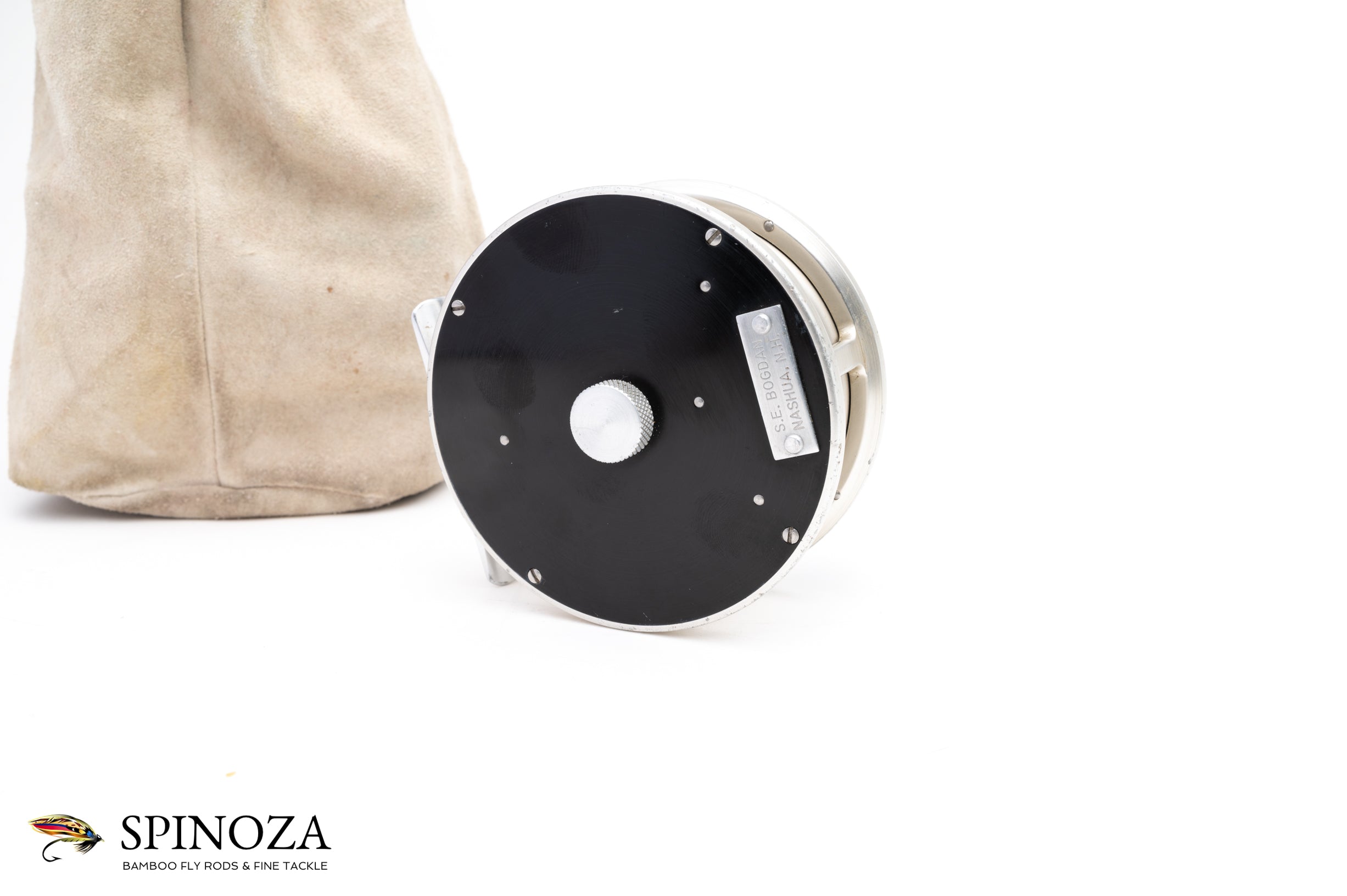 A great Bogdan Large Trout reel, set up for LHW. 3 1/4" in diameter with a 31/32" spool width. 5.5 ounces in weight and with capacity to hold lines up to a #7 with 50 yards of 20# backing. Good used condition with some fairly heavy rim rash on the frame edges, but little wear elsewhere. The original owner's initials "R.L.T." are engraved in block letters in the sideplate on the winding side. Click and pawl fixed drag with a nice pleasing click. Aluminum silver frame, spool, foot, handle, oil port cover, and Bogdan nameplate. Black anodized aluminum sideplates. Comes in the original suede leather drawstring pouch.